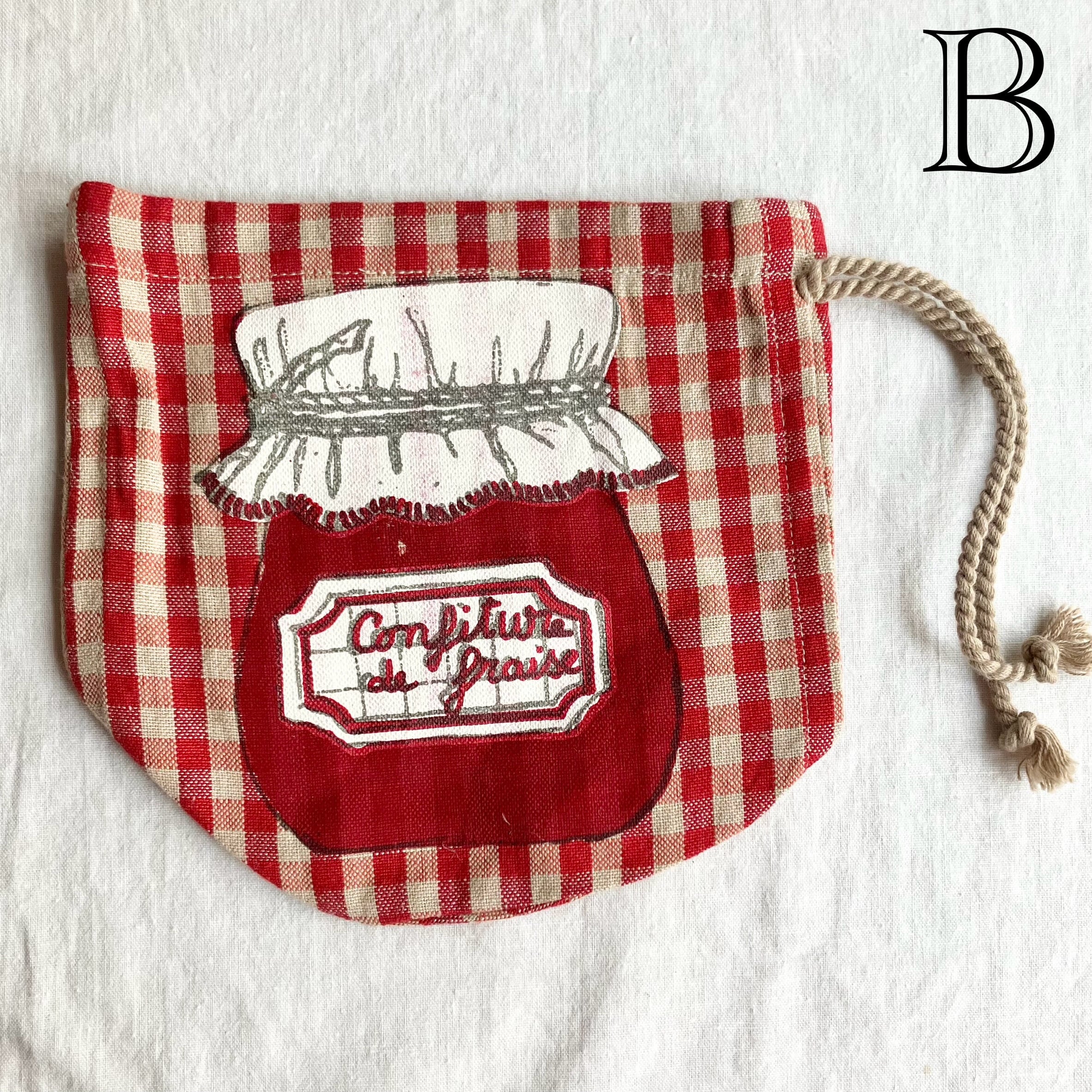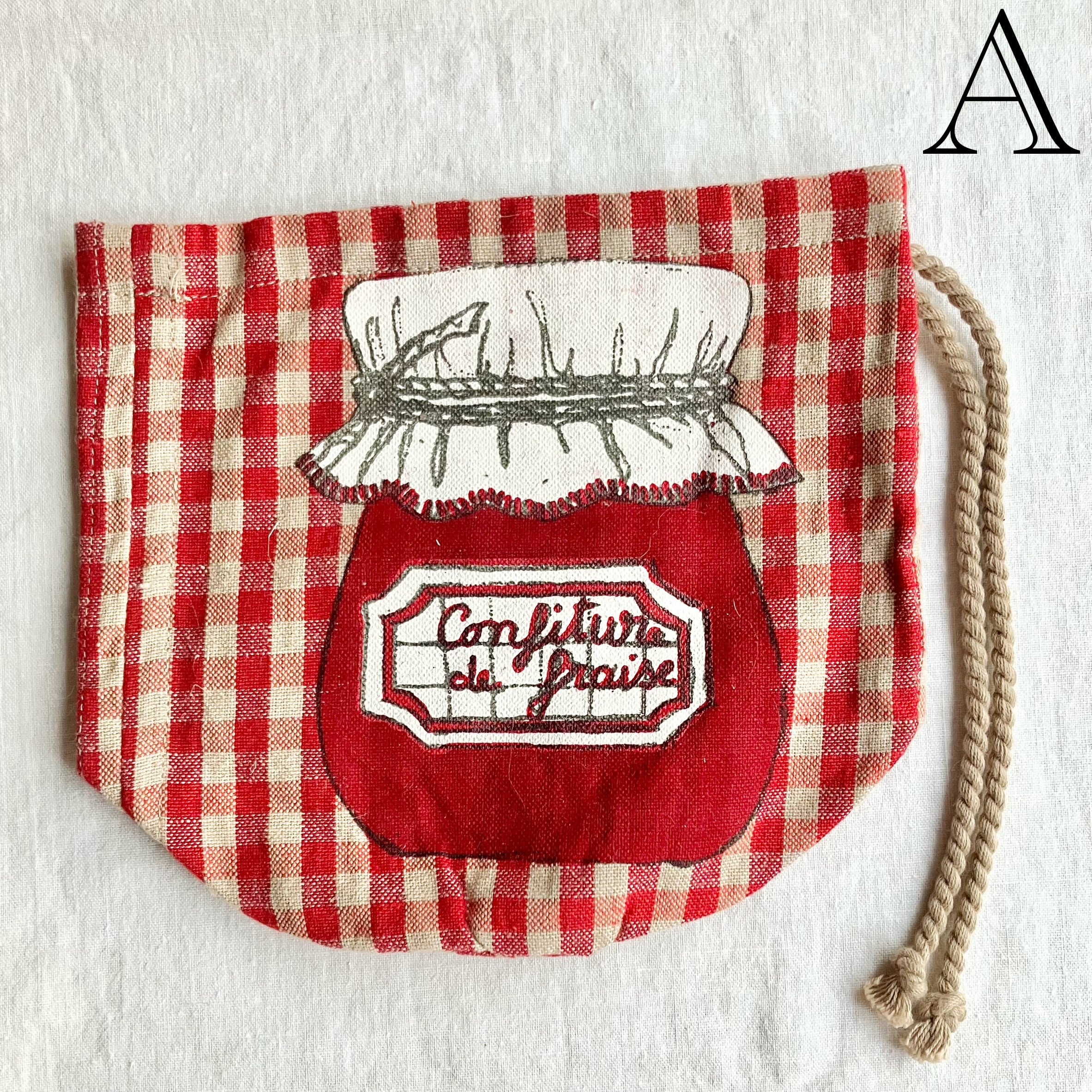 赤いチェック柄に、可愛らしいConfiture de Fraise『いちごのコンフィチュール』の瓶が描かれています。瓶にかけられた白いクロスなどもフランスらしくてとても可愛いです。