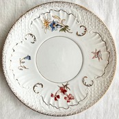 美しい白地に、愛らしい小花がぐるりと描かれています。縁は見事なラティスやロカイユ、波模様のレリーフ装飾で美しく飾られています。