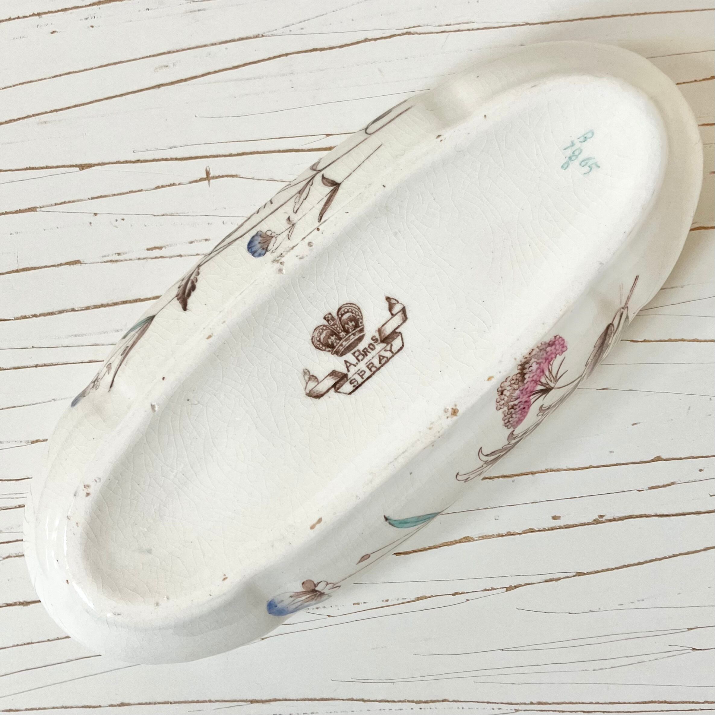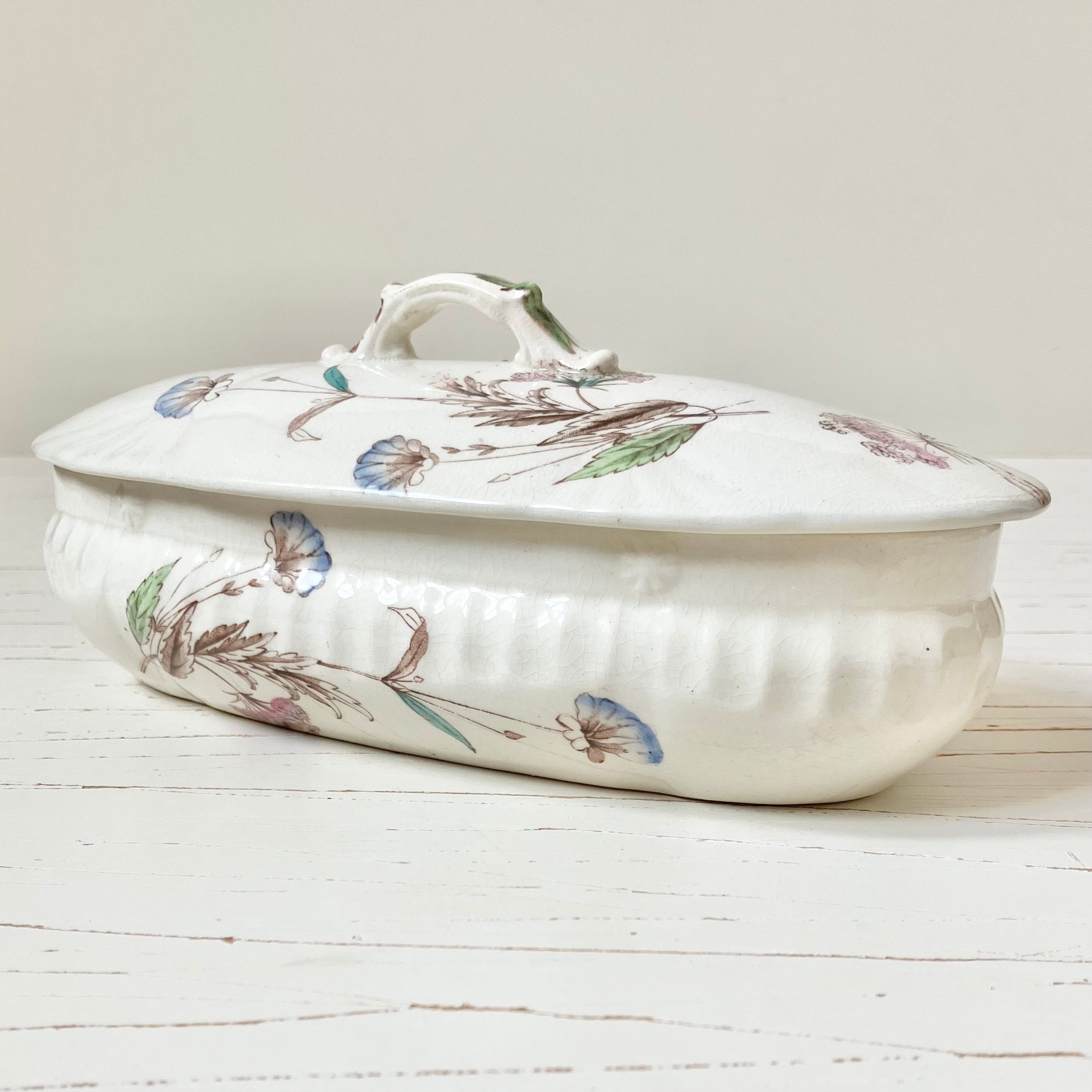 しっとりやわらかい乳白色に、愛らしいピンクやブルーで彩られたたくさんの野花が描かれています。全体はゆるく波打つデザインや小花のレリーフで美しく飾られています。