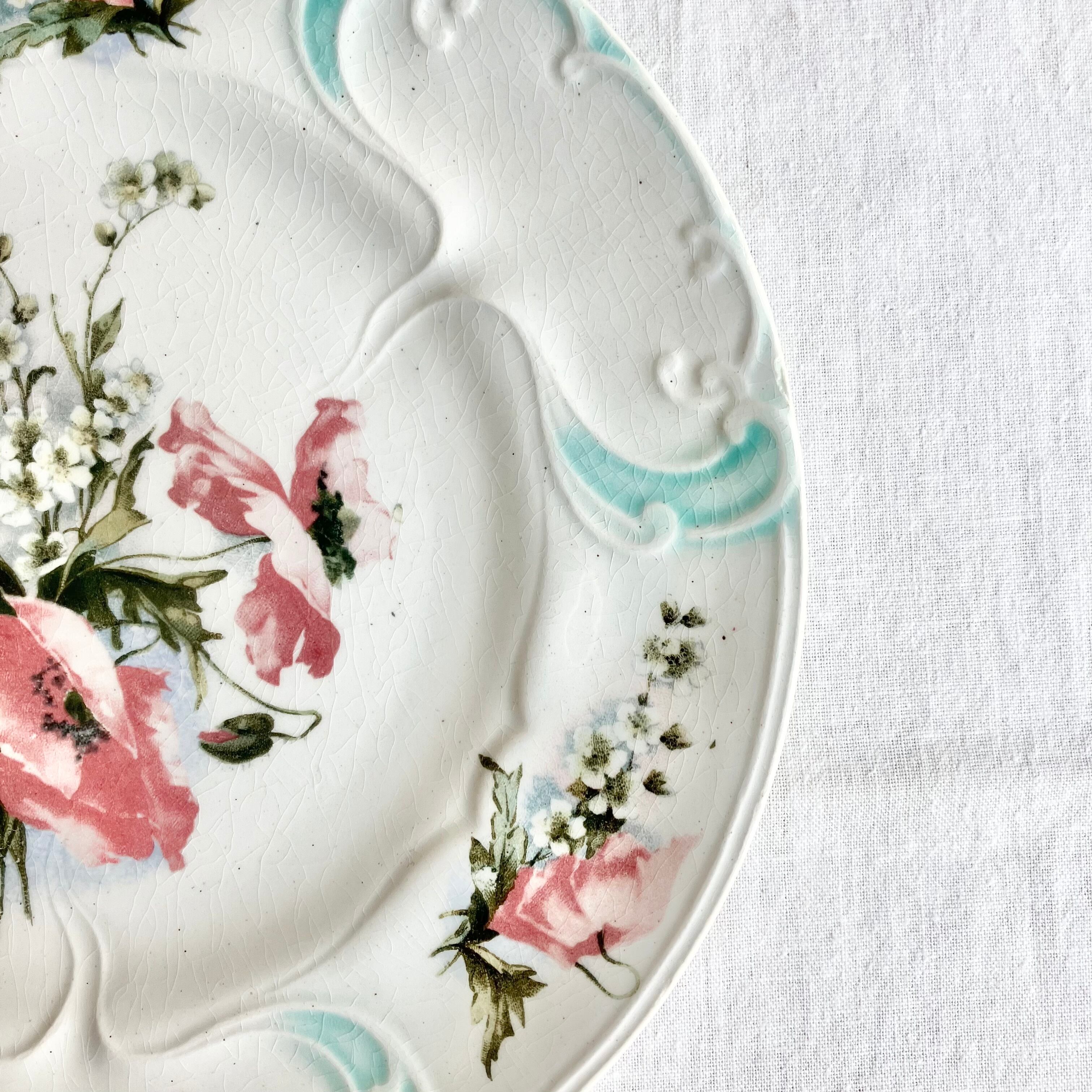やわらかな白地に描かれているには、とても可憐な白い小花と、やさしい赤色のポピーの花。縁には透き通るような美しいアクアブルーと波打つロカイユレリーフが飾られた、大変美しいプレートです。