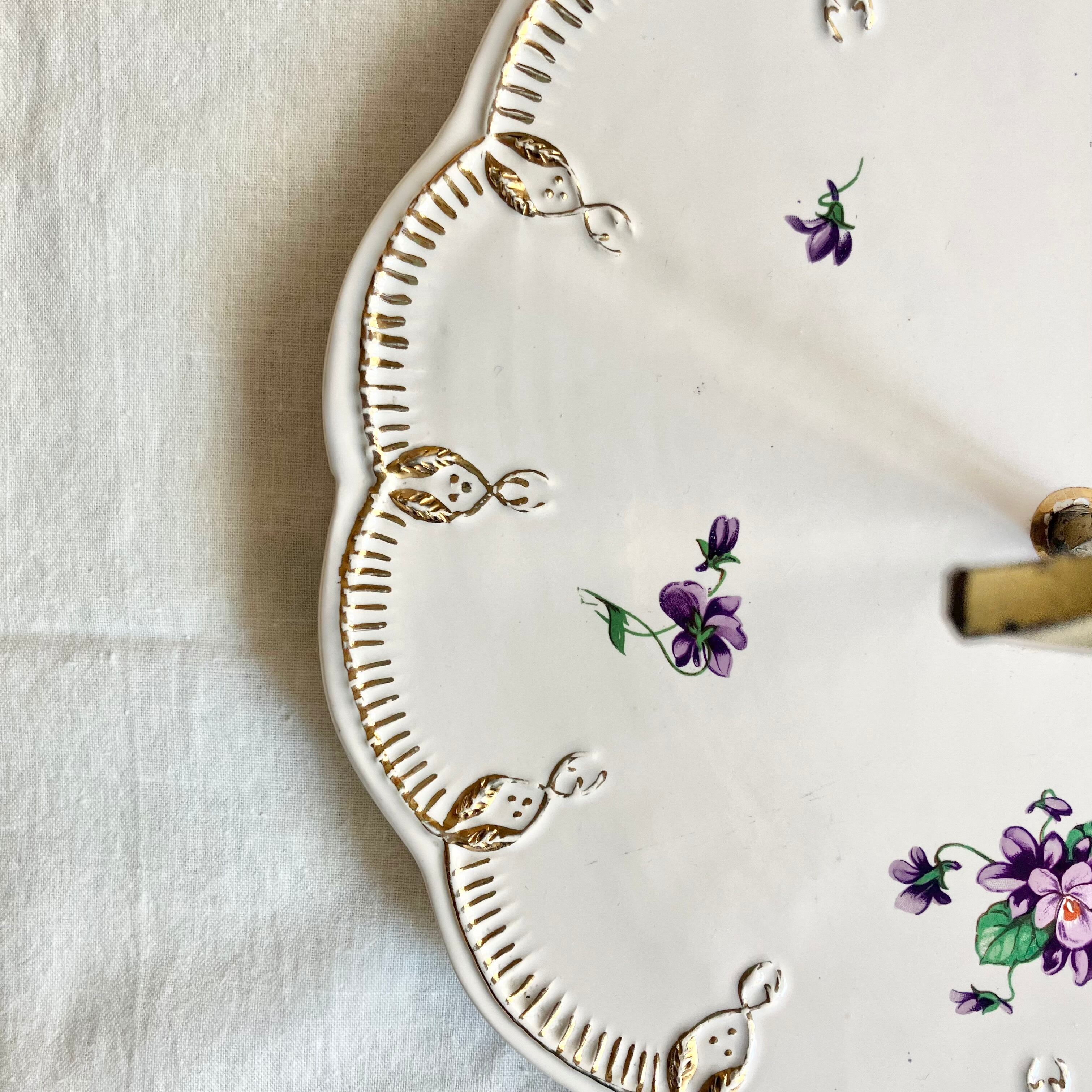 金属の持ち手のついた厚みのある陶器プレートに、可愛らしいスミレの花が散りばめられ、フラワーリムの縁はゴールドのレリーフで美しく飾られています。