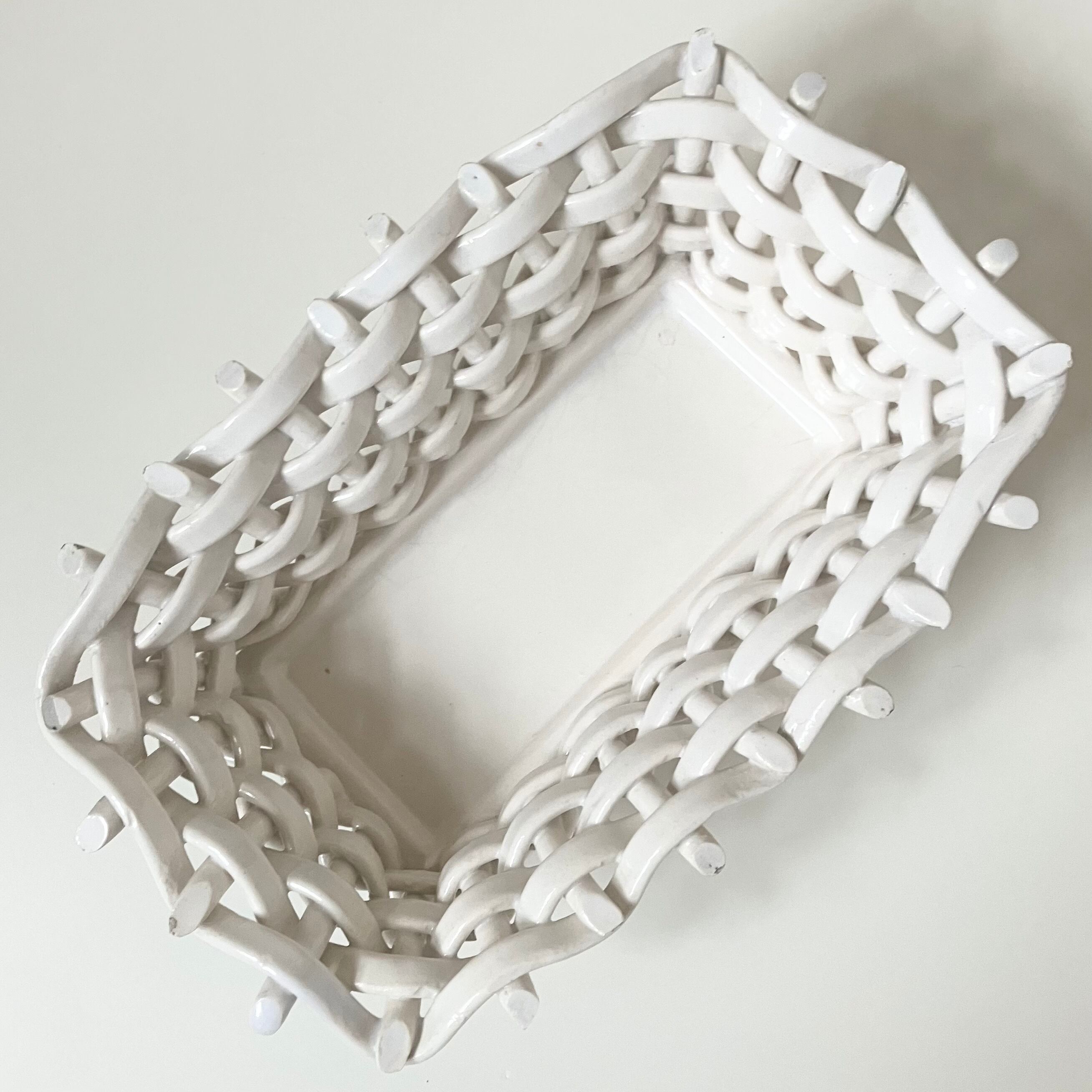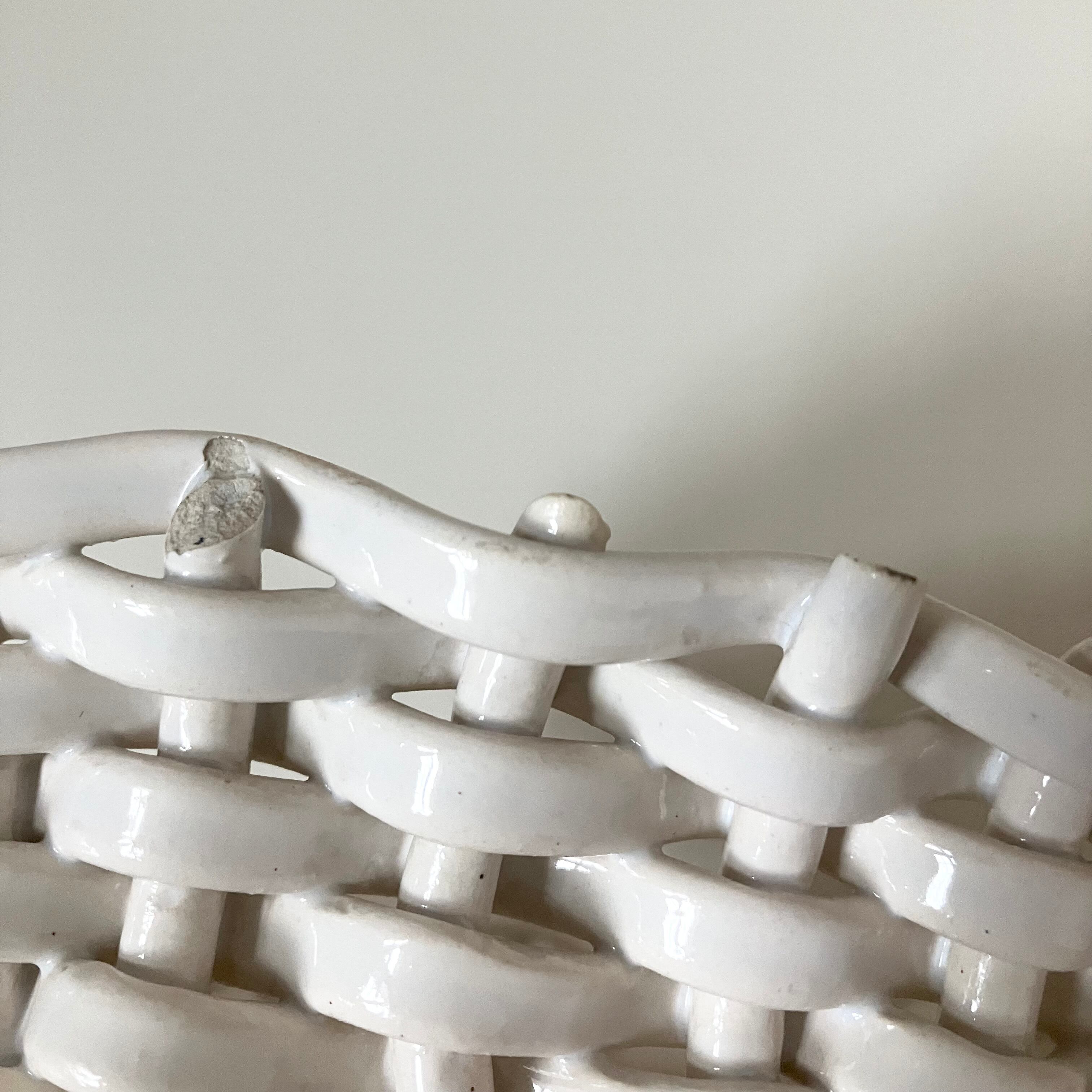 白釉の陶器で美しく編まれた籠に、ロカイユレリーフの施された脚がついています。