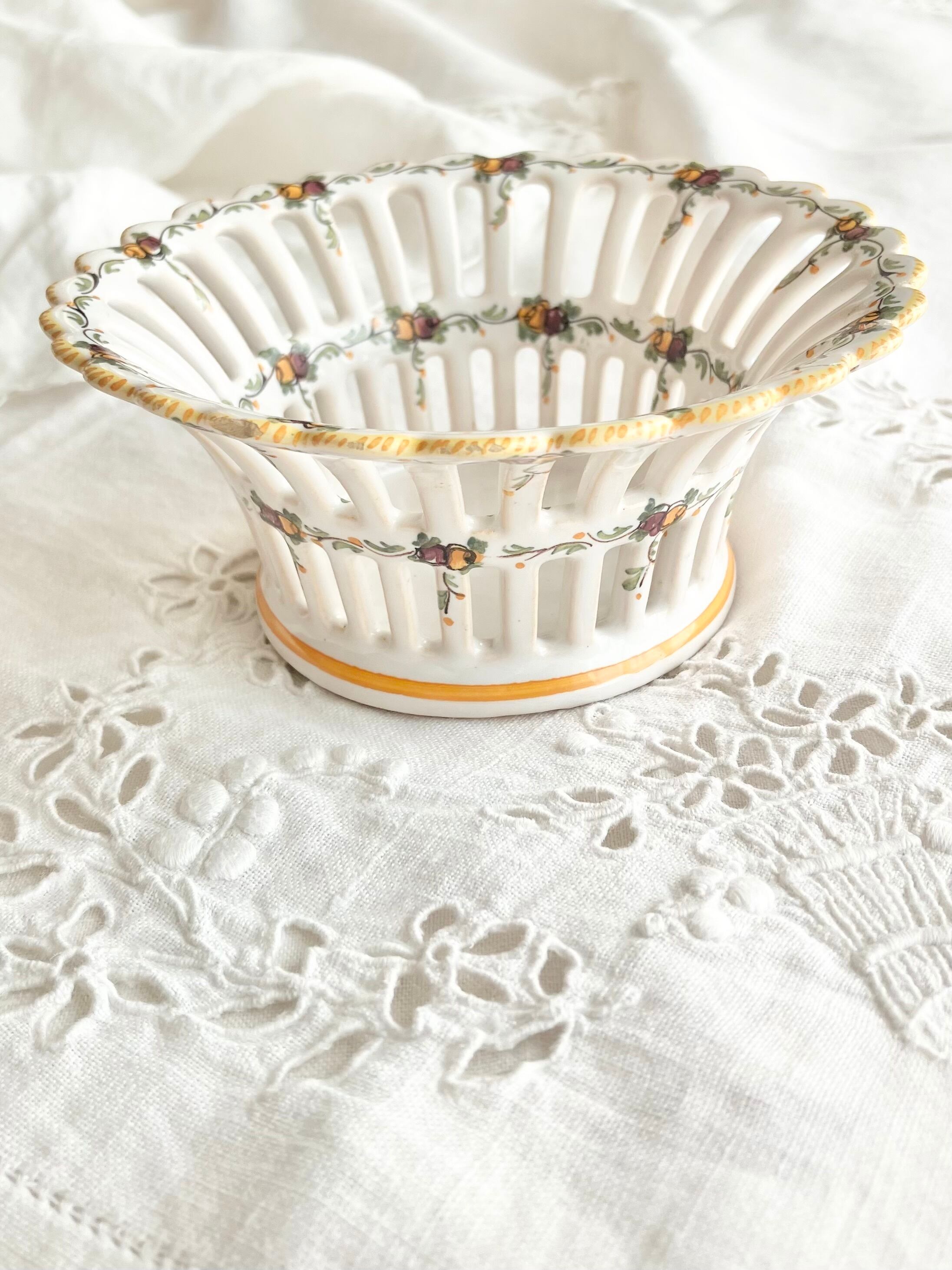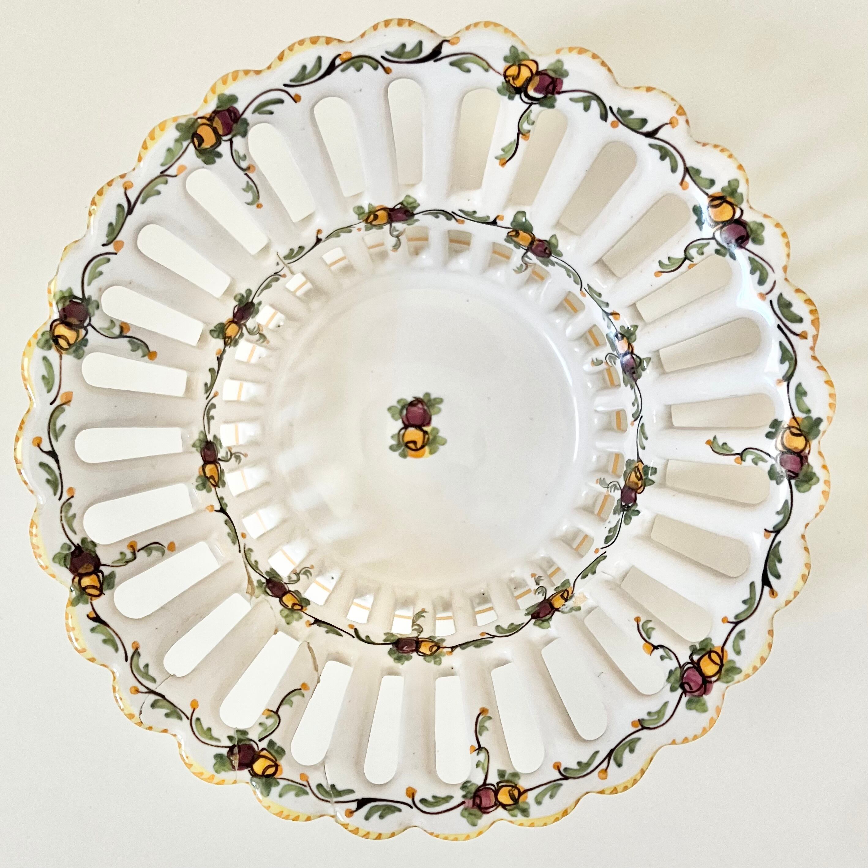 やわらかな白地にオレンジと赤色で、可愛らしい小花のガーランドが繊細な透かし装飾の花籠レリーフ全体を飾るように描かれています。