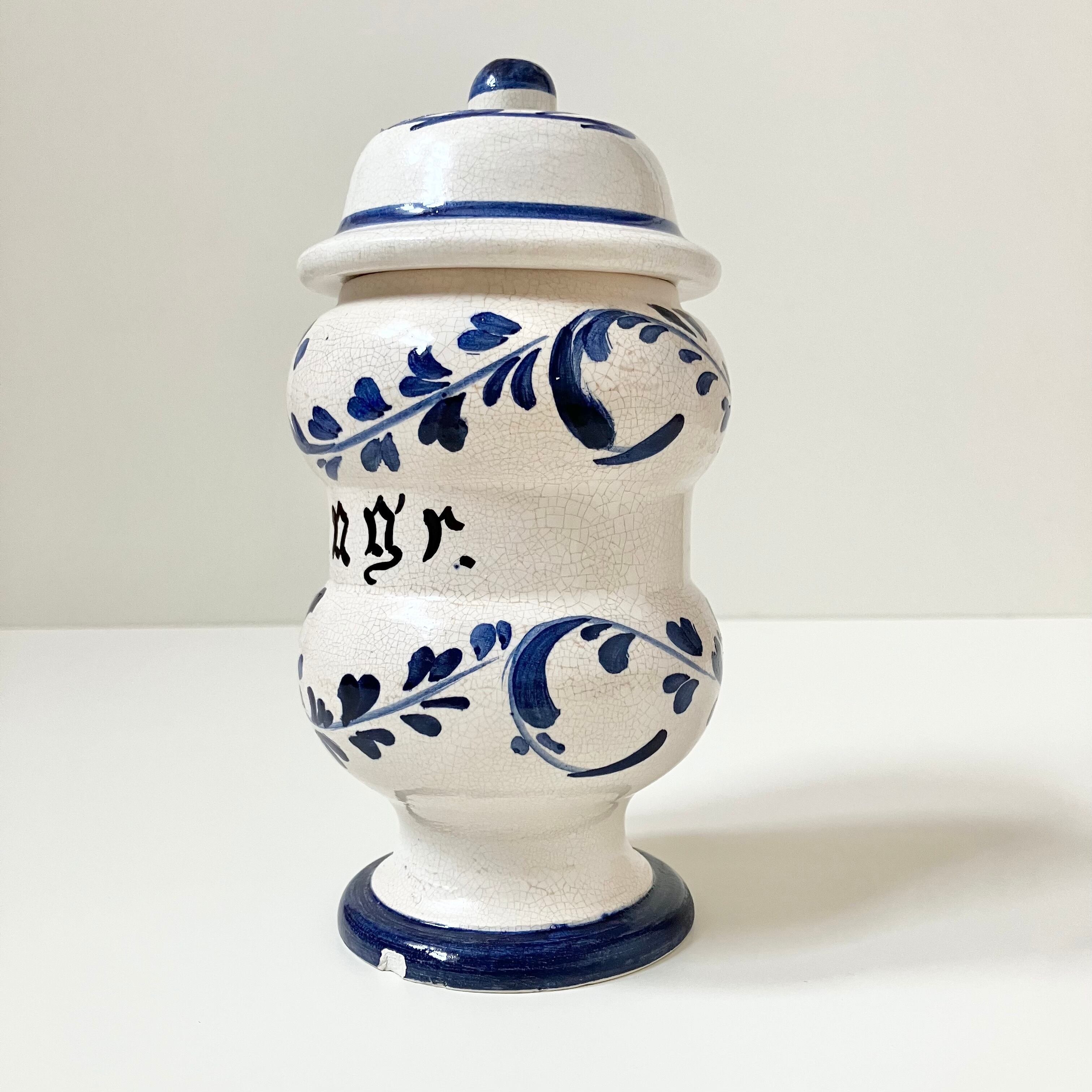 美しい乳白色に、ブルーで草花のロカイユ模様が描かれ、イタリア語でDimagr『痩せ薬』と表記されています。