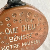 銅部分に“Que dieu benisse notre maison”『私たちの家に神の祝福がありますように』とフランス語で記されています。その周りには小花が散りばめられていて、とても可愛らしいデザインのフライパンです。