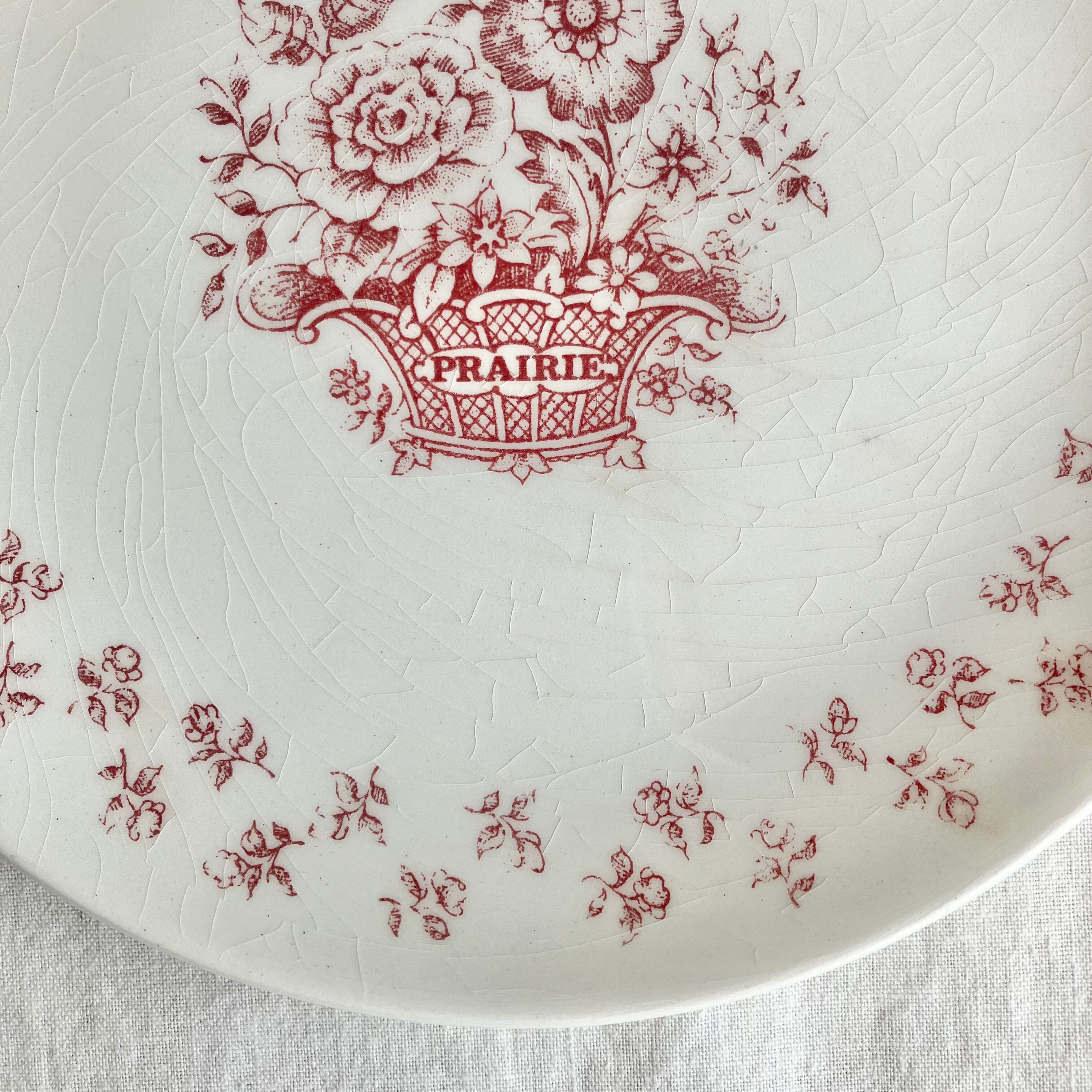 白地に赤色で、美しいローズの飾られた可愛いパニエが描かれています。パニエにはフランス語でPRAIRIEというシリーズ名が記され、縁には愛らしい小さなバラがたくさん散りばめられています。