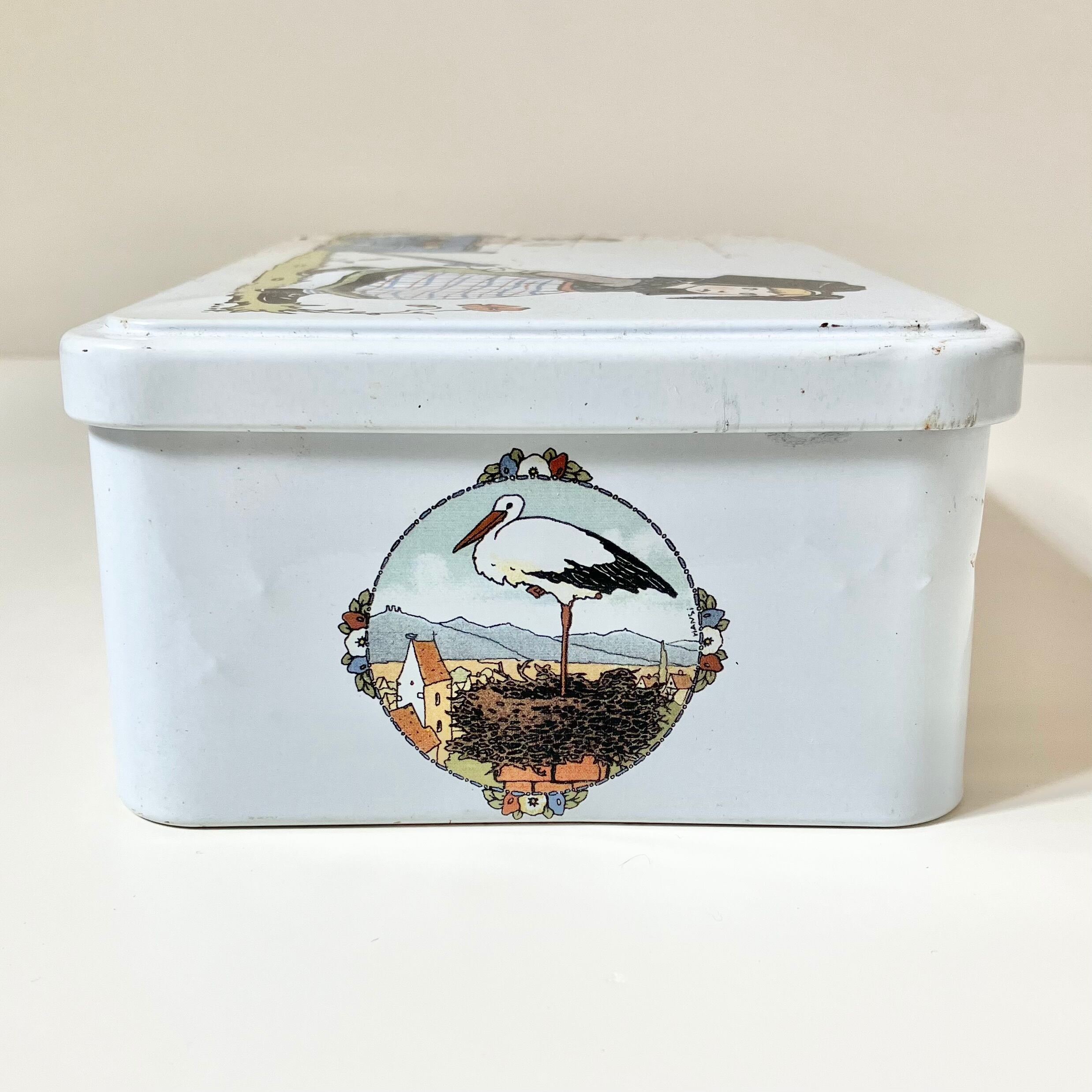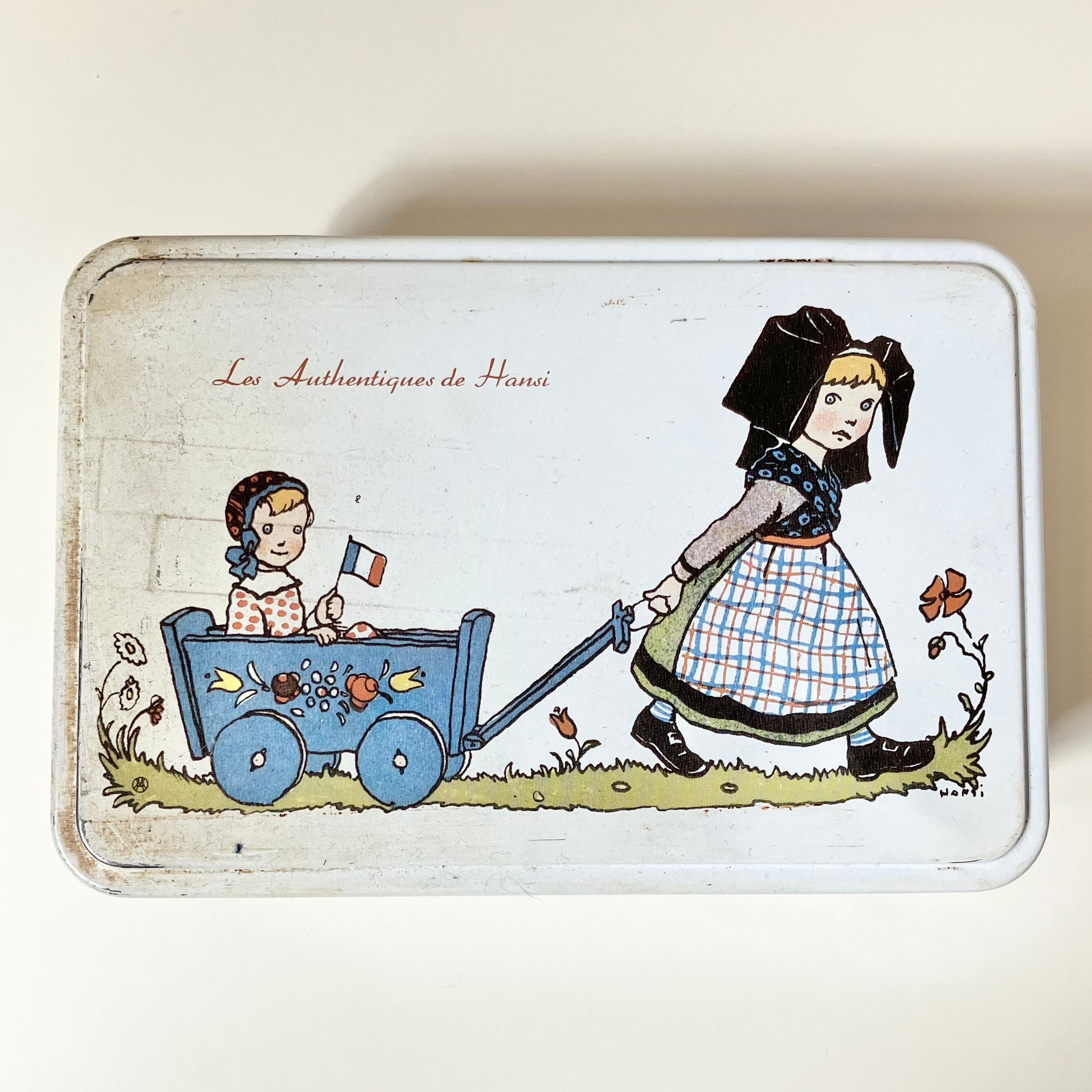 Massillyのクッキー缶にはアルザスの伝統衣装を着た女の子たちが遊んでいる様子が描かれています。側面にはアンデルセン童話の『コウノトリ』の歌を合唱している子どもたちや、アルザスの街並みとコウノトリが描かれています。