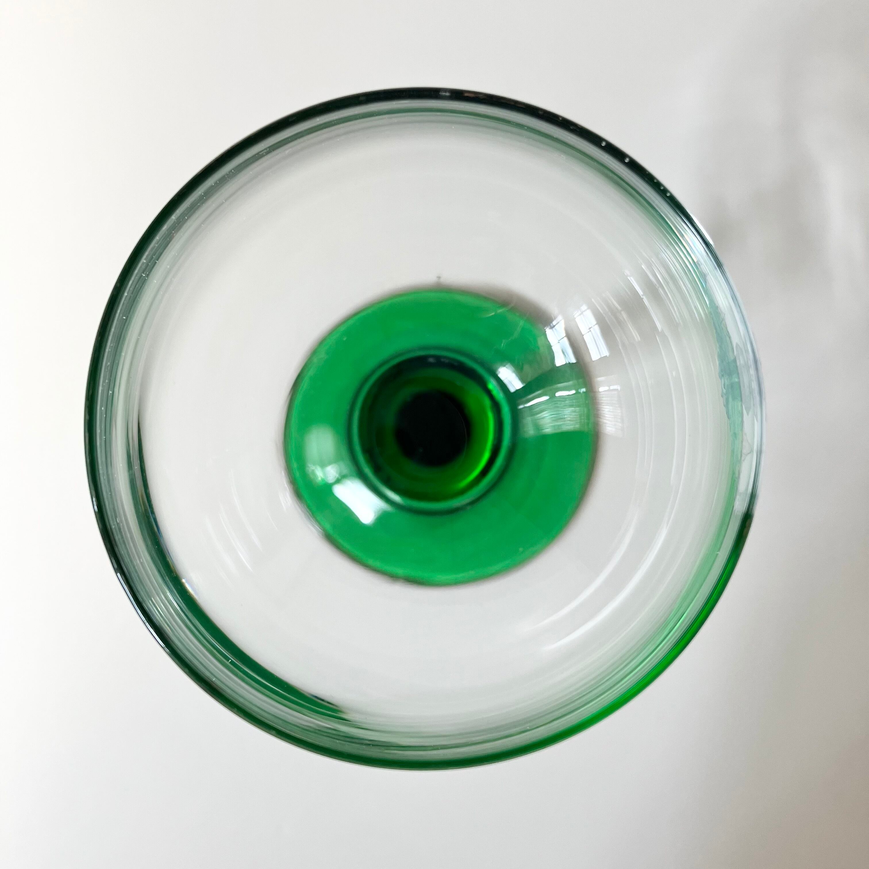 アルザス伝統のグリーンの細長い脚が美しいワイングラスに、Hansiデザインの可愛らしい男の子と、アルザスの街並みが描かれています。