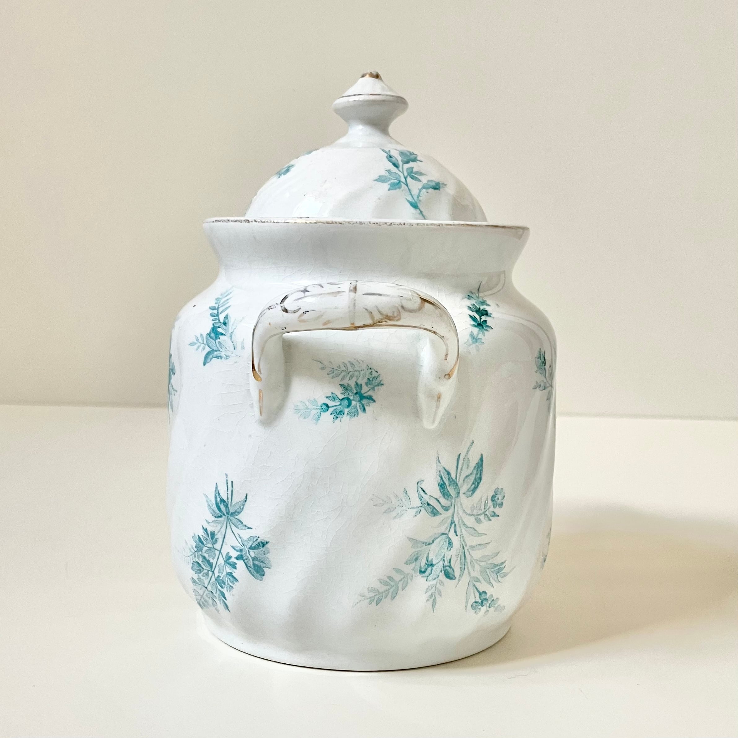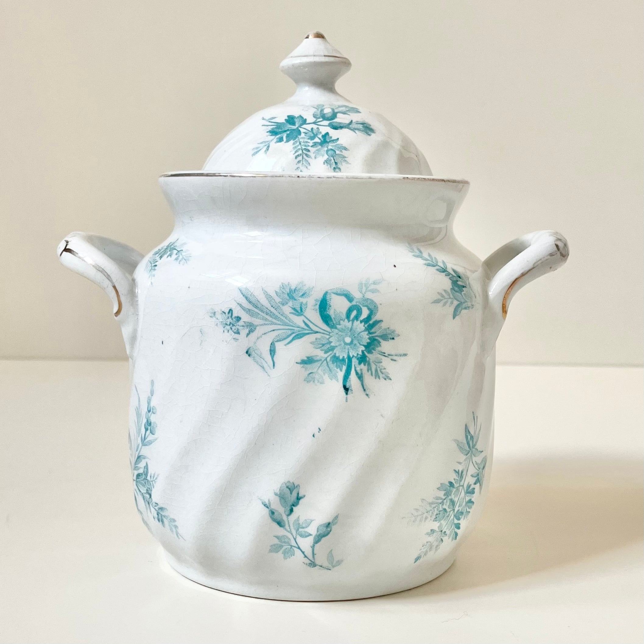 白地に美しいアクアブルーで、バラやチューリップなどの愛らしい花々が全体に散りばめられています。ボディはゆるやかに波打ち、持ち手はゴールドと可愛い葉っぱのロカイユで飾られた、たっぷりサイズのポットです。