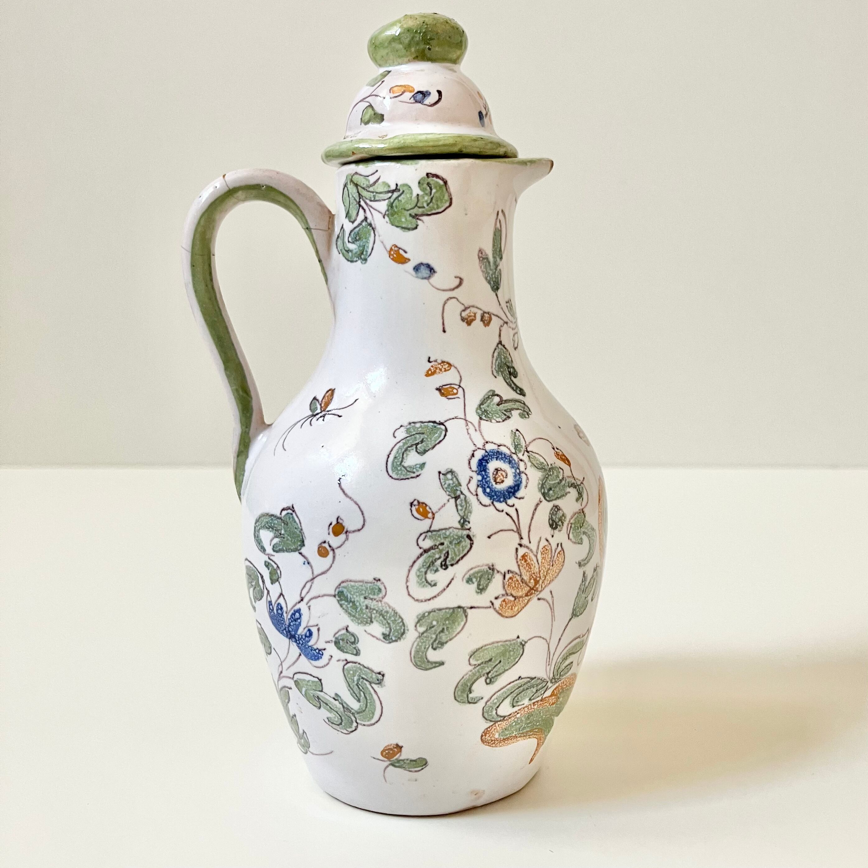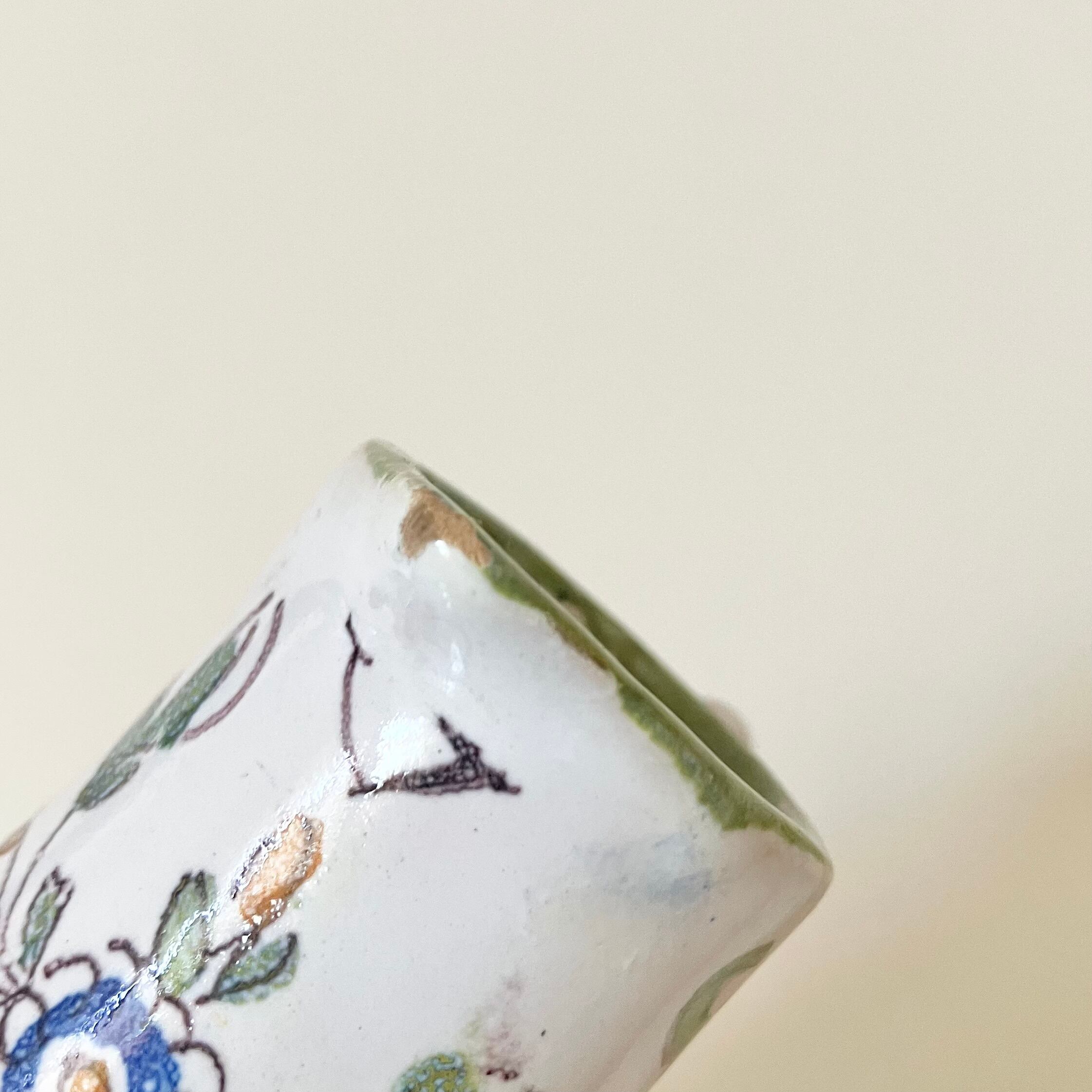 やわらかなぽってりとした釉薬に、ムスティエらしいオレンジの鳥や草花が全体に描かれています。所々に乗せられたやさしい抹茶グリーンがとても可愛いくて良い色味です。