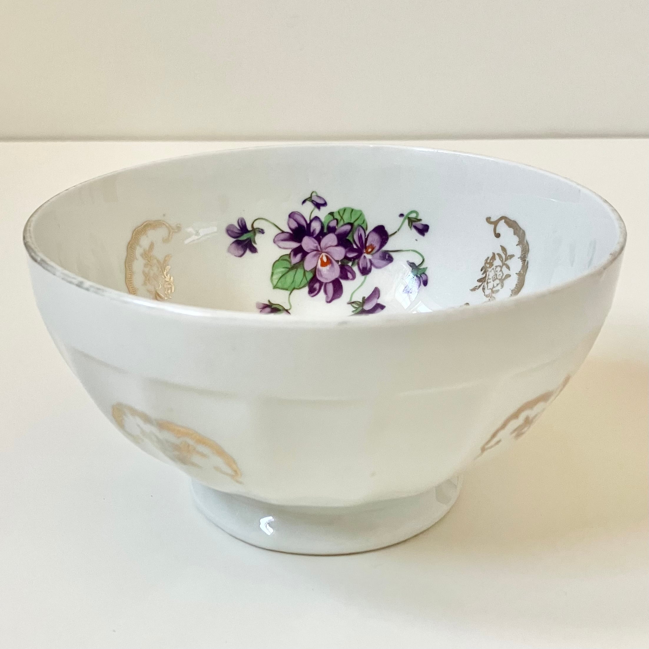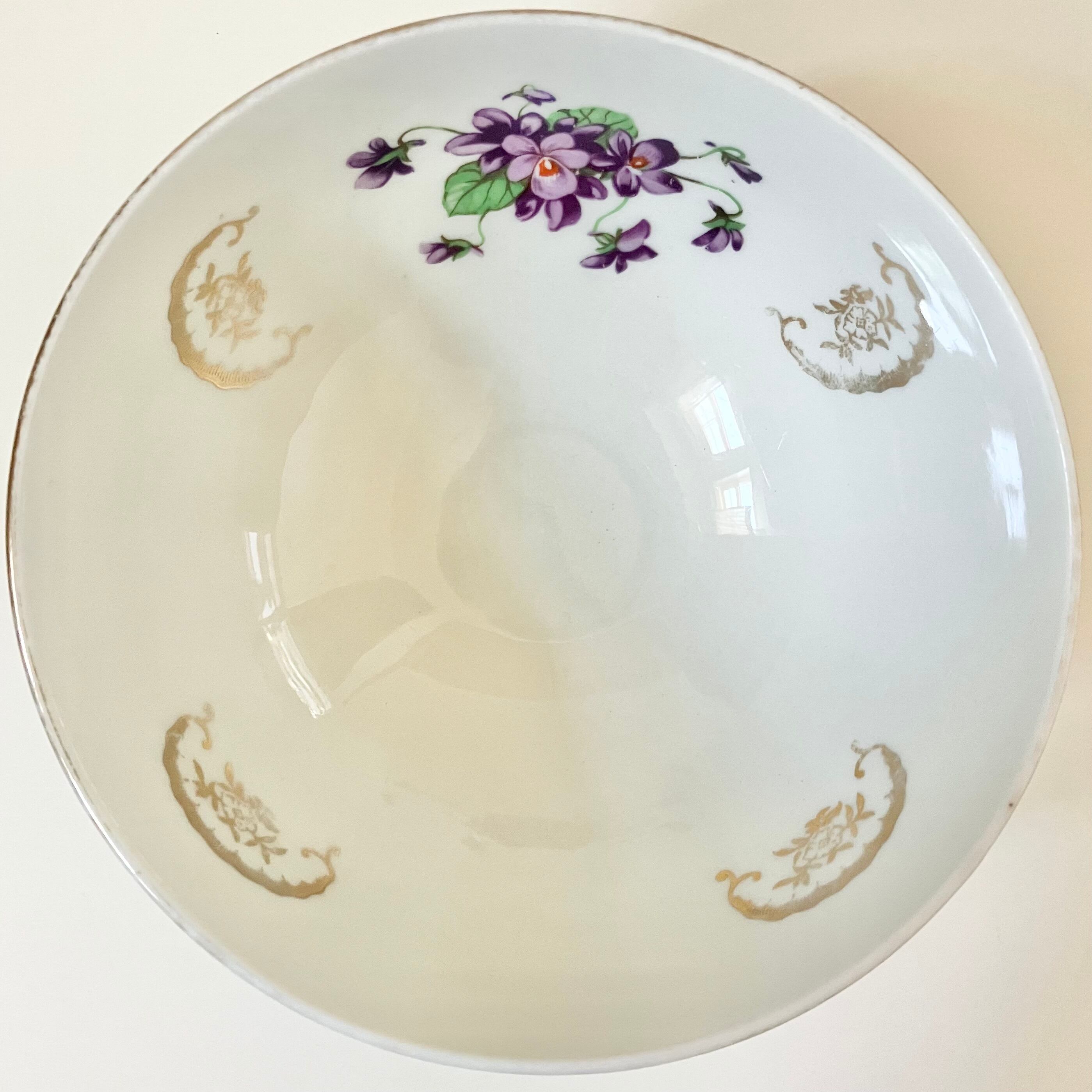 内側に大きく可愛らしいスミレの花が描かれています。まわりにはゴールドのロカイユと小花が飾られており、大変美しい一客です。