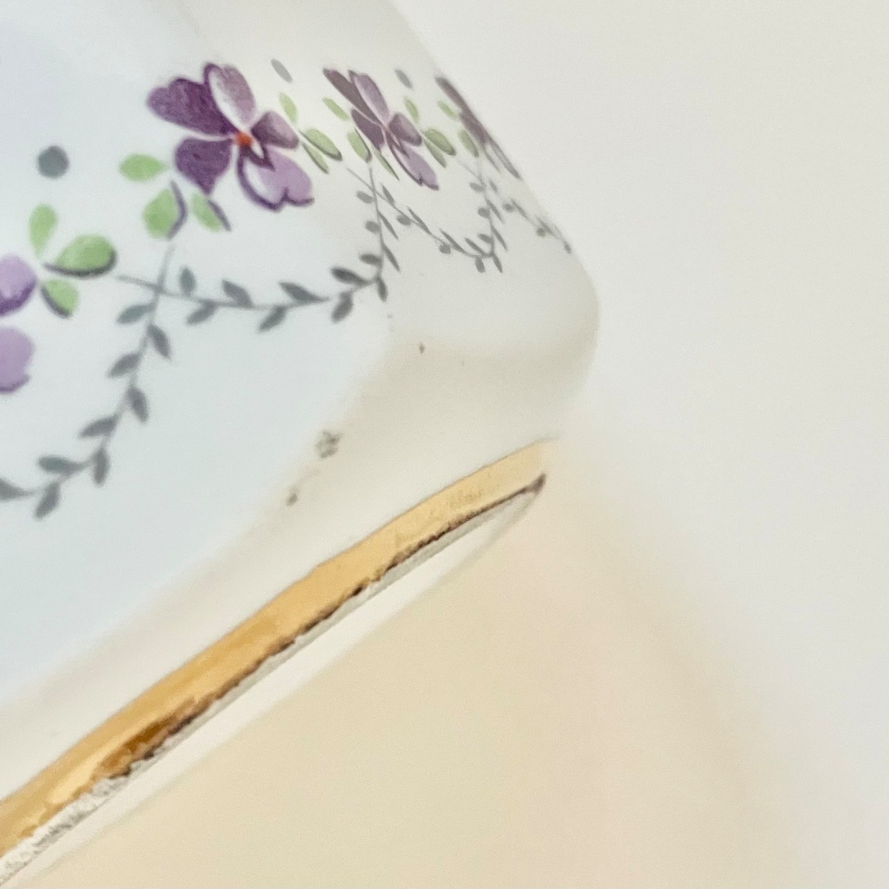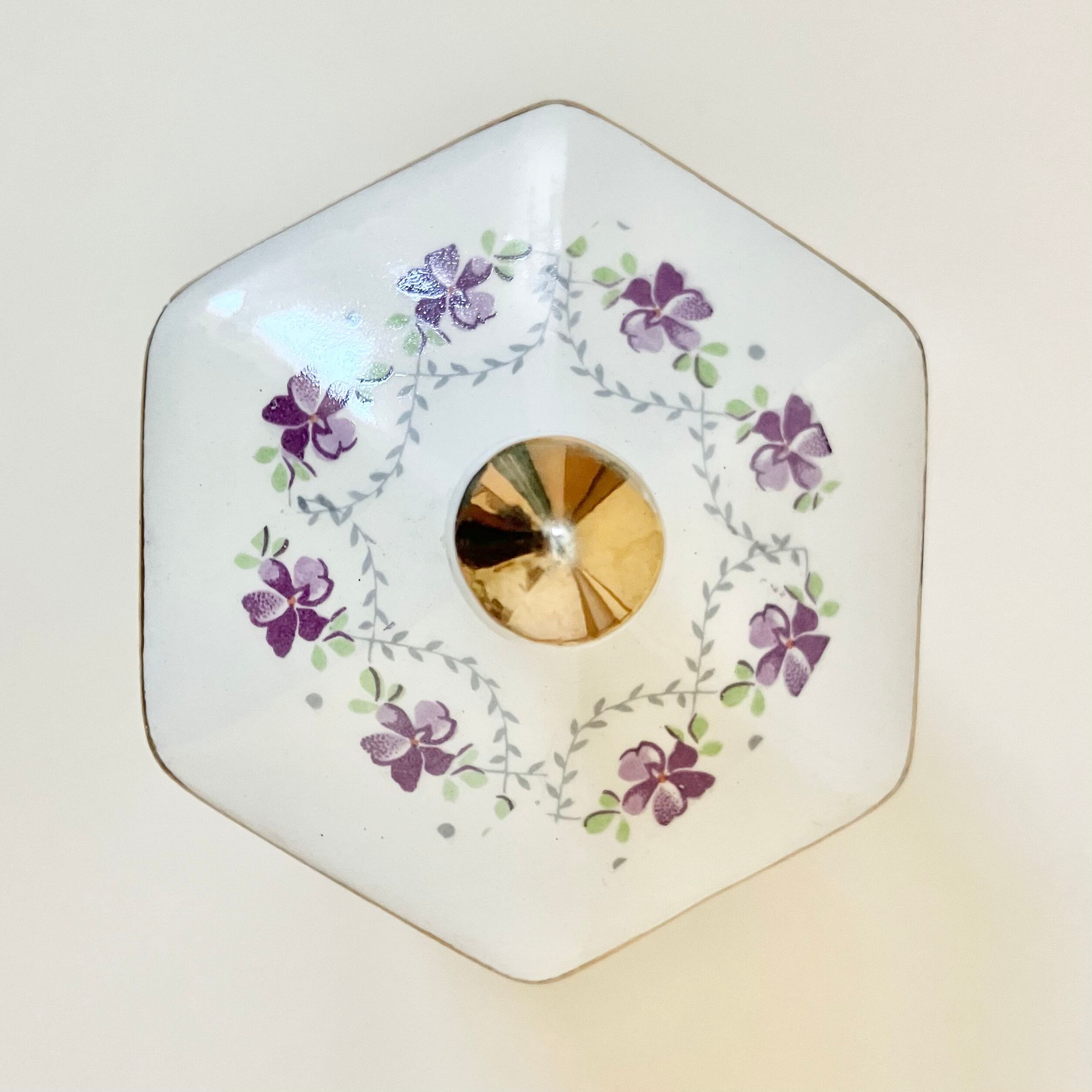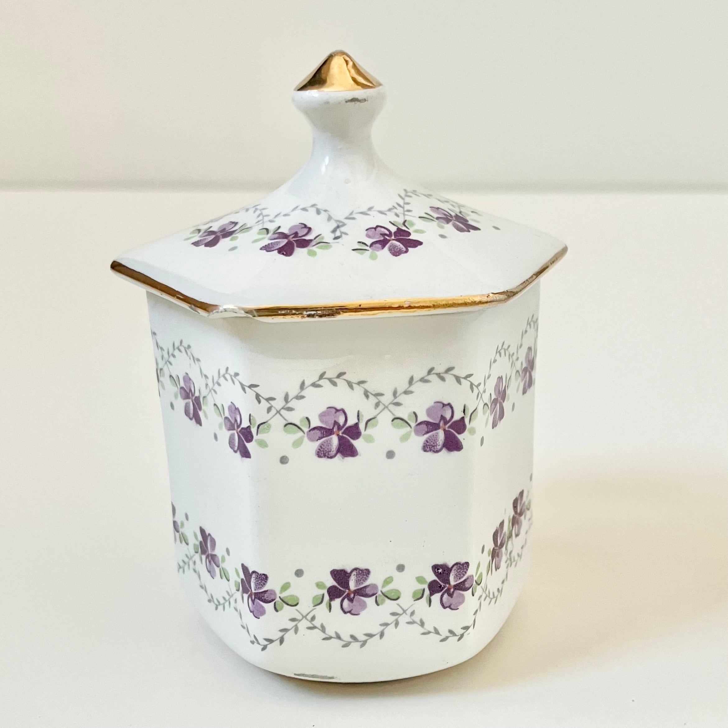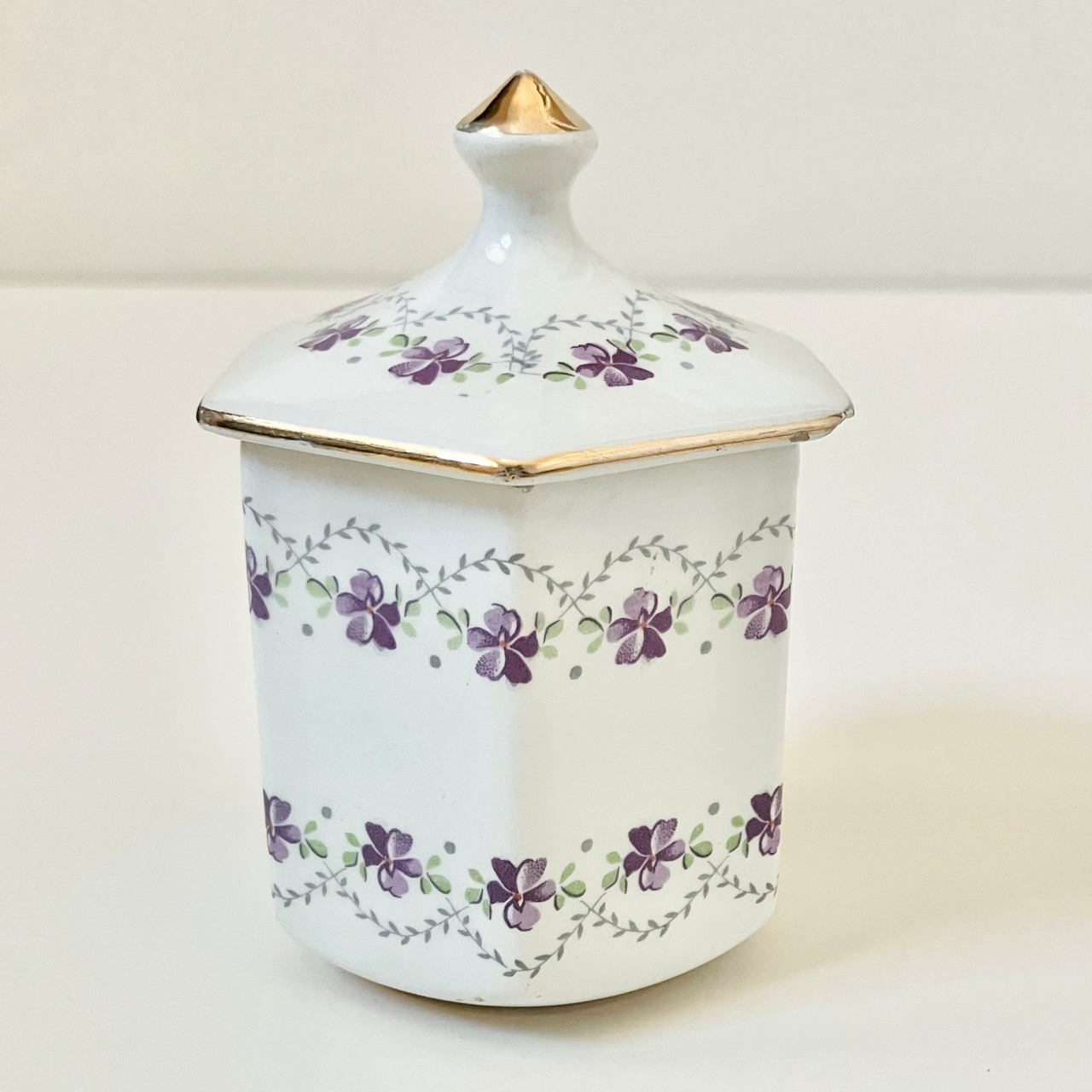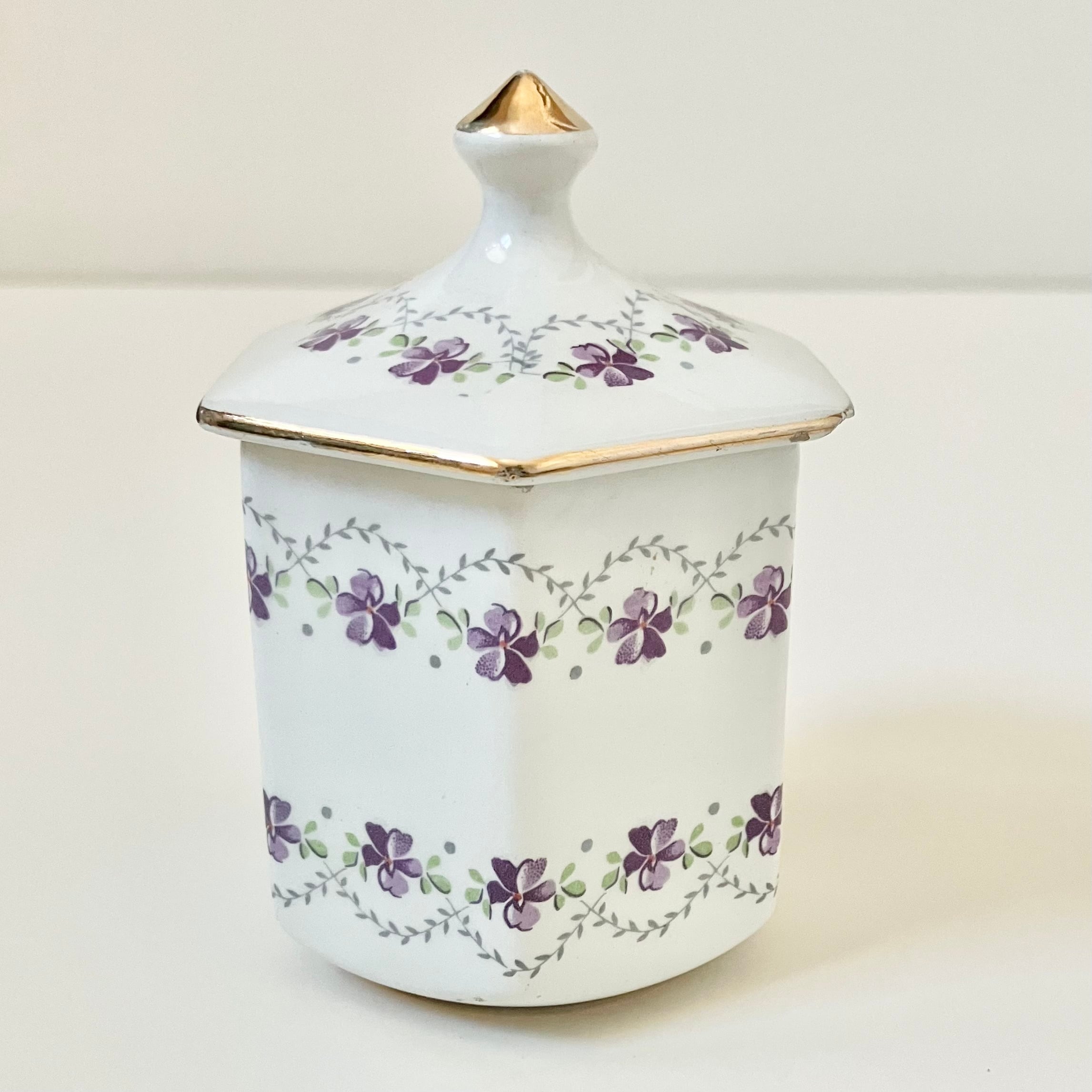 白地やさしい色合いで小さなスミレの花のガーランドがぐるりと飾られています。六角形のかたちや、ちょこんとした摘みのフォルムが、とても可愛らしいポットです。