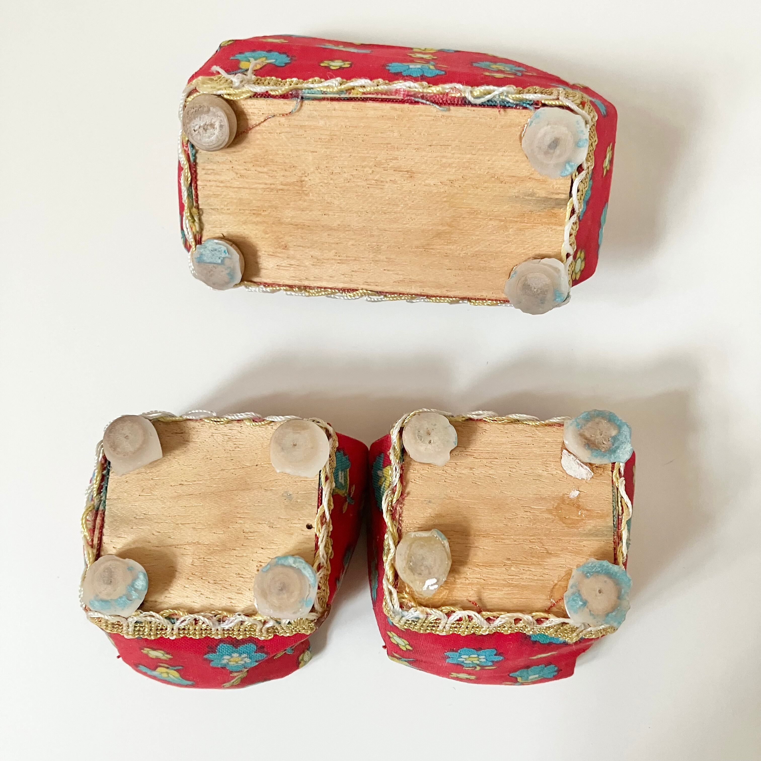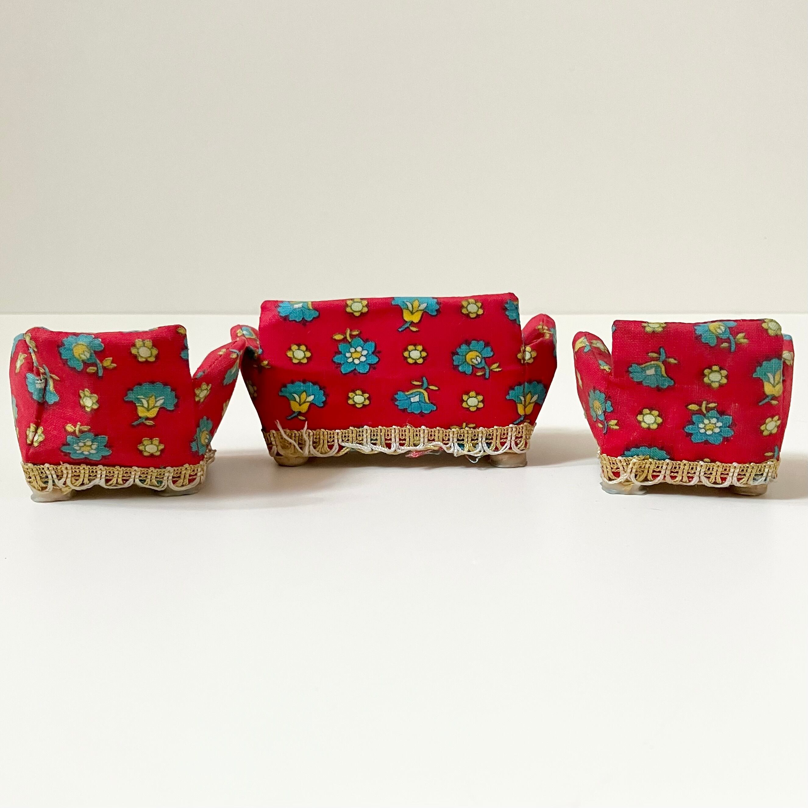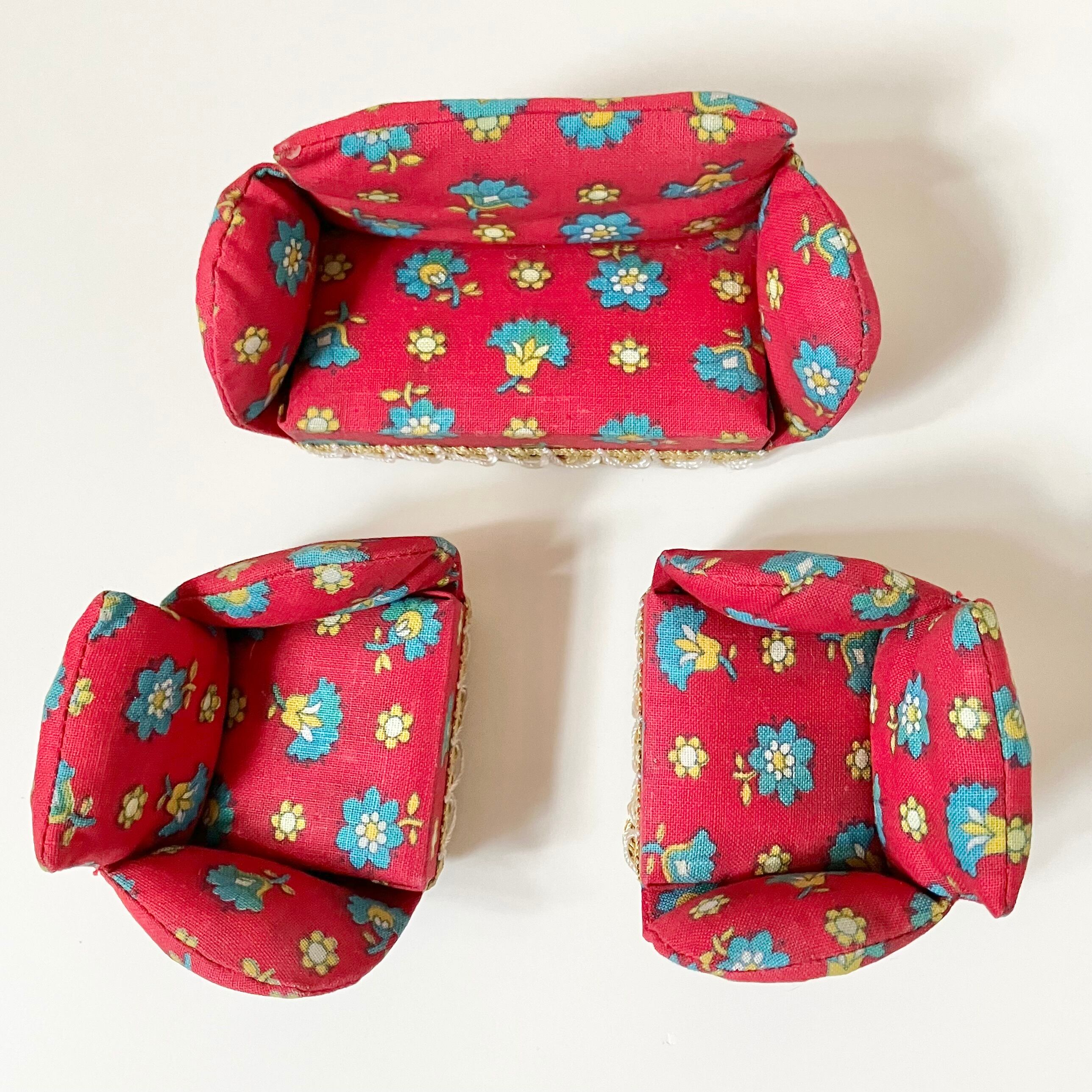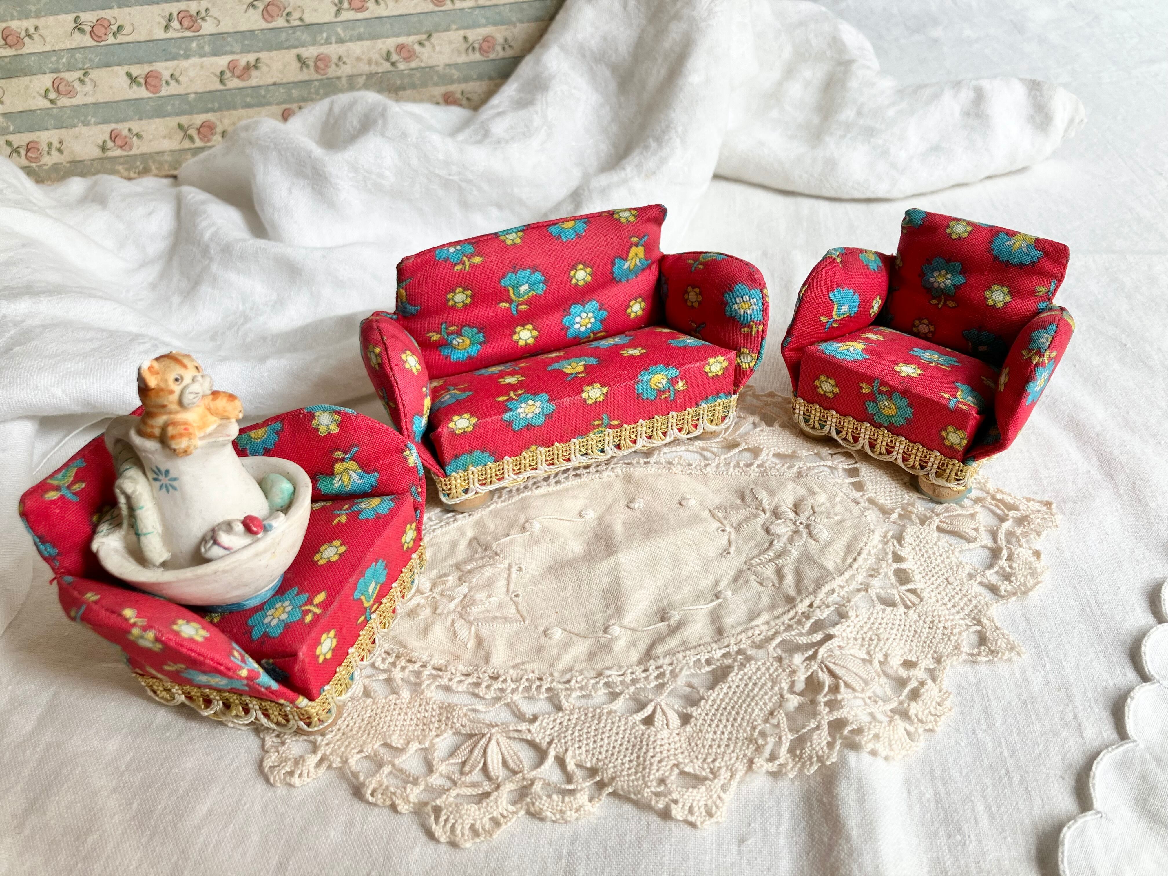 フランスの蚤の市で出逢ったドールハウス用のミニチュア家具。横長のソファーとひとりがけのチェアが2つの3つセットです。