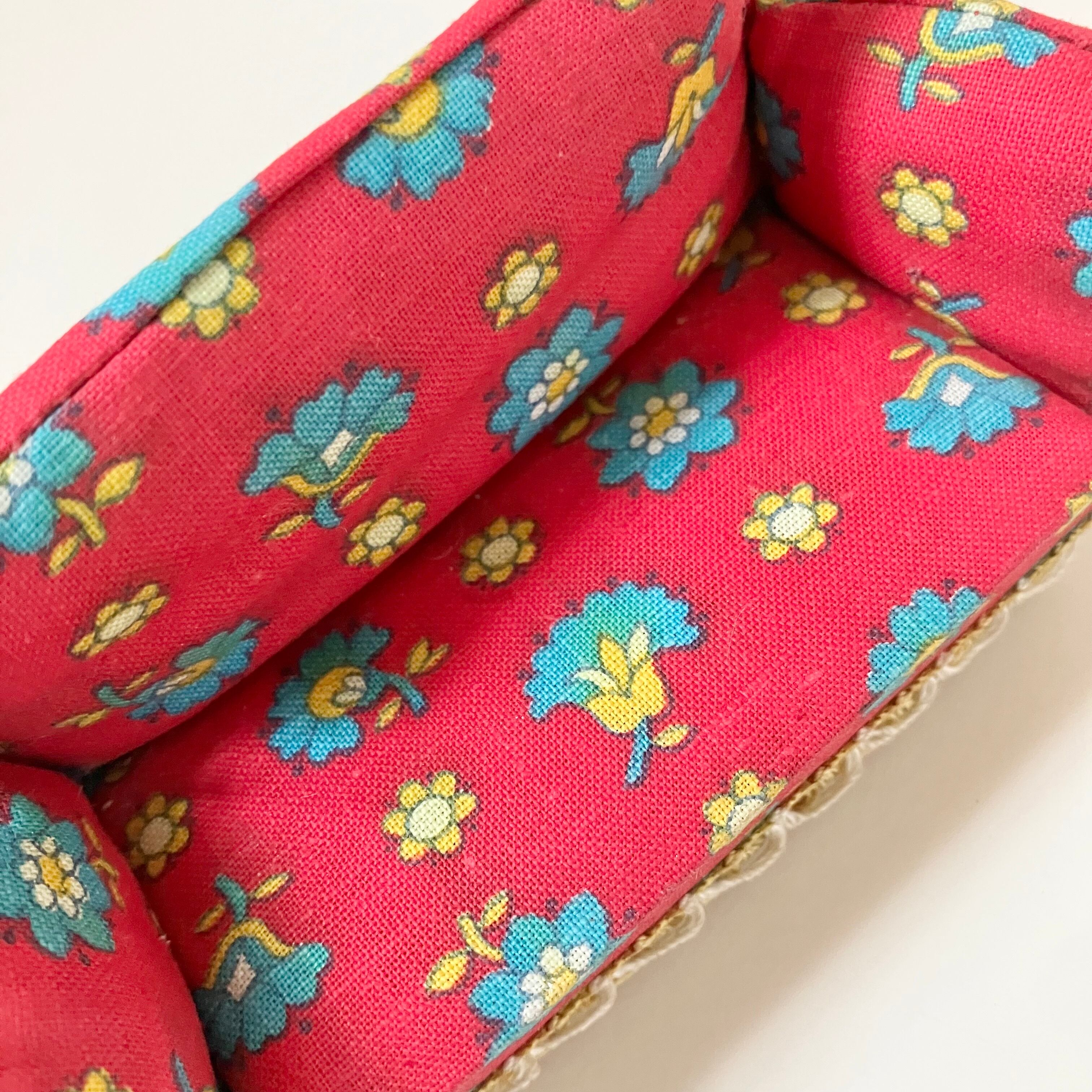 赤色にブルーとイエローのお花が描かれた可愛らしい柄の布張で、レトロな雰囲気が素敵なソファセットです。