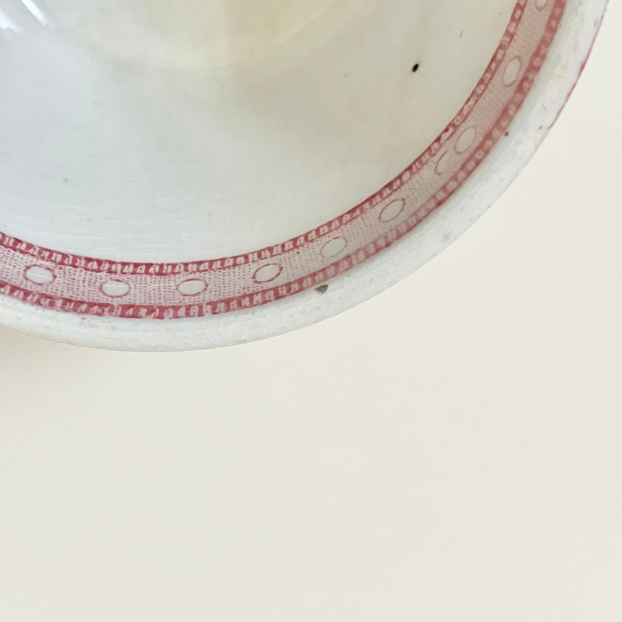 透明感のある白地に淡い赤色で、美しいバラとロカイユがカップ全面に描かれています。ショコラカップのようなフォルムや、縁のパールのような模様もとても美しい一客です。