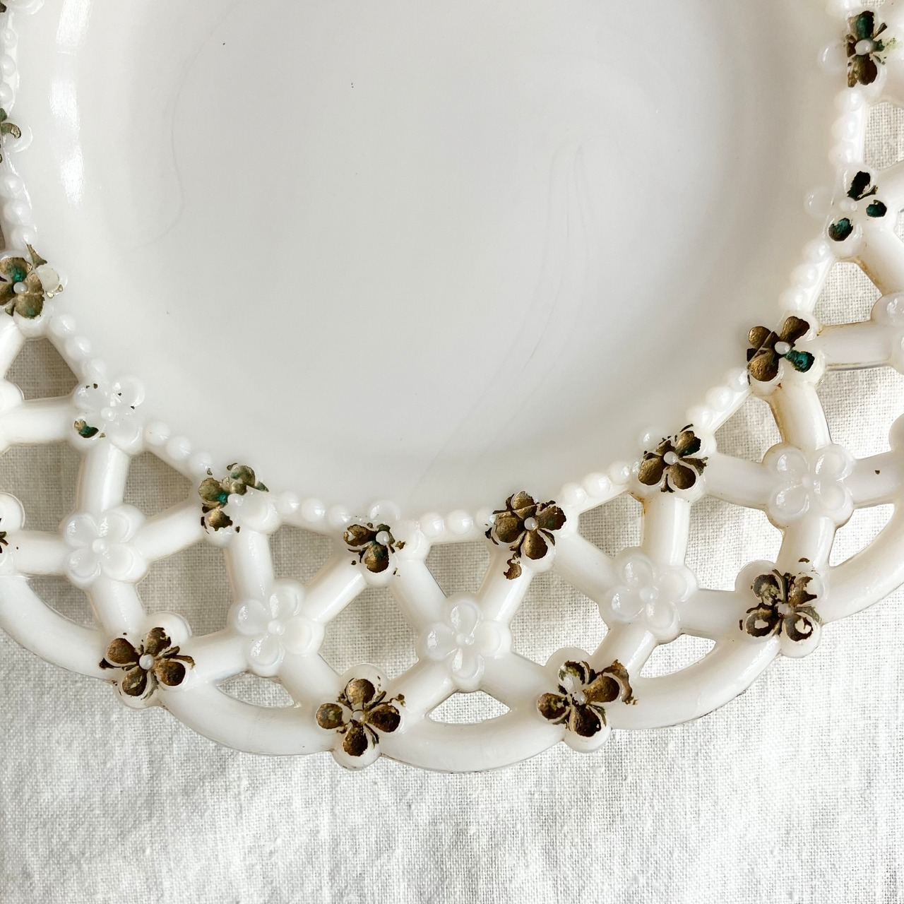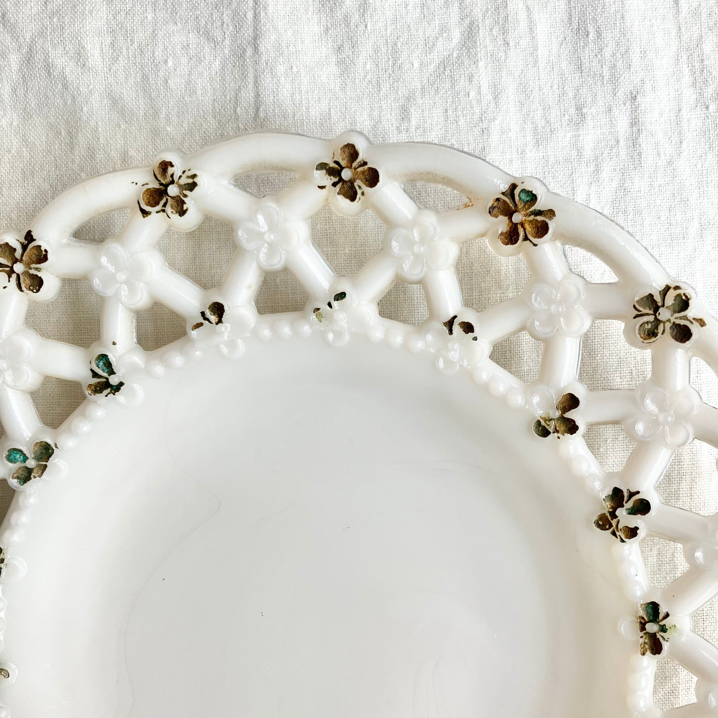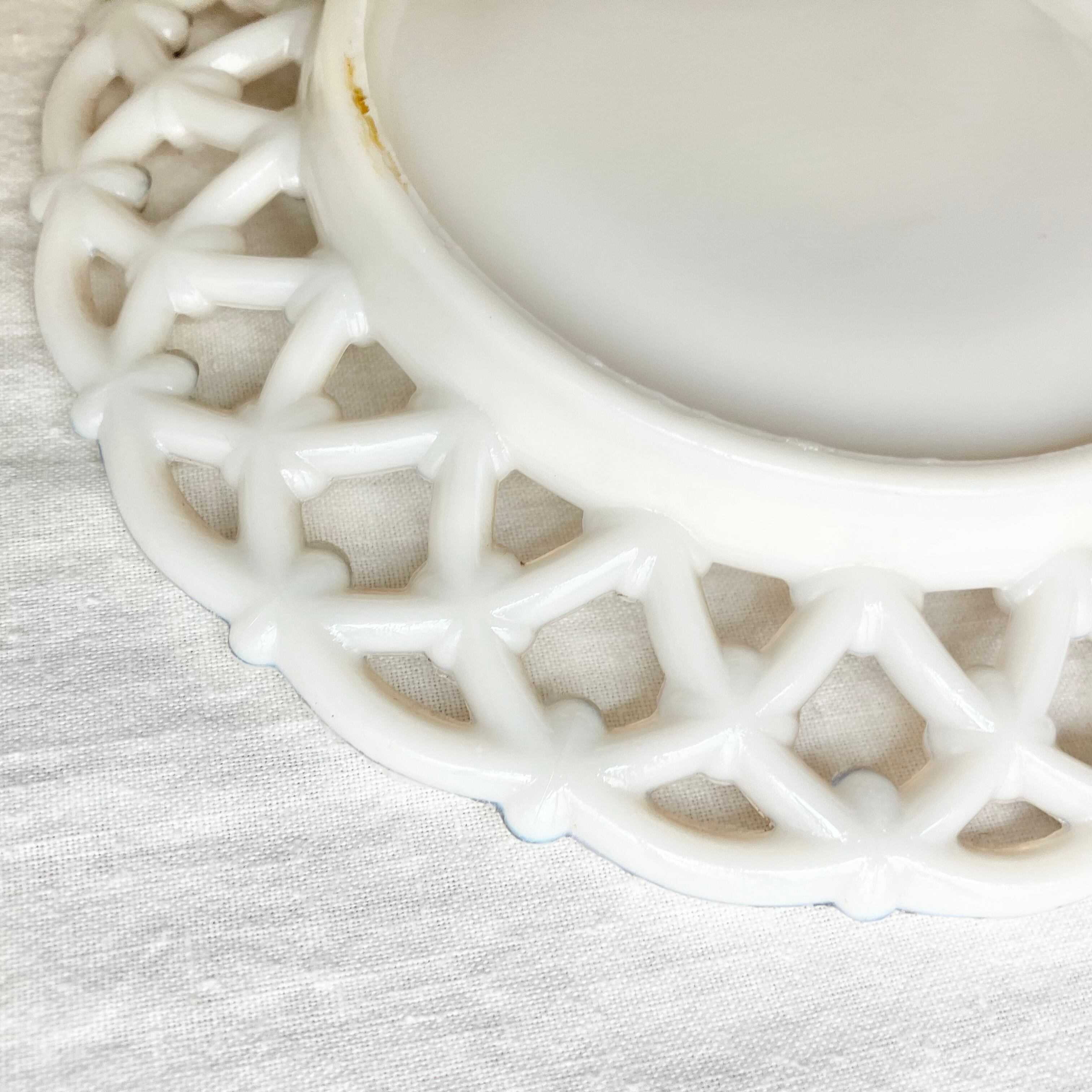 南仏の蚤の市で出逢った古いオパリンガラスのレースリムプレートです。