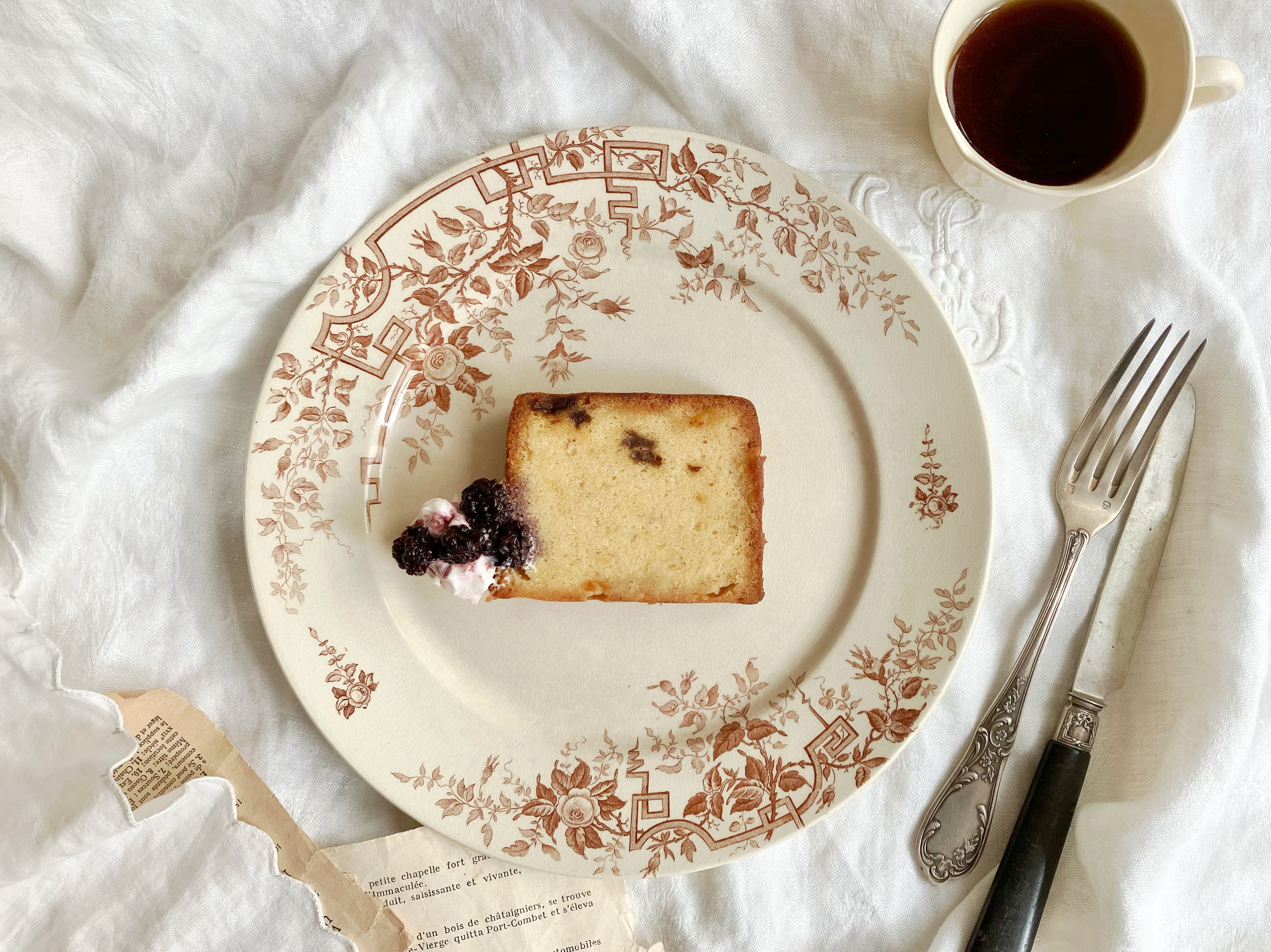 枯れ感のある薄い象牙色に、ブラウンでバラとロカイユが描かれています。