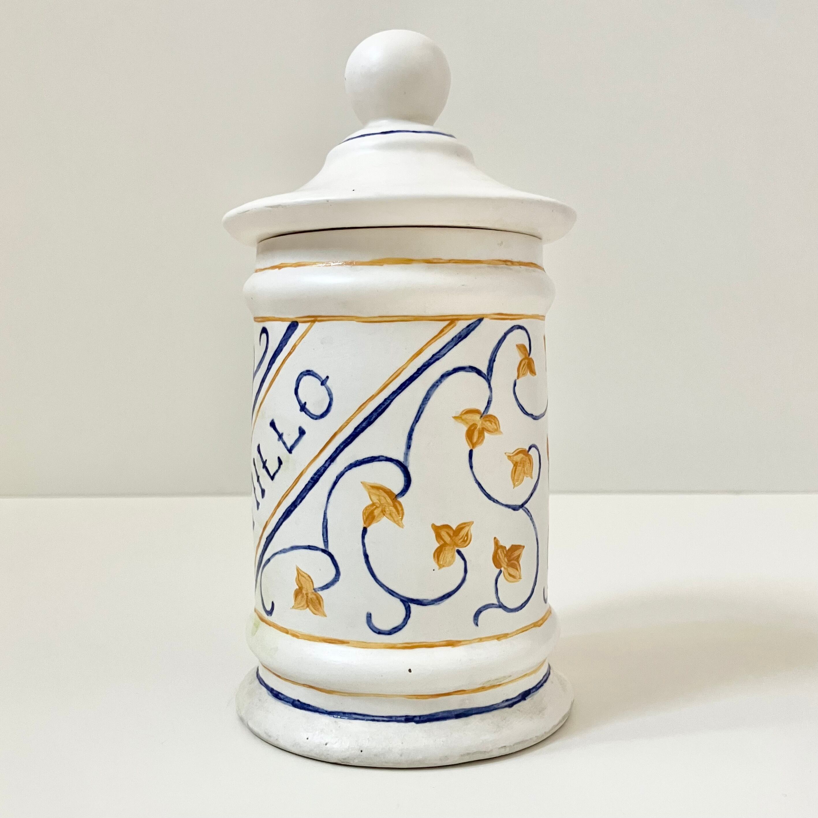 マットな質感のホワイトに、ブルー×イエローで美しい総柄が描かれ、Tomillo”タイム“と記されています。