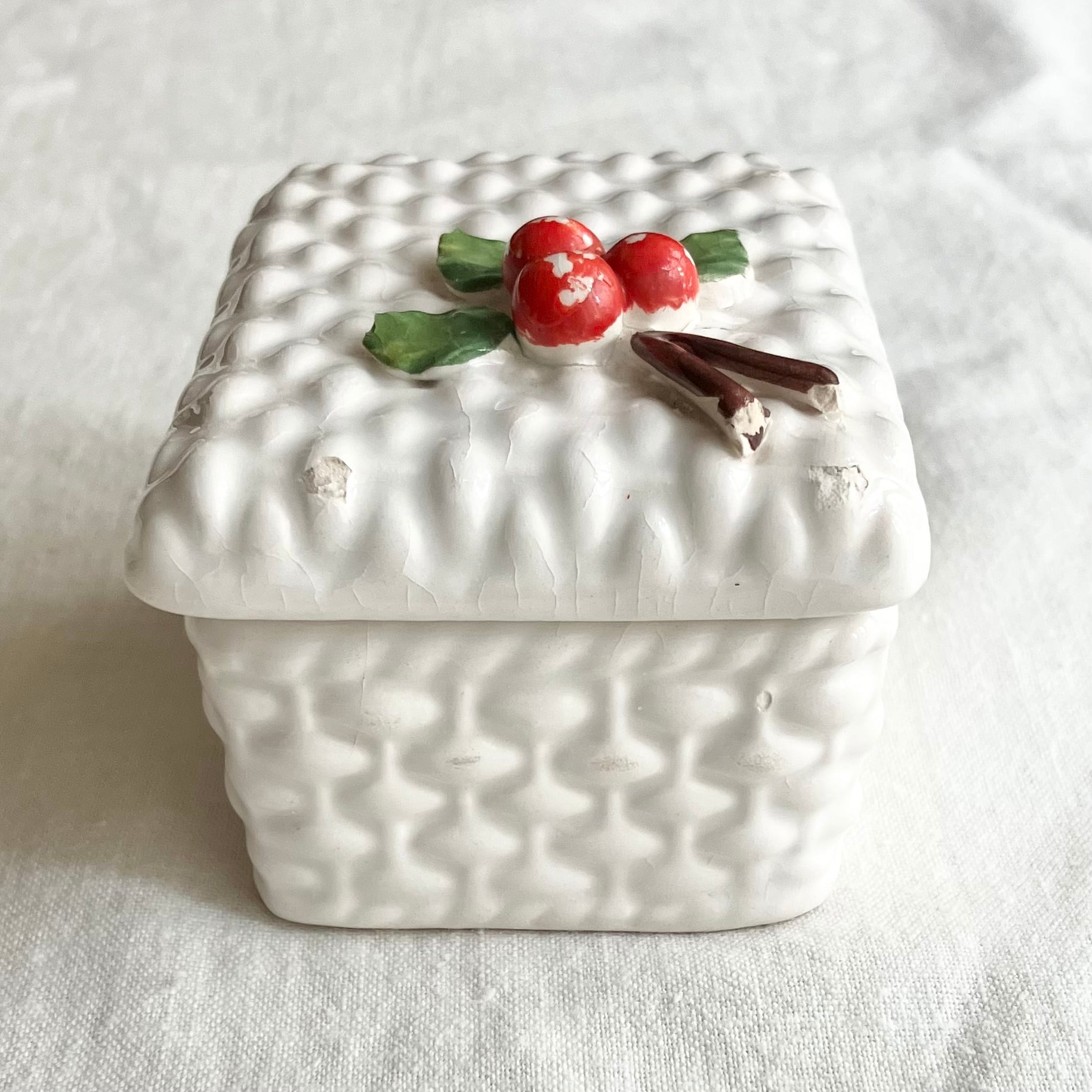 やさしい白釉のかかったパニエレリーフの上に、赤いベリーのモチーフがちょこんと乗った可愛らしい小箱です。