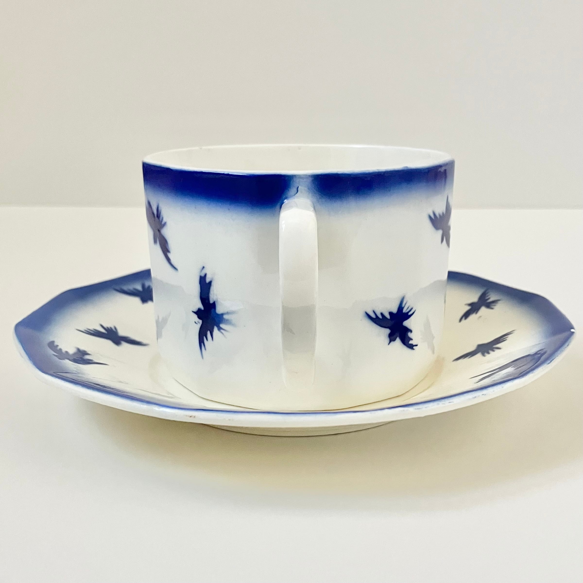 やわらかな乳白色に美しいブルーで、飛び交うたくさんのツバメが描かれています。