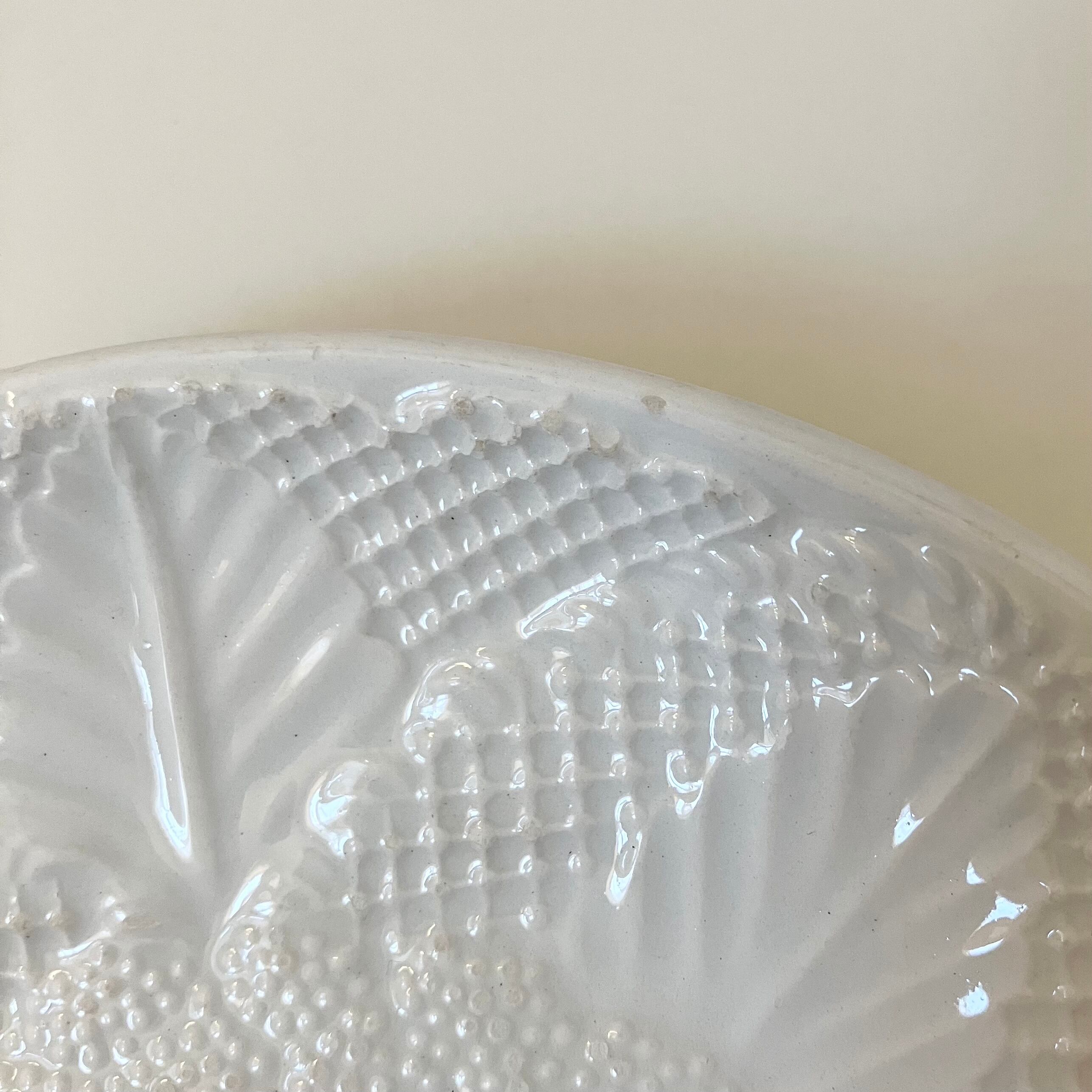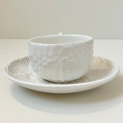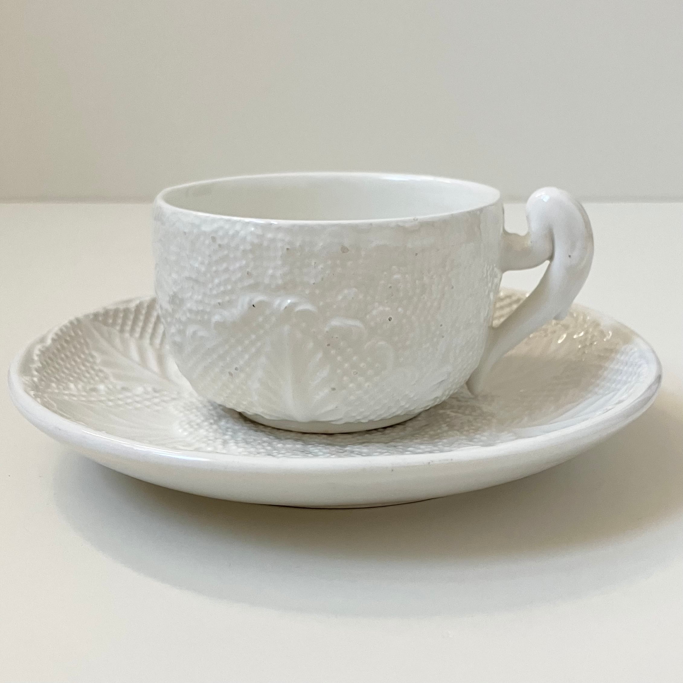 美しい白釉のバルボティーヌ装飾が全体に施されています。大きなお花モチーフと、その周りには葉っぱのロカイユで飾られている、なかなかに珍しい一客だと思います。