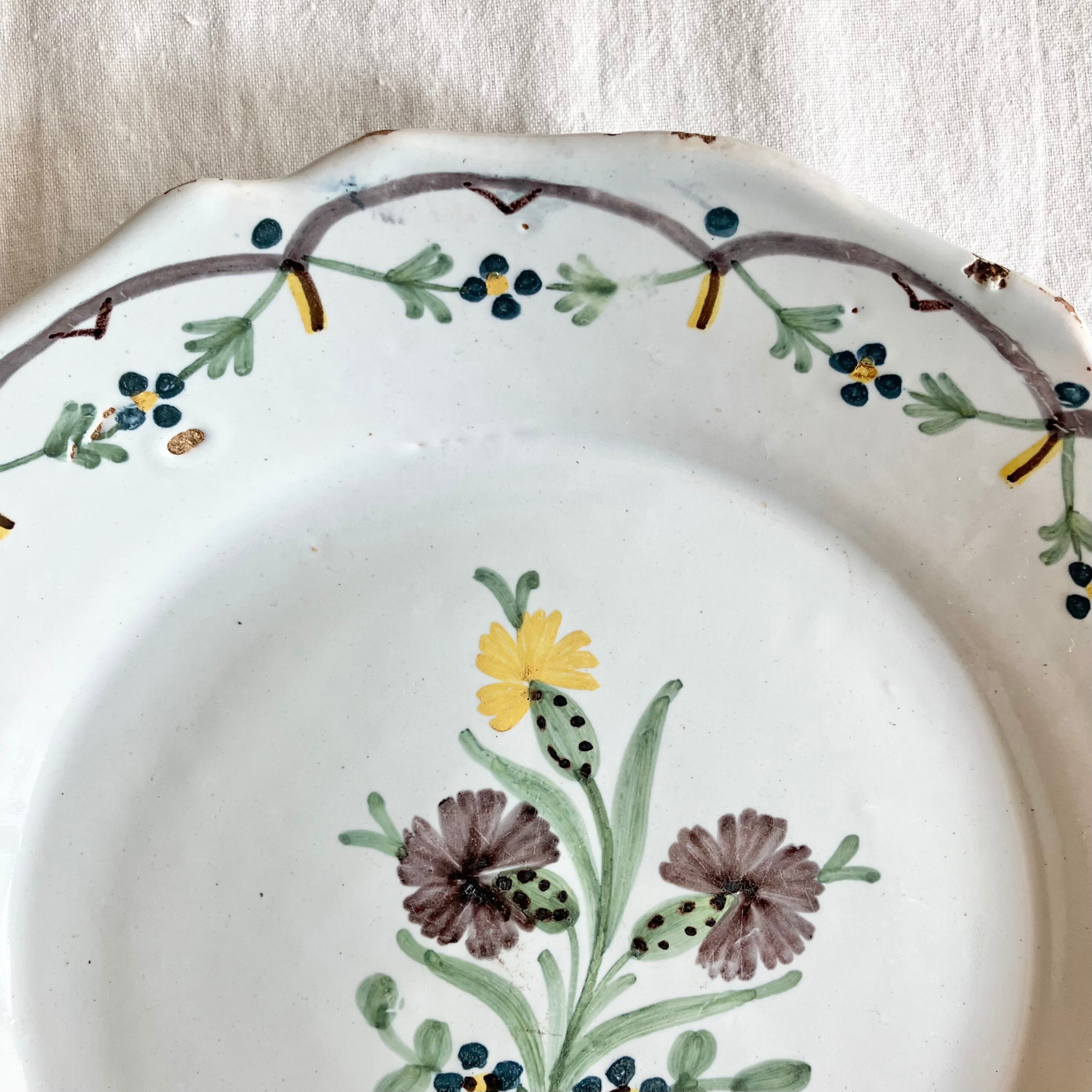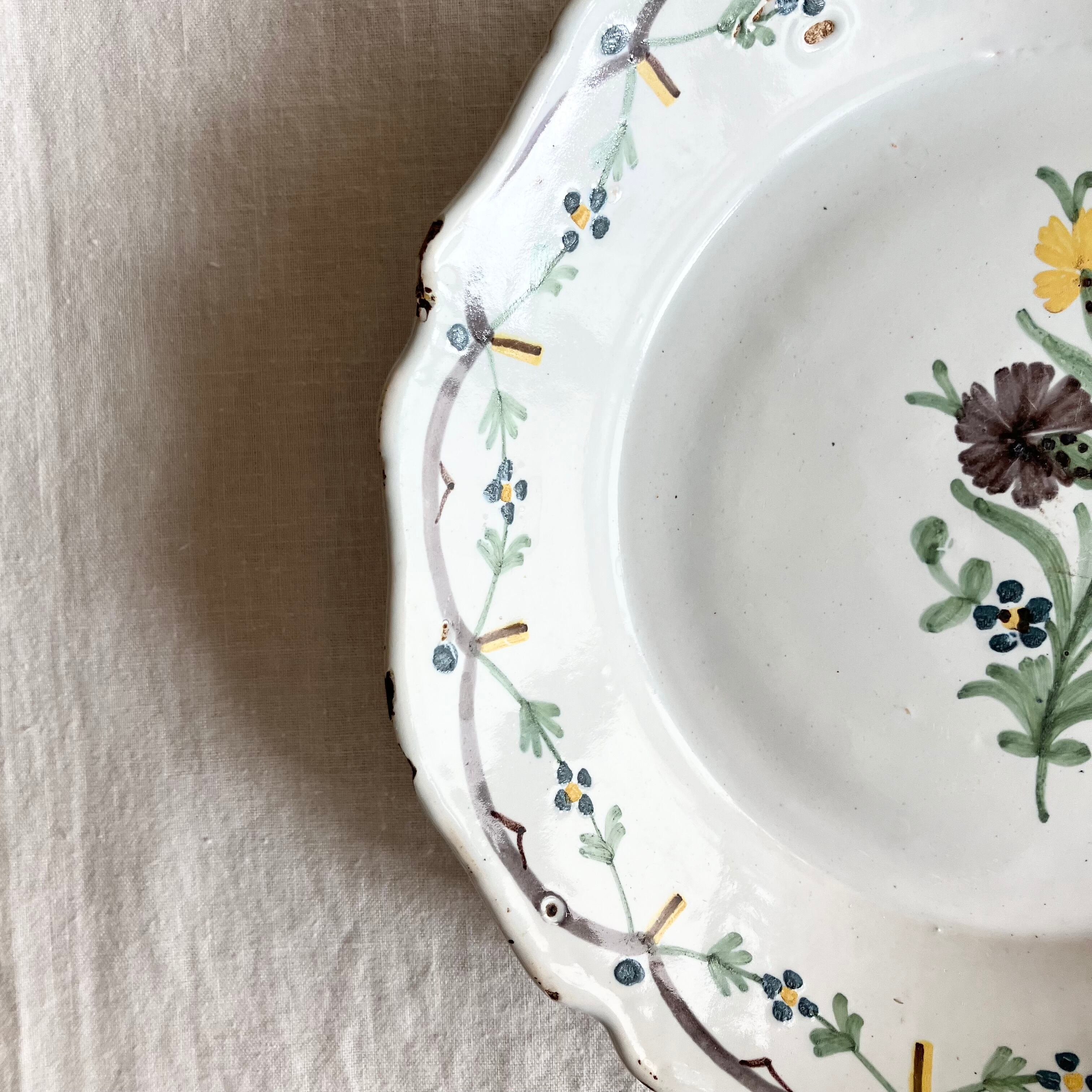 くすんだ色味の白釉に、黄色とチャコールやブルーで中央に大きく野花が描かれています。スカラップリムの縁には可愛いブルーとイエローの小花のガーランドがぐるりと飾られています。