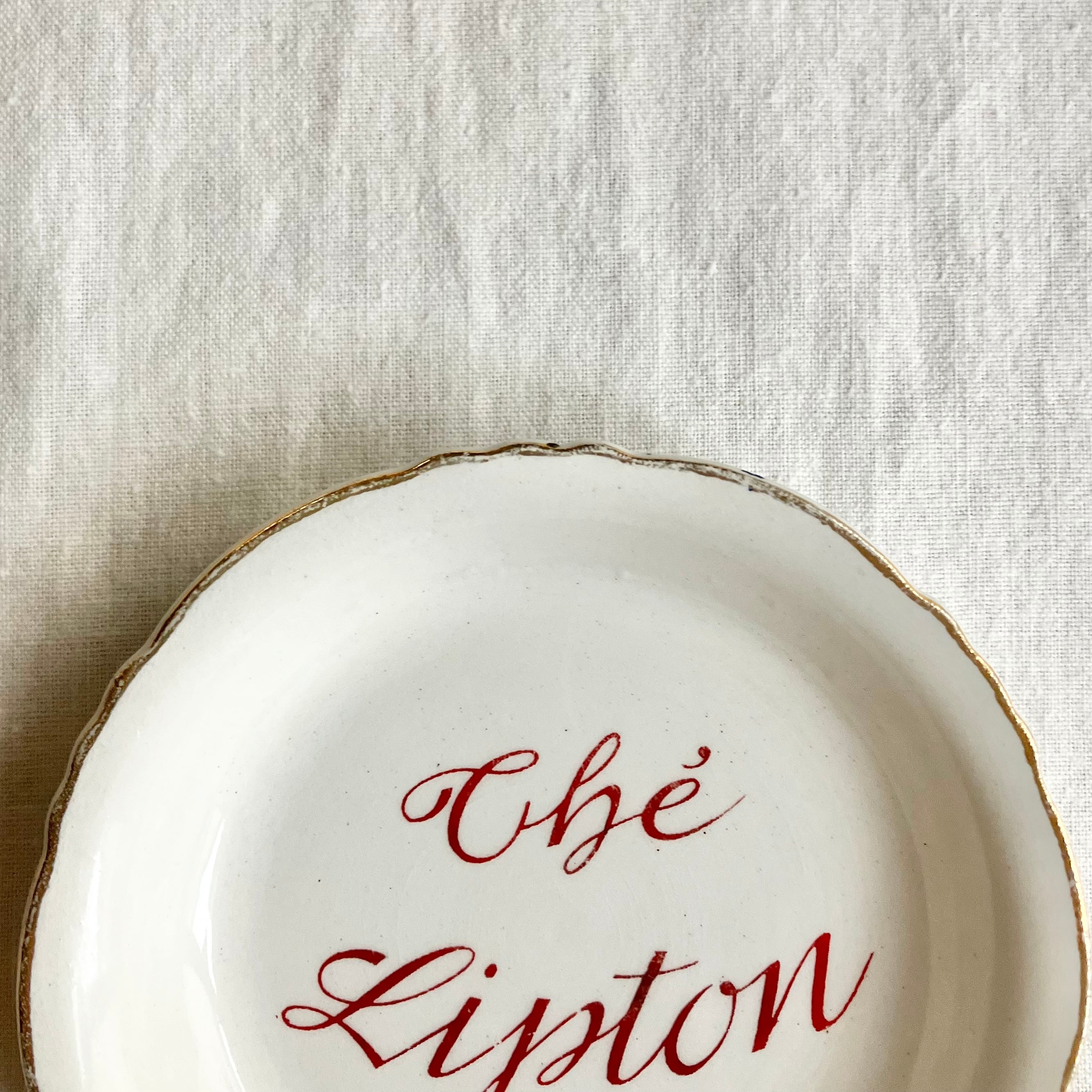 美しい白地に深いアンティークレッドでThé Liptonと記されています。