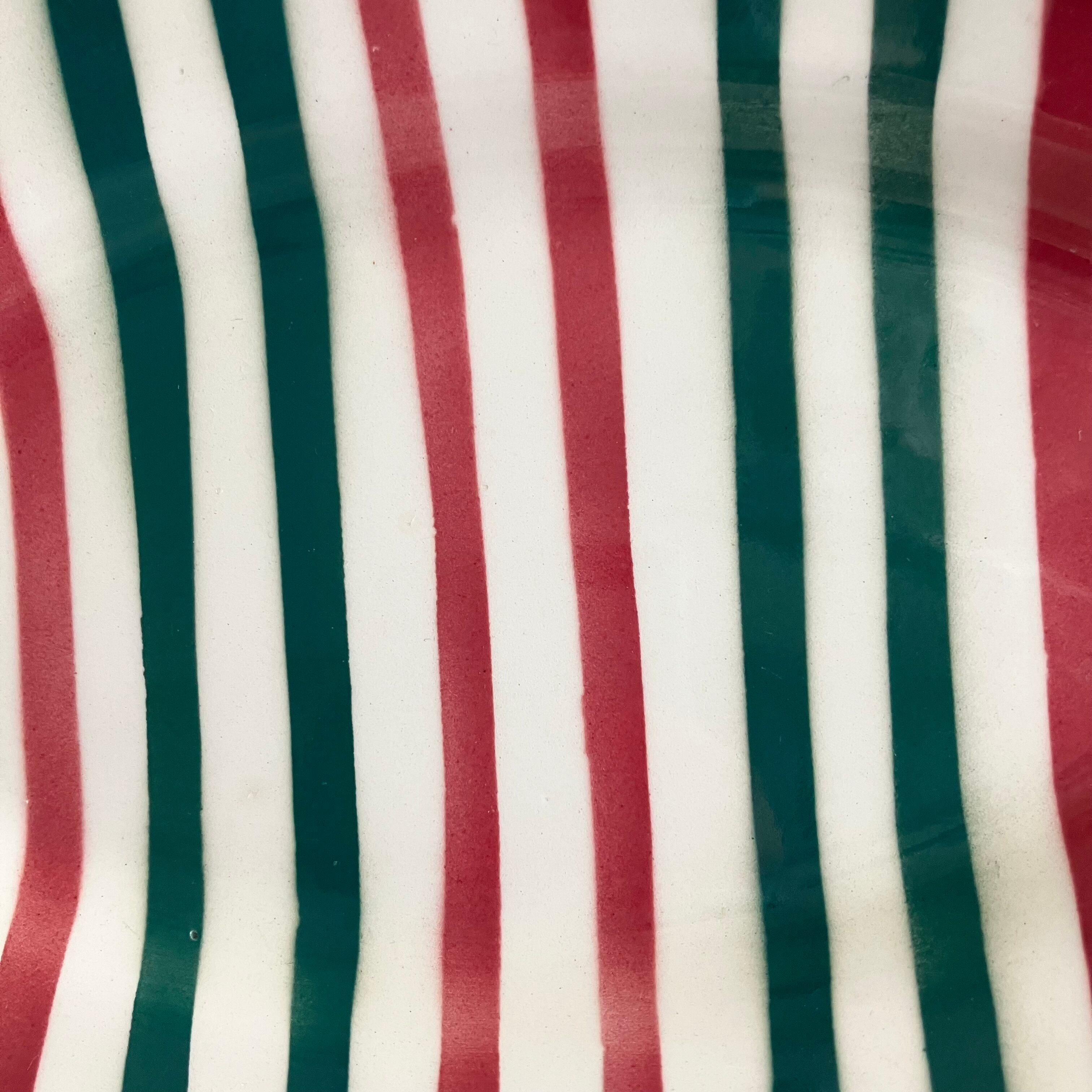やわらかな白地に赤色とグリーンのホリデーカラーでストライプ柄が描かれた、珍しい一枚です。
