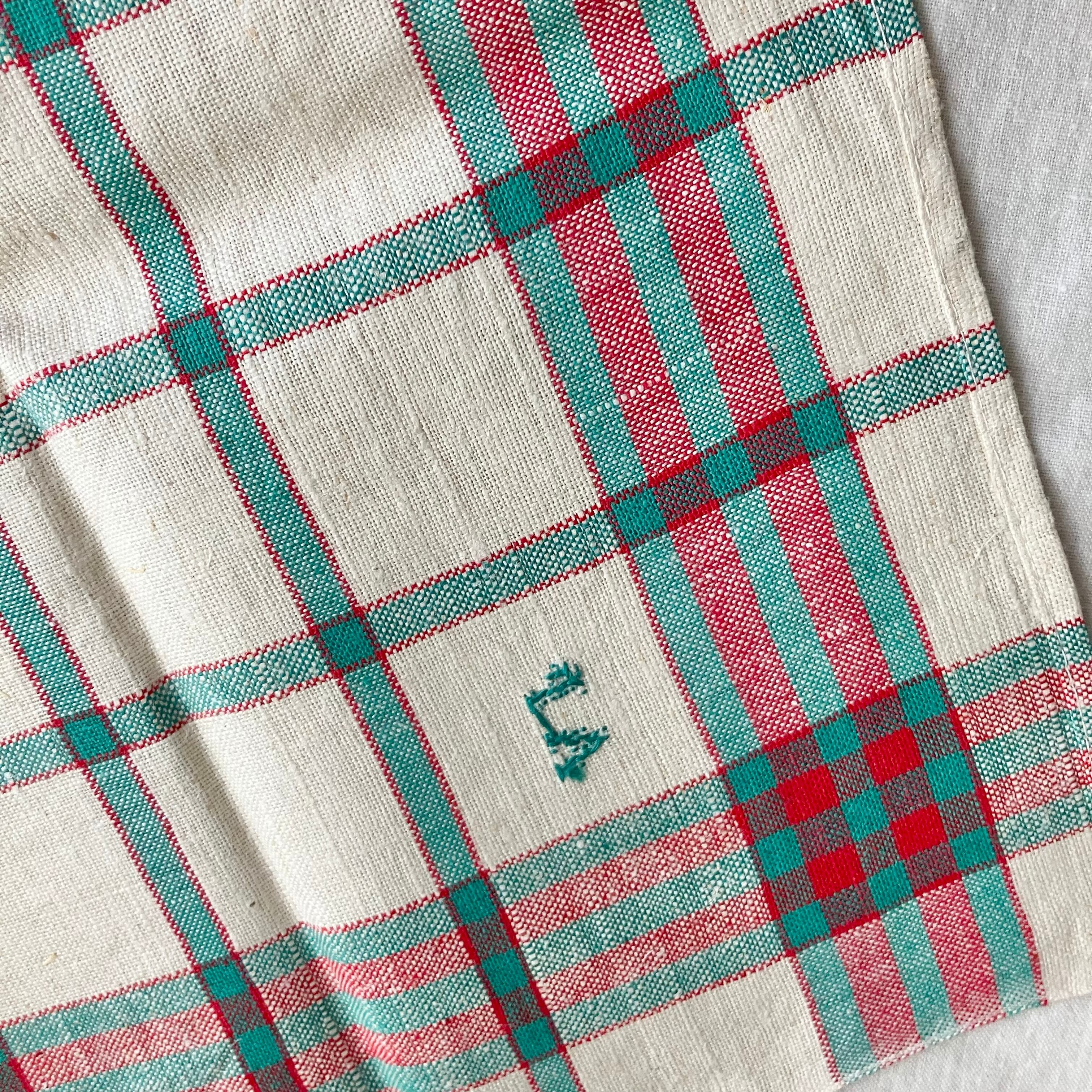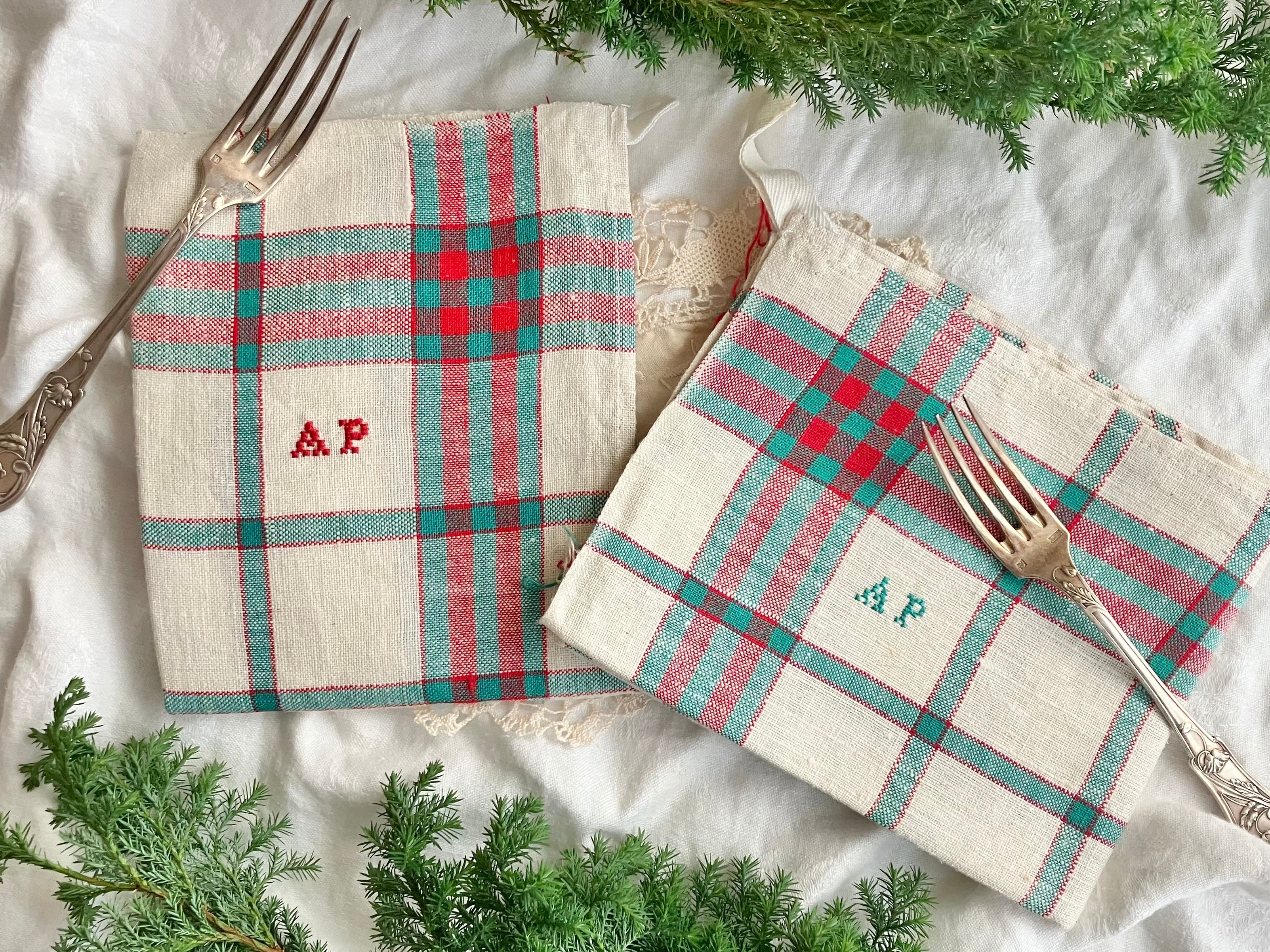 赤色とグリーンのチェック柄です。それぞれにグリーン、赤色でモノグラムが刺繍されています。引っかかるためのフープ付き。