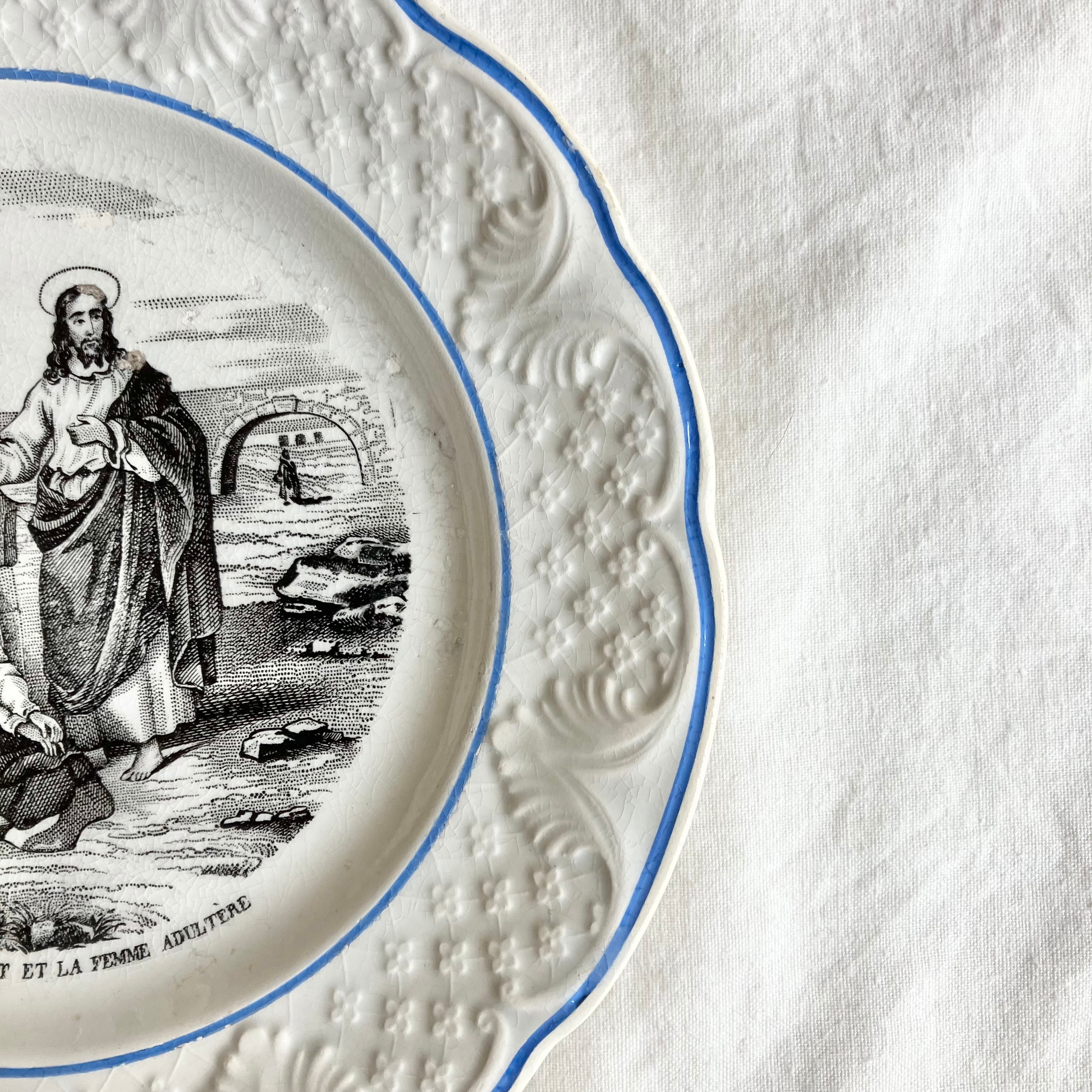 美しい白地に描かれているのは、イエス・キリストが不貞により罪に問われていた女性に赦しを与えるワンシーンです。