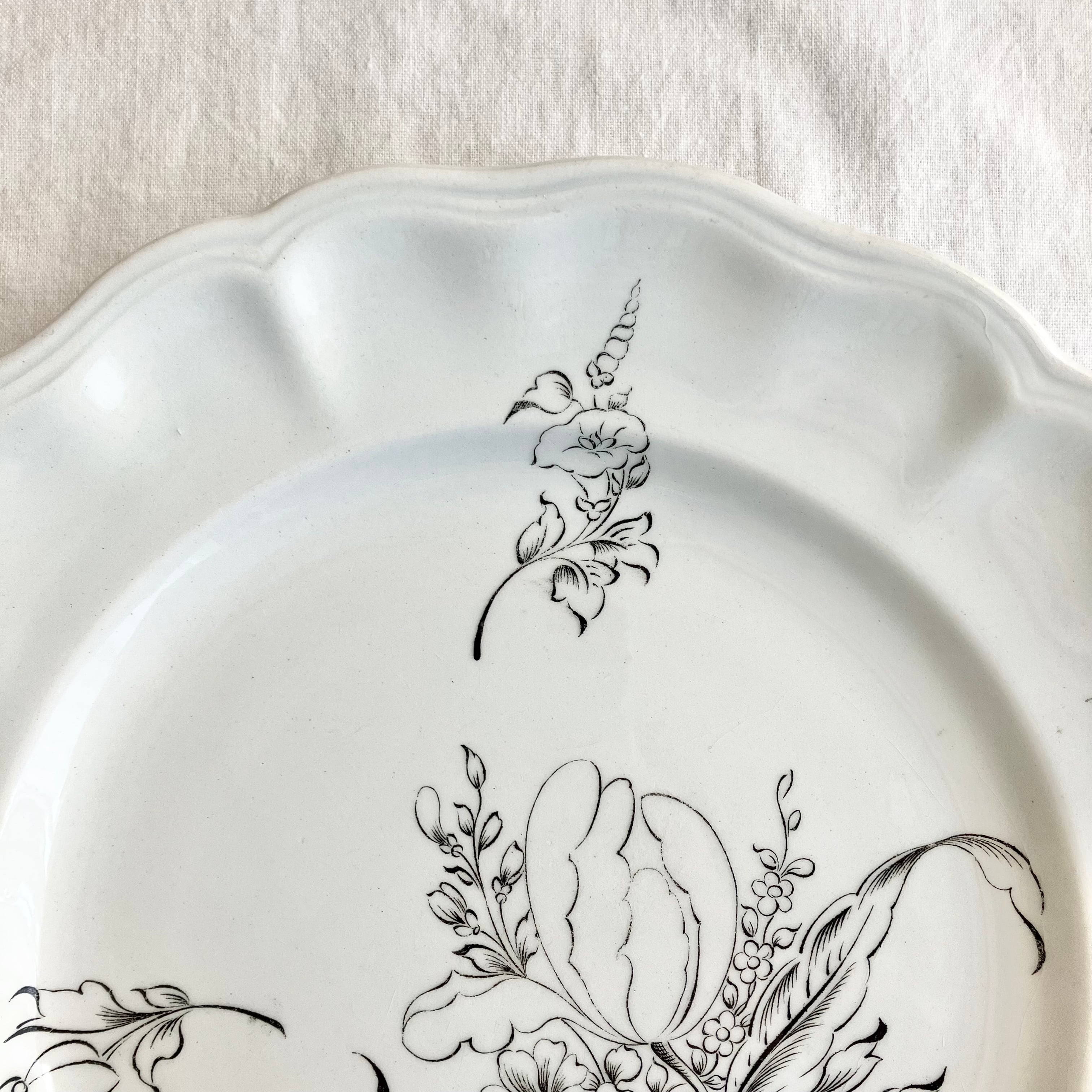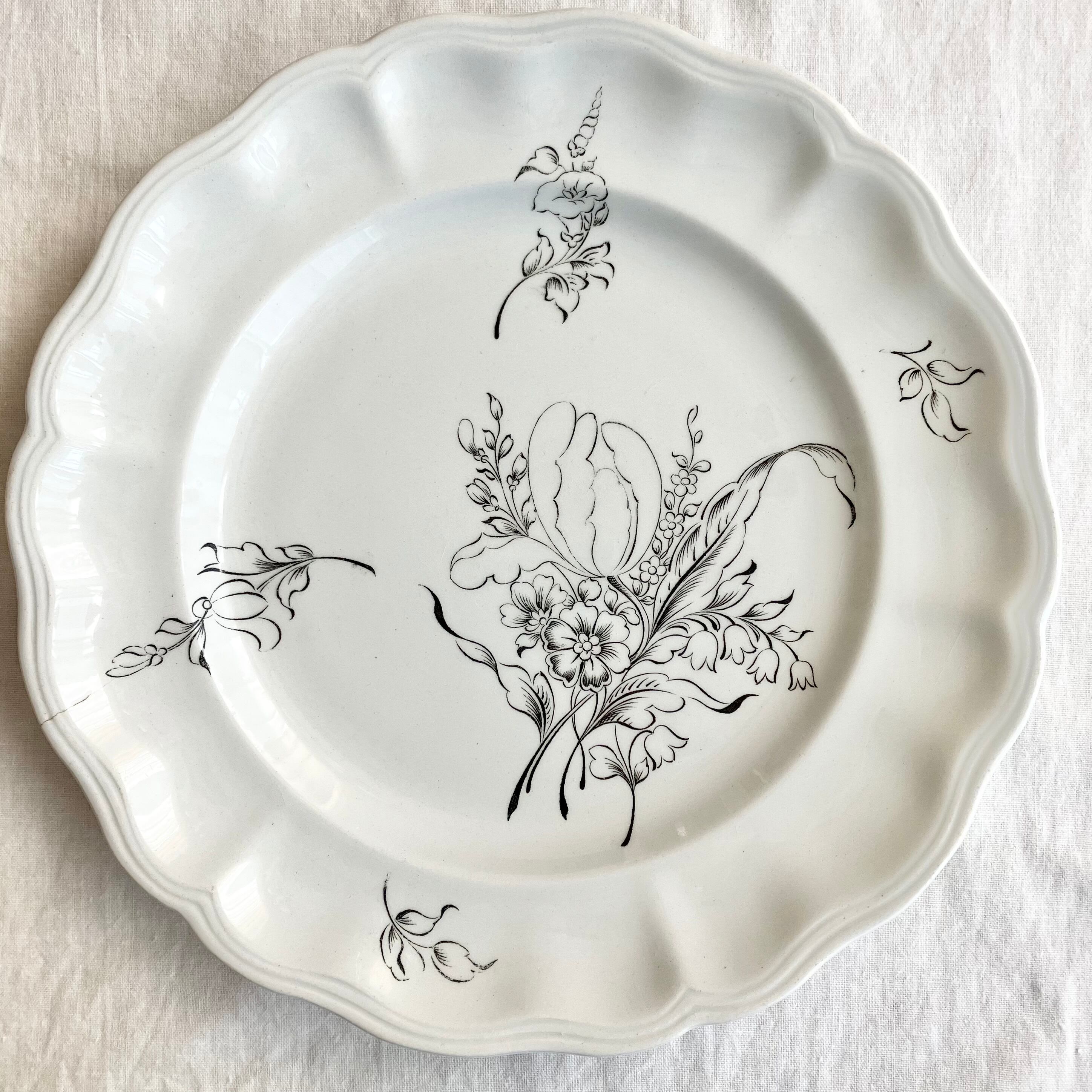 美しい白地にシックなモノクロームでチューリップの花束が大きく描かれています。フラワーリムの縁にも愛らしい花々が飾られていています。