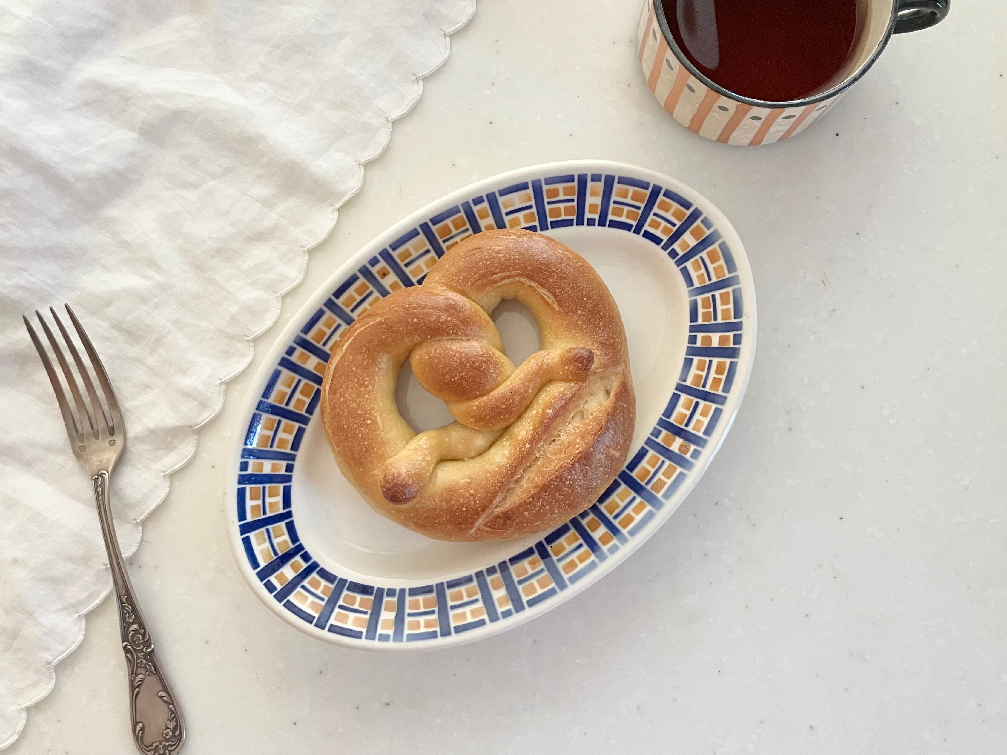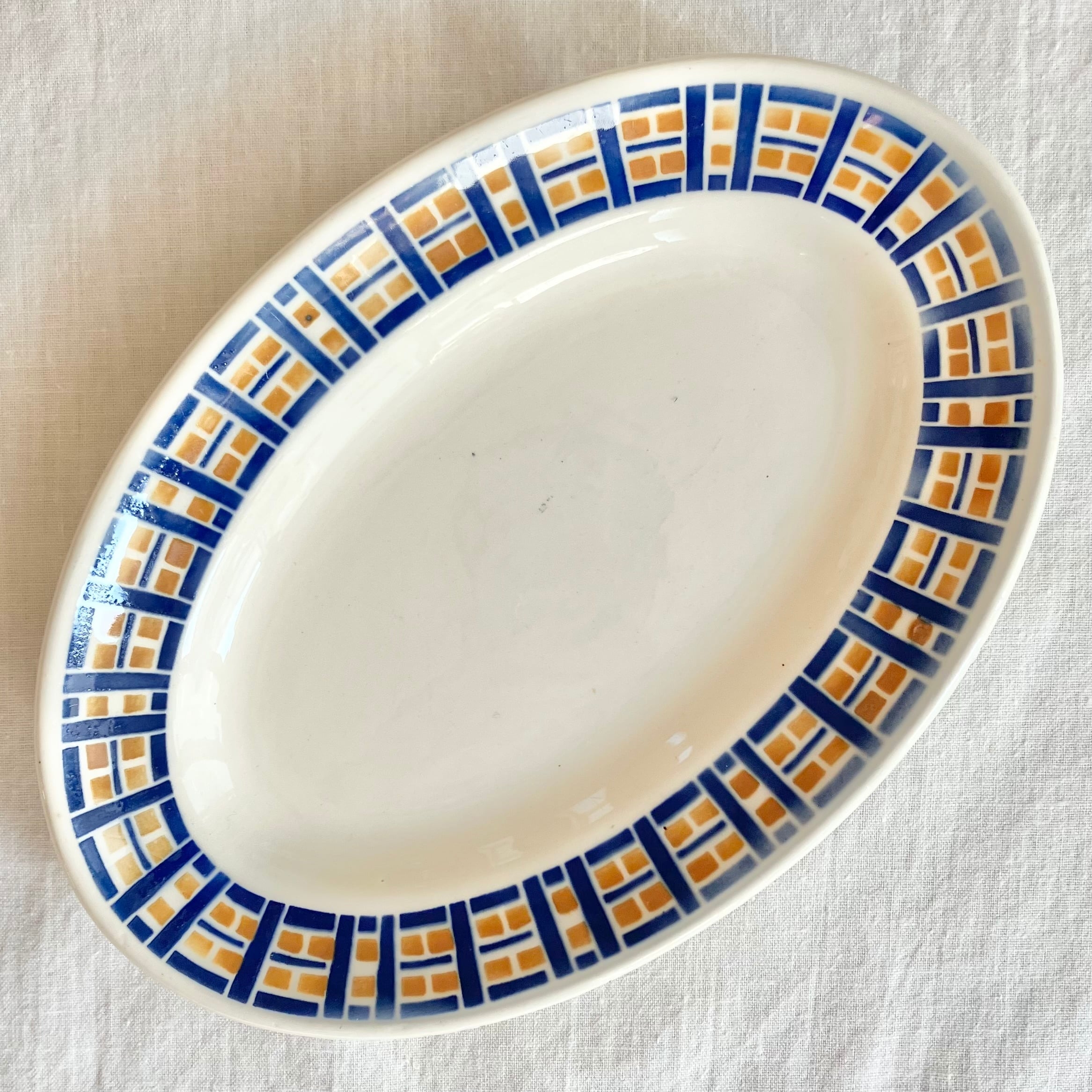 やわらかな乳白色に、縁はオレンジとブルーの可愛いチェック柄で飾られています。