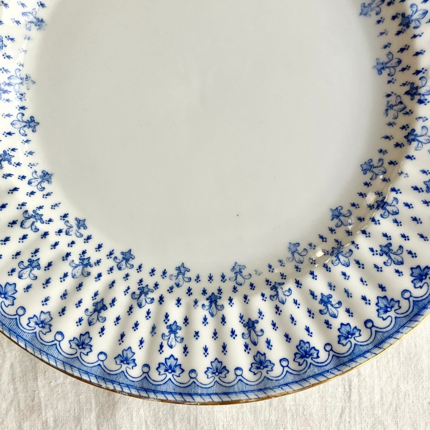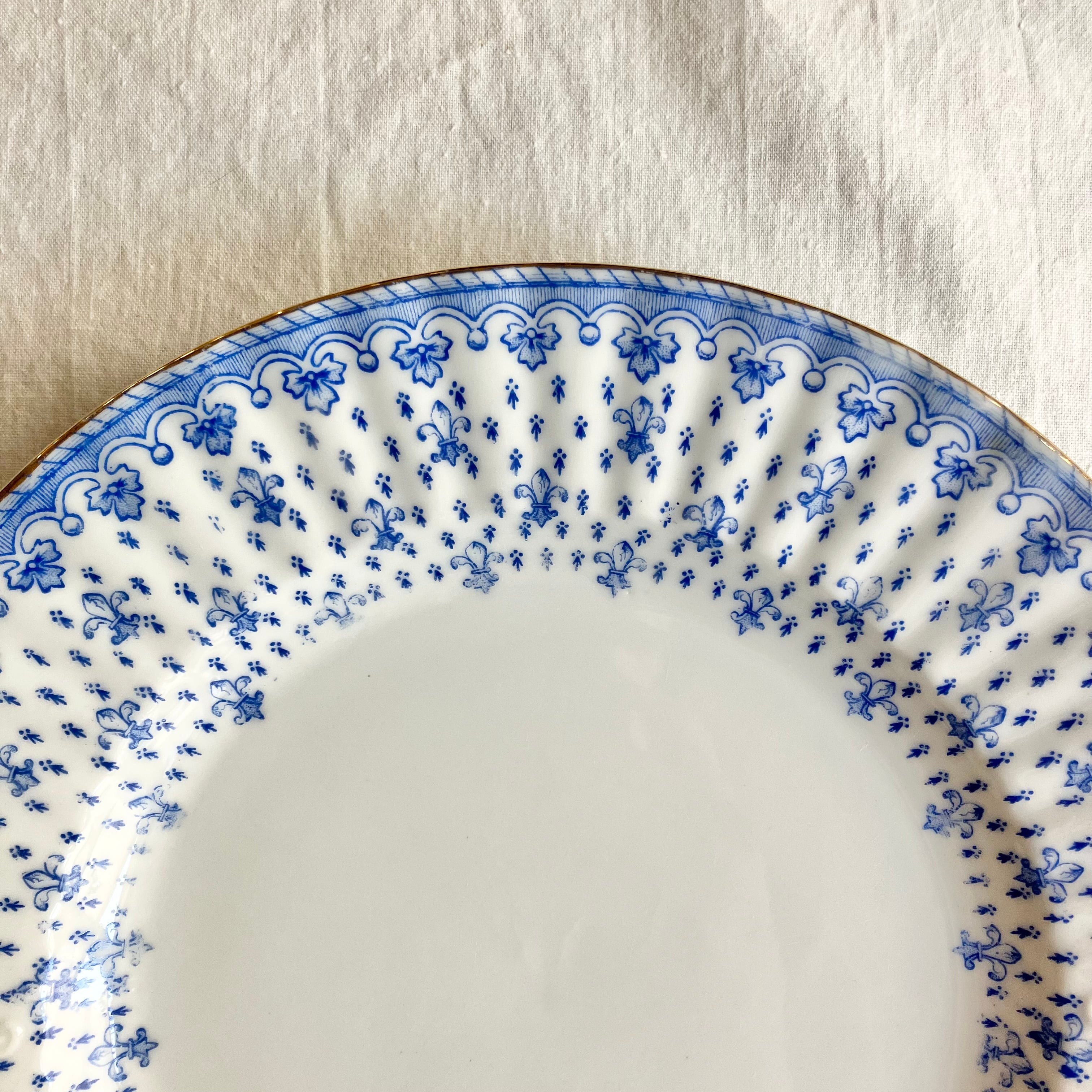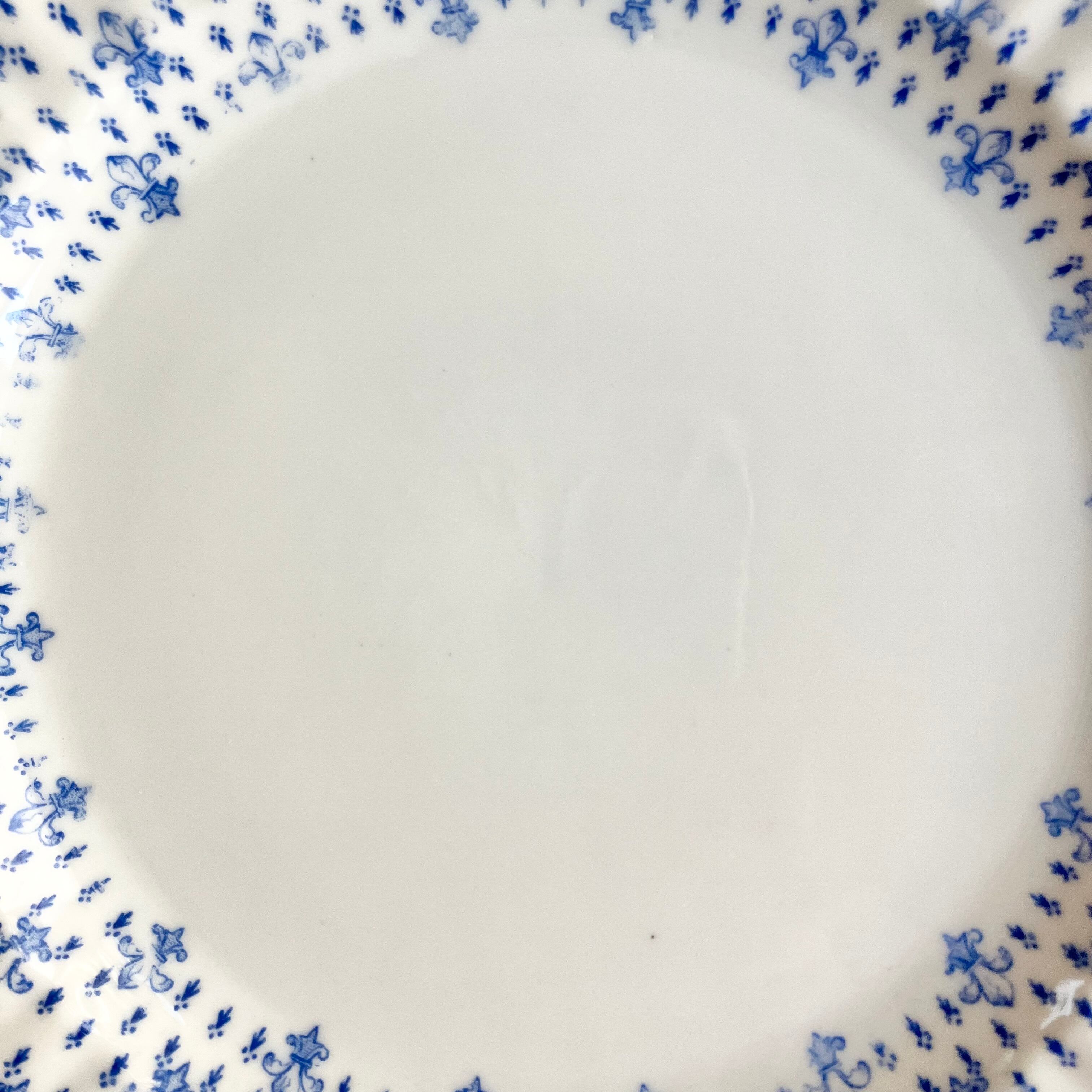 美しい白地に、透明感のあるブルーでフルール・ド・リスの模様がドット柄のように散りばめられています。縁は波打つプリーツリム、持ち手にはロカイユのレリーフが施された、大変美しい一枚です。