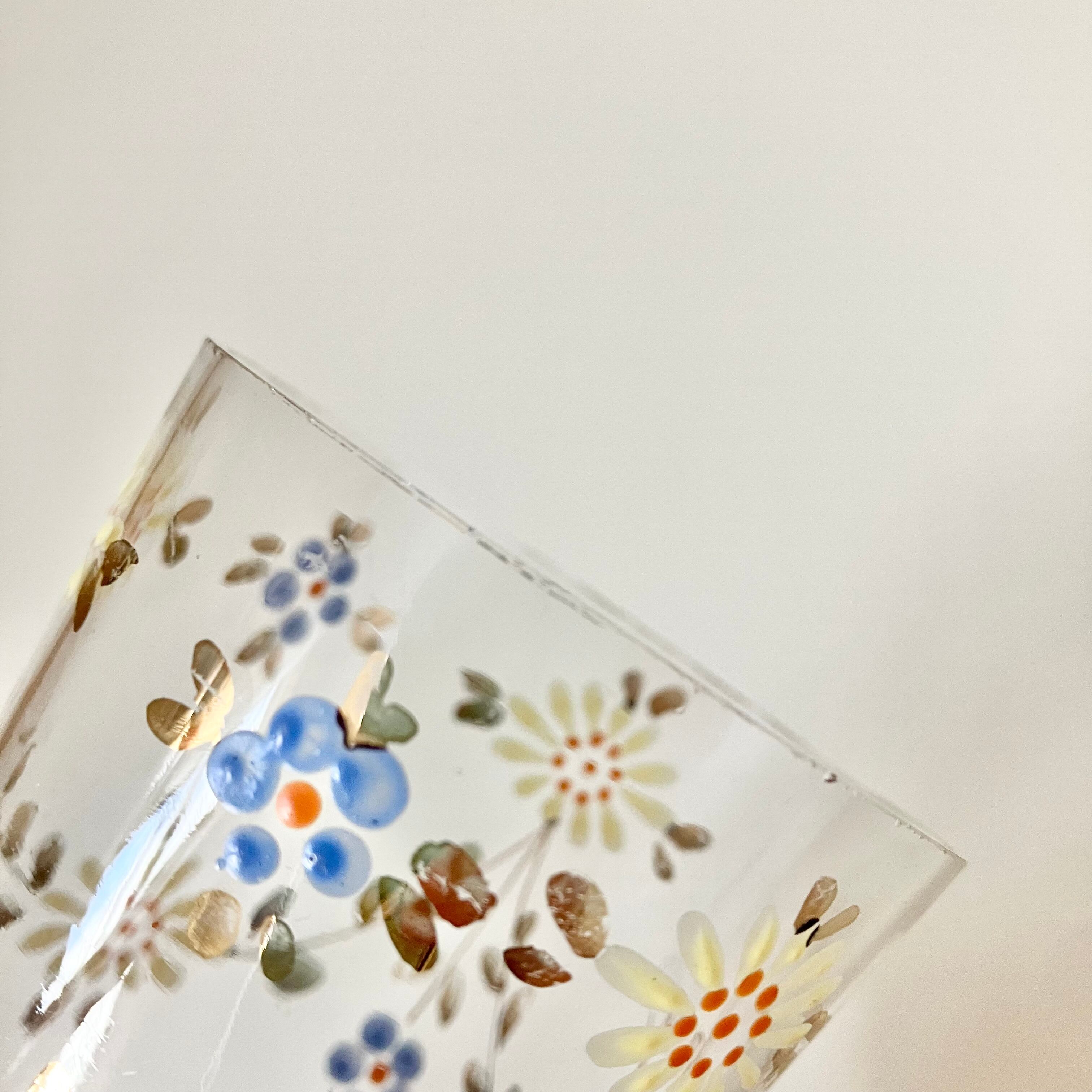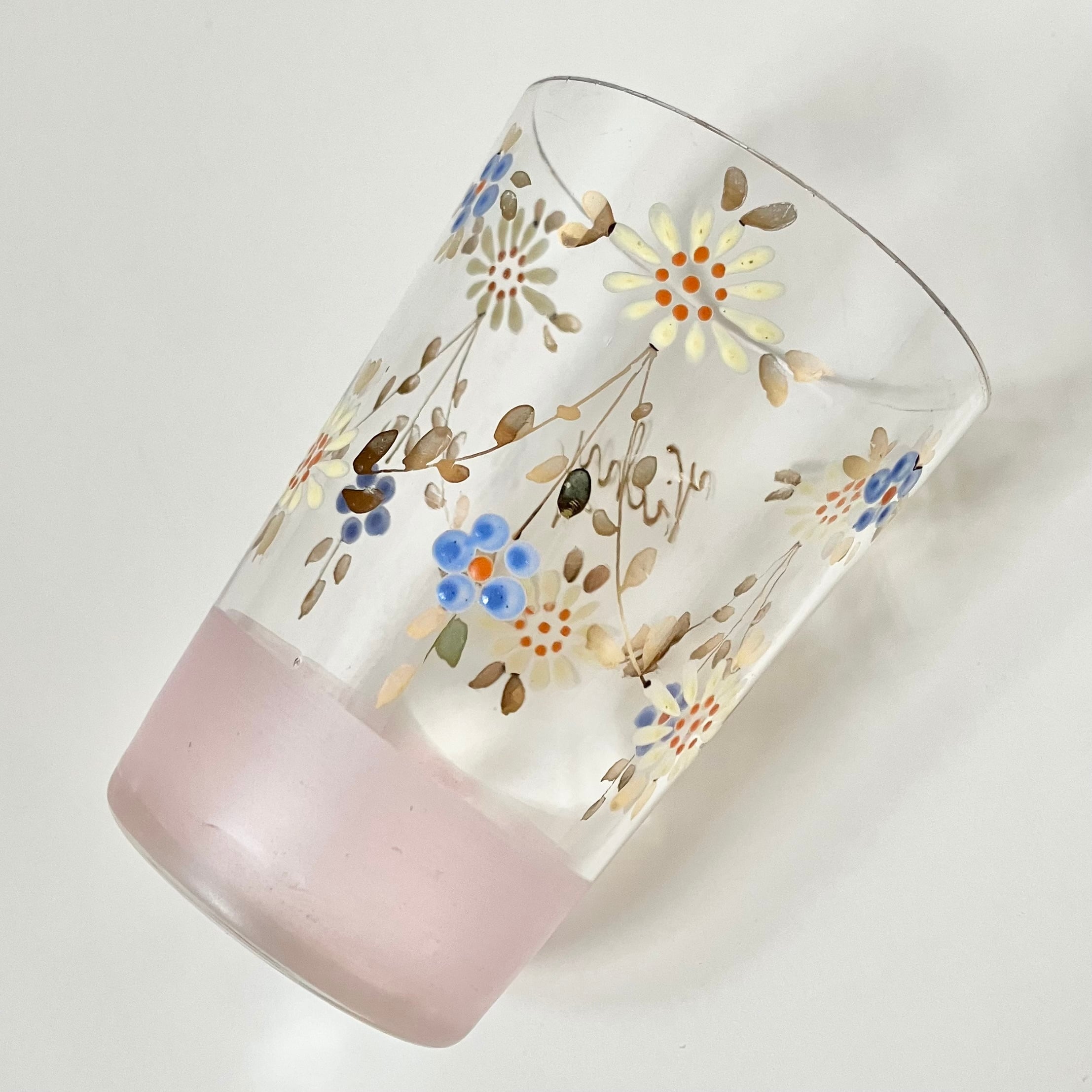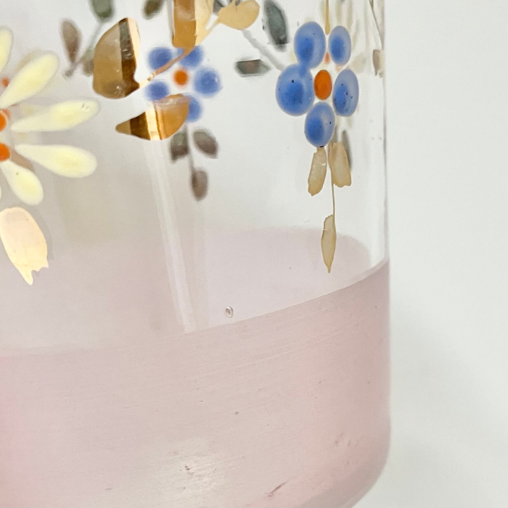 薄口のグラスに、エナメルで可愛らしいお花とゴールドで葉っぱのガーランド。そしてお尻はピンクの磨りガラスで飾られています。