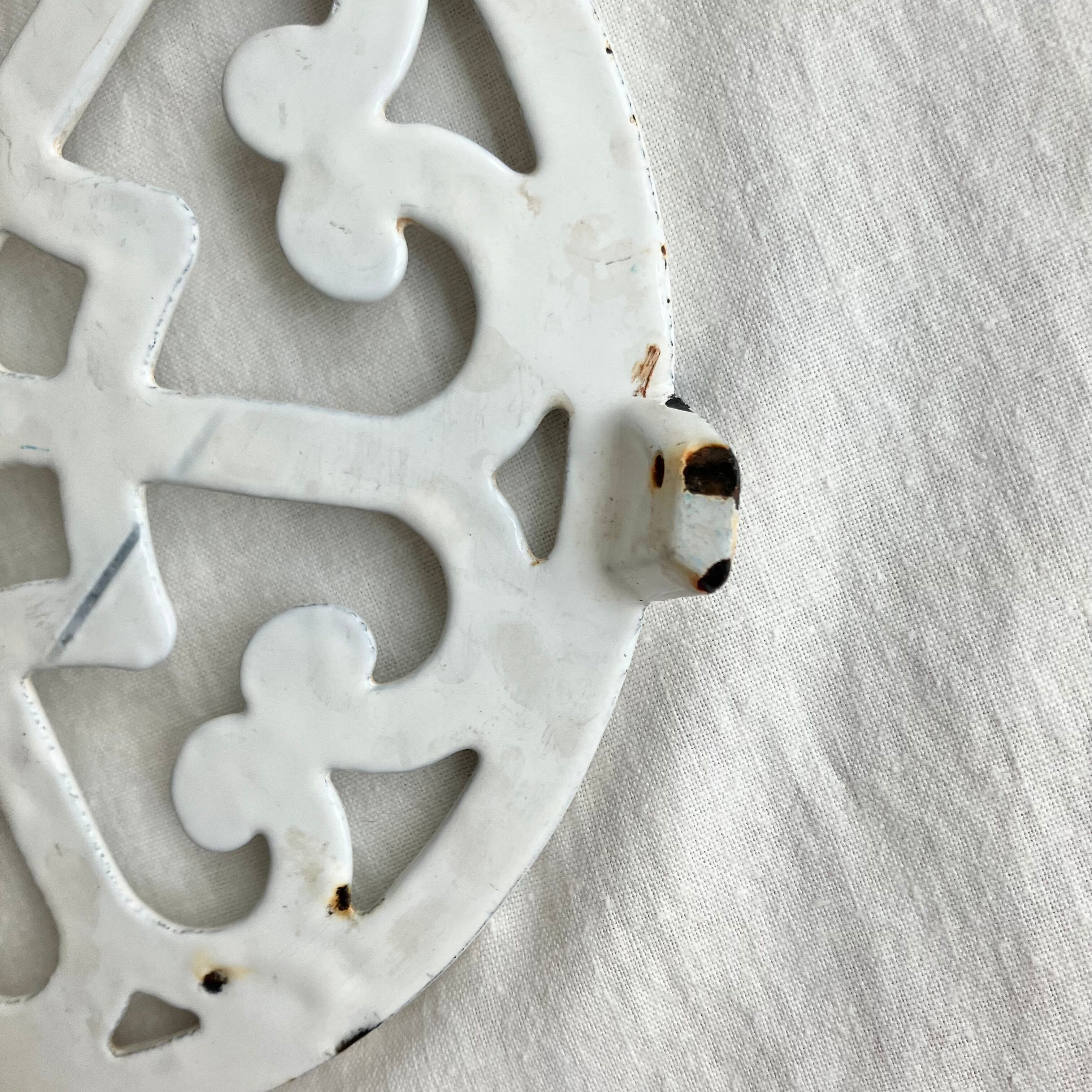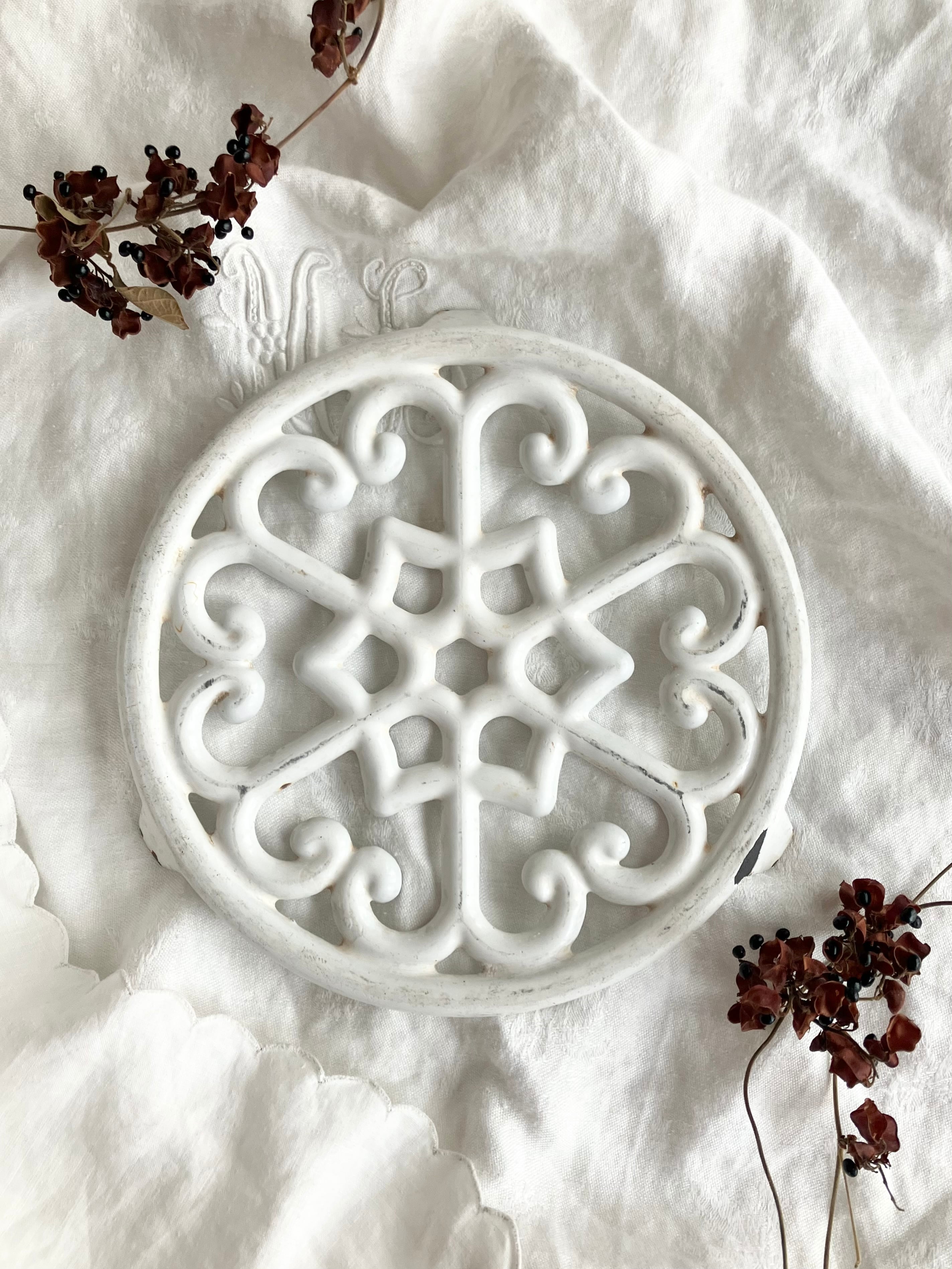 六芒星やハートのような模様がとても可愛らしく、全体としてはシャビーシックなホワイトが美しく、雪の結晶のようにも見えます。