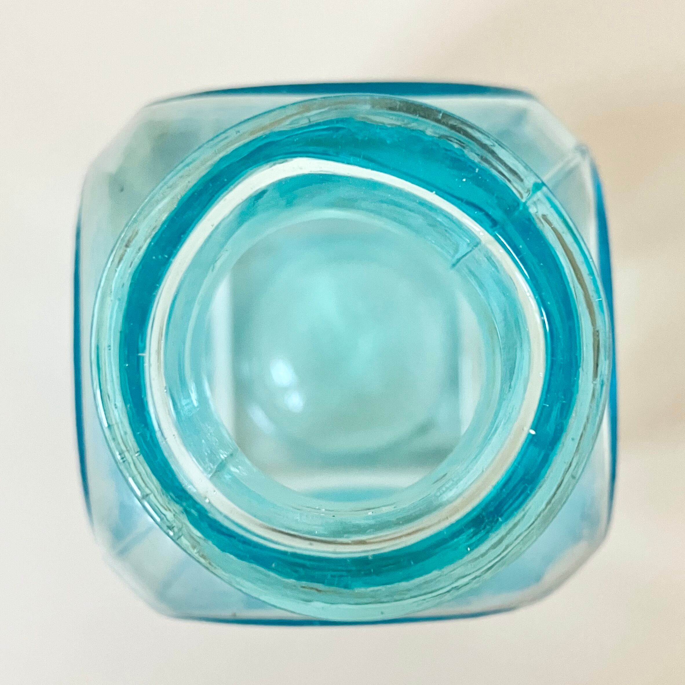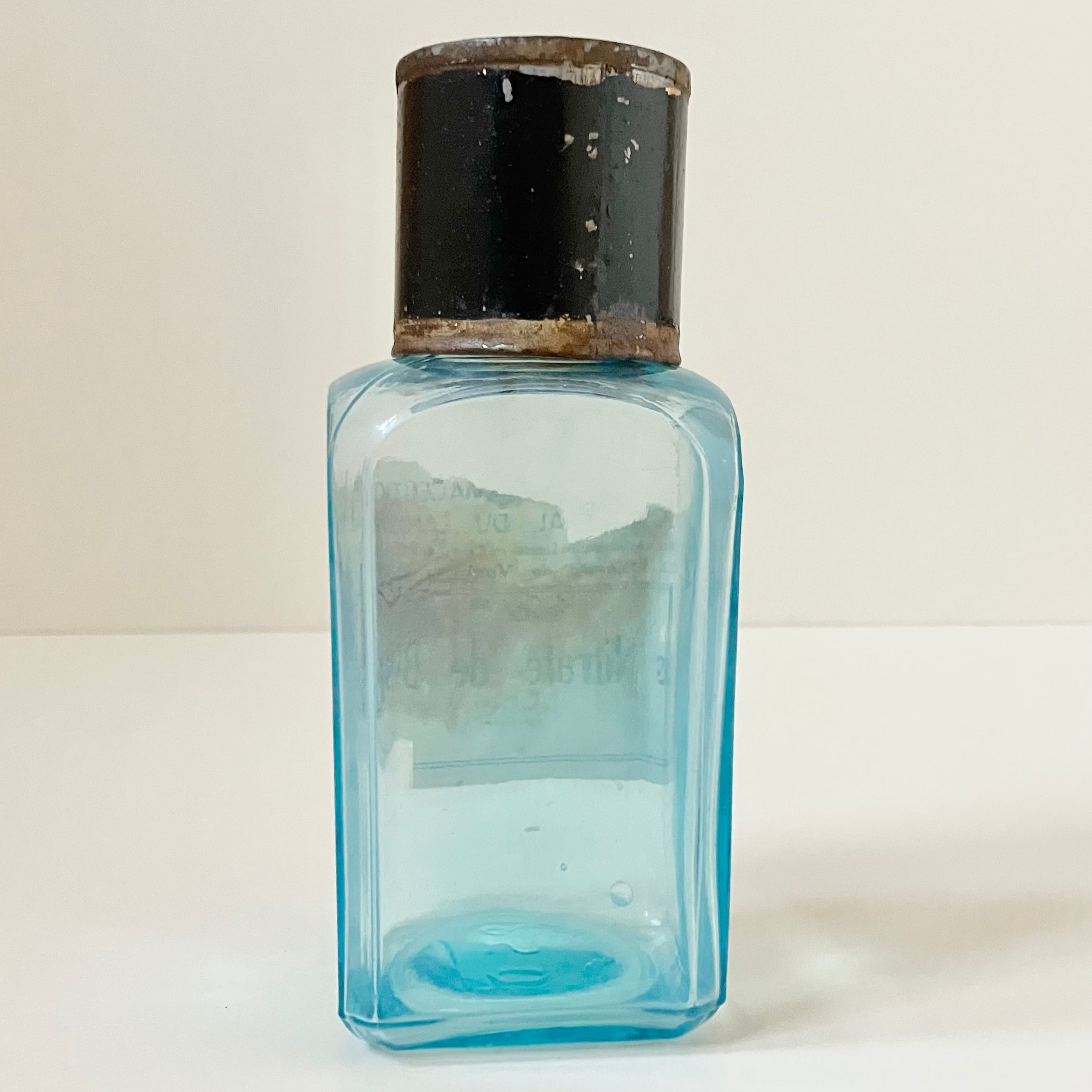 美しいクリアなブルーのガラスで、金属製の蓋カバーが付いています。