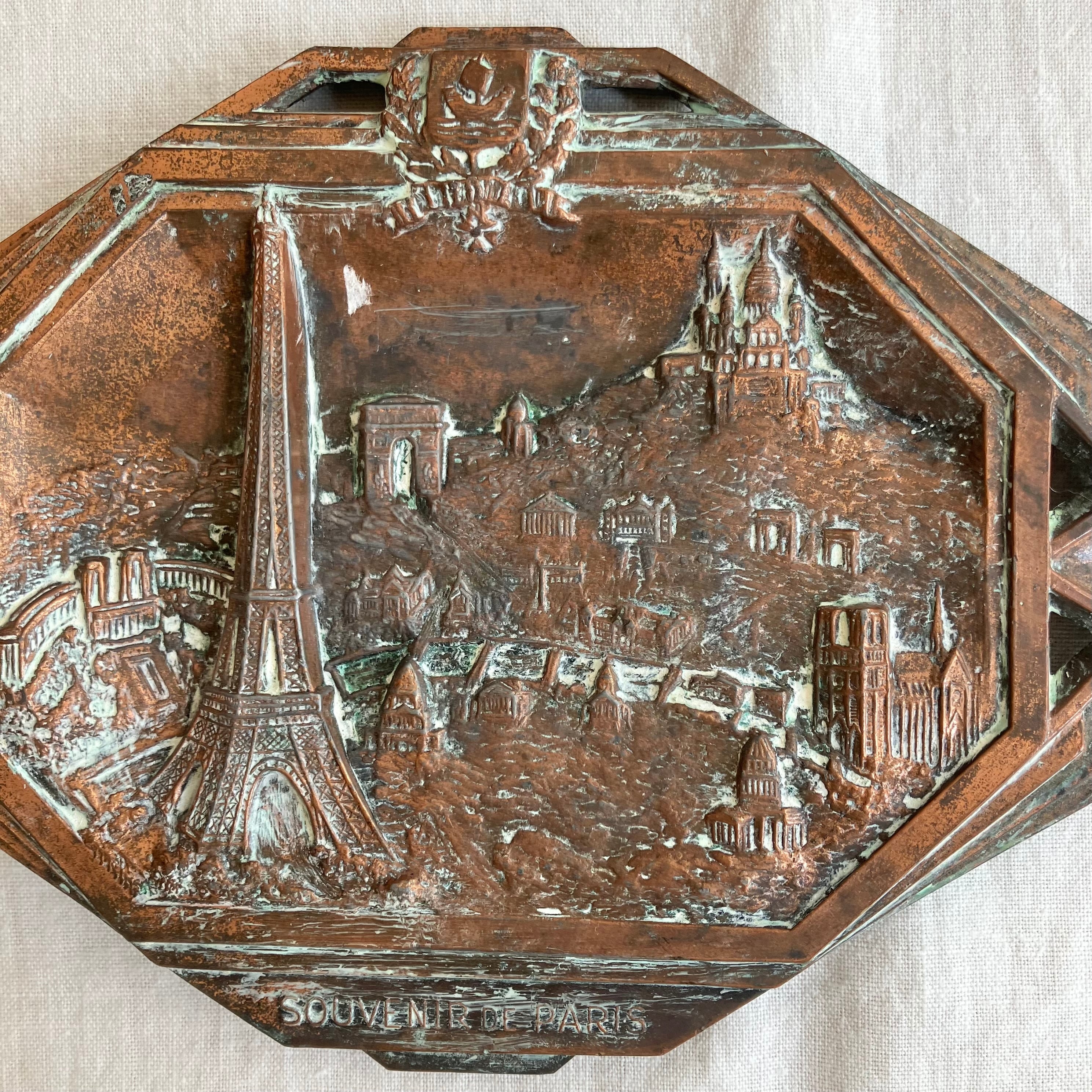 ブロンズ色のメタルプレートに、エッフェル塔に凱旋門、ノートルダム大聖堂。シャイヨー宮からサクレ・クール寺院まで、パリの名所がズラリと揃い踏みです。上部にはパリのCoat of Arms of Parisの紋章も。