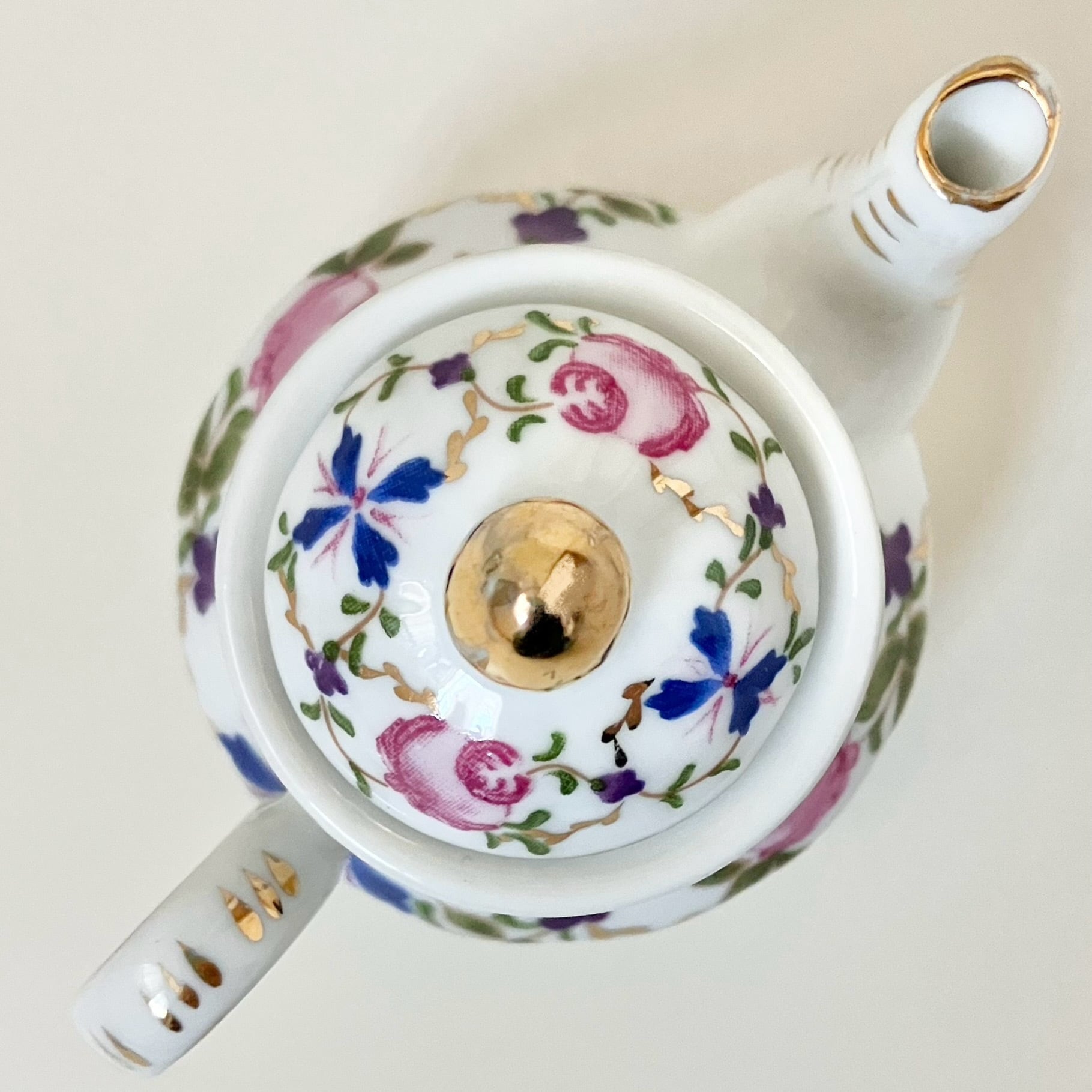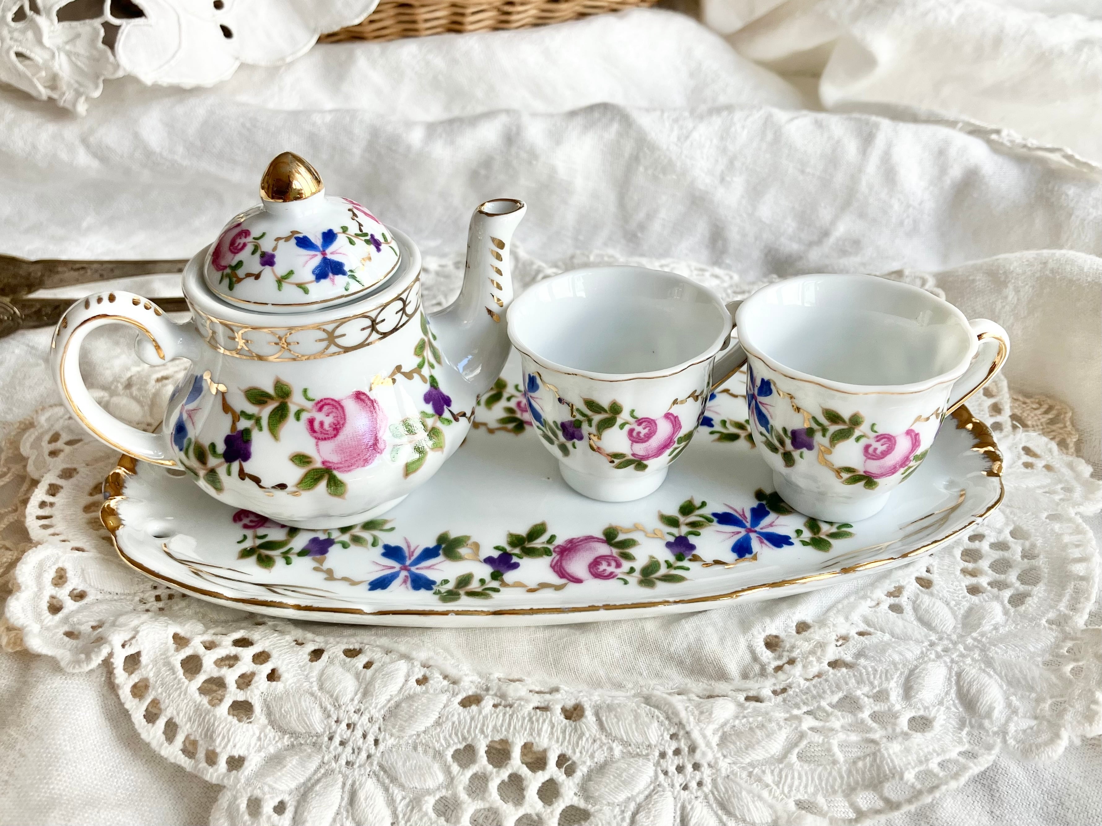 フレンチブロカント、ディネット/ミニチュアのティーポットとティーカップふたつ、オーバルトレイのセットです。
