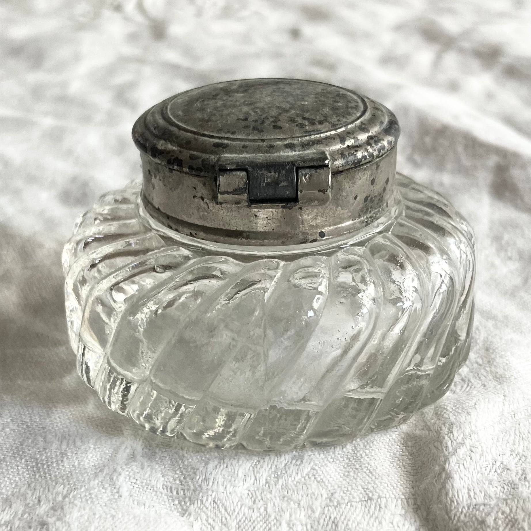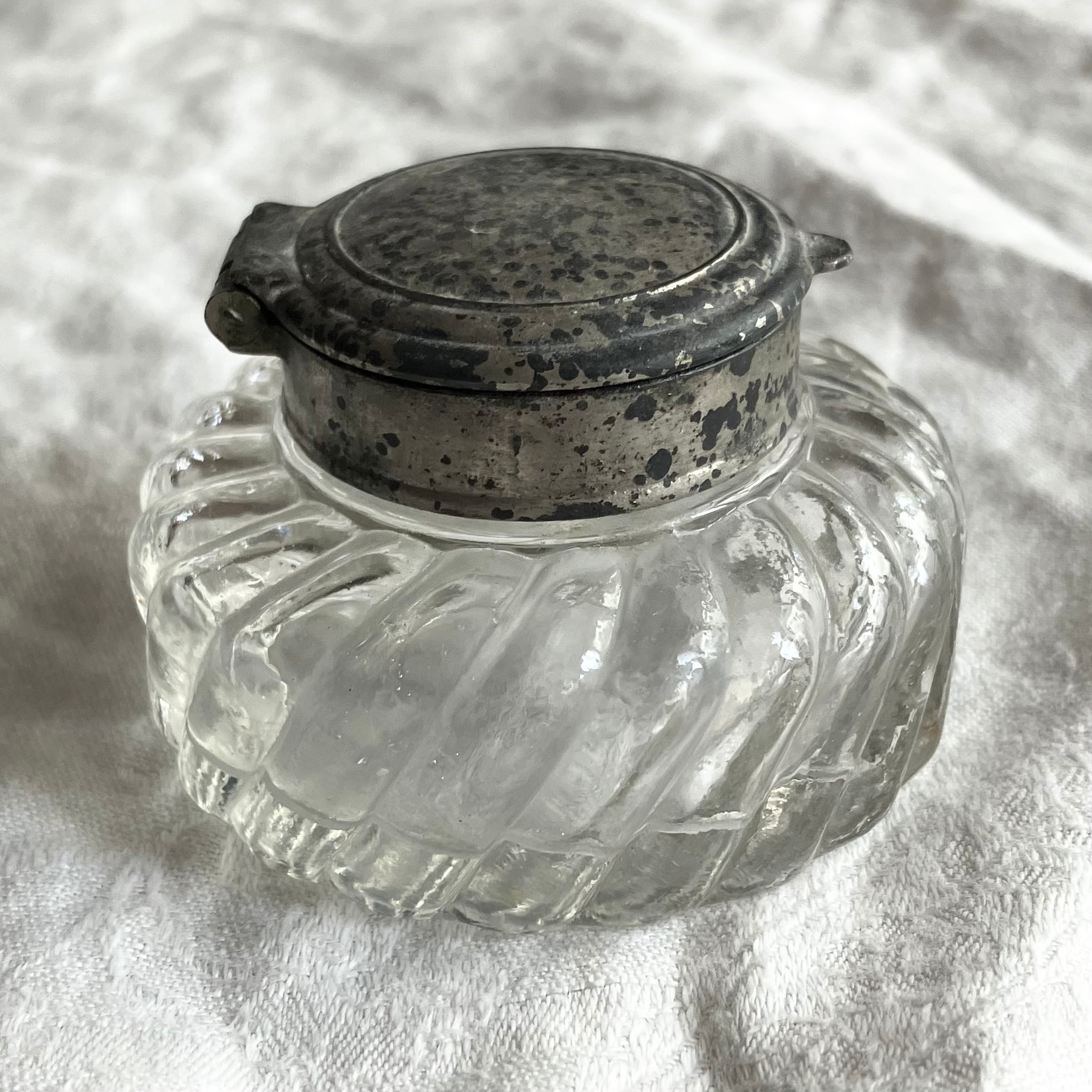 ガラス部分はプレスガラスで美しく波打つレリーフが施され、趣のある金属、おそらくエタンの蓋は開閉、取り外しが可能です。
