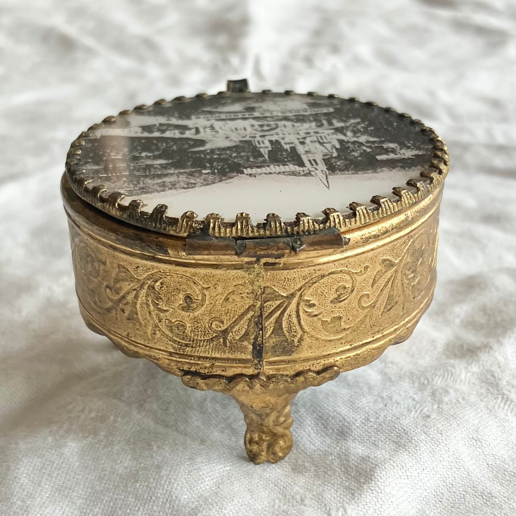 ガラス部分には聖地ルルドにある聖堂(Basilique)が美しいモノクロームで描かれ、脚付のオルモル部分には素晴らしいロカイユ装飾が施されています。