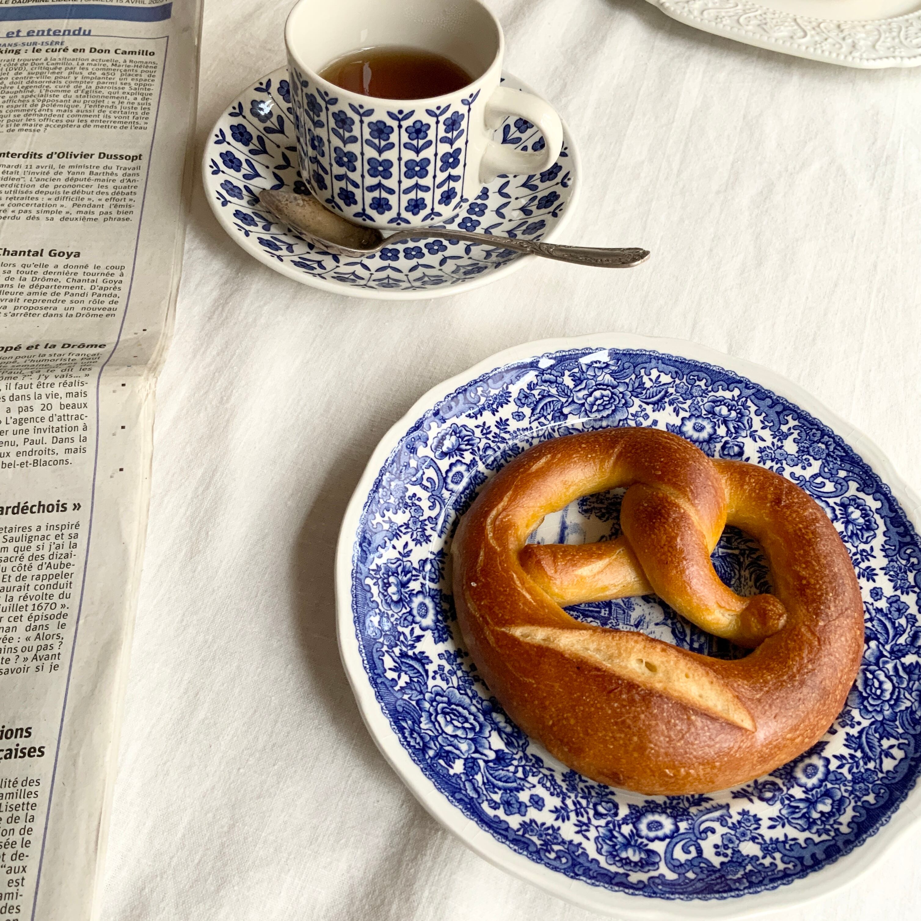 白地に深いブルーで楽しそうな村人の様子が描かれています。ダンスを踊るカップルや外でランチを楽しむカップルたち。手前のお肉を欲しがるワンコも可愛らしいです。