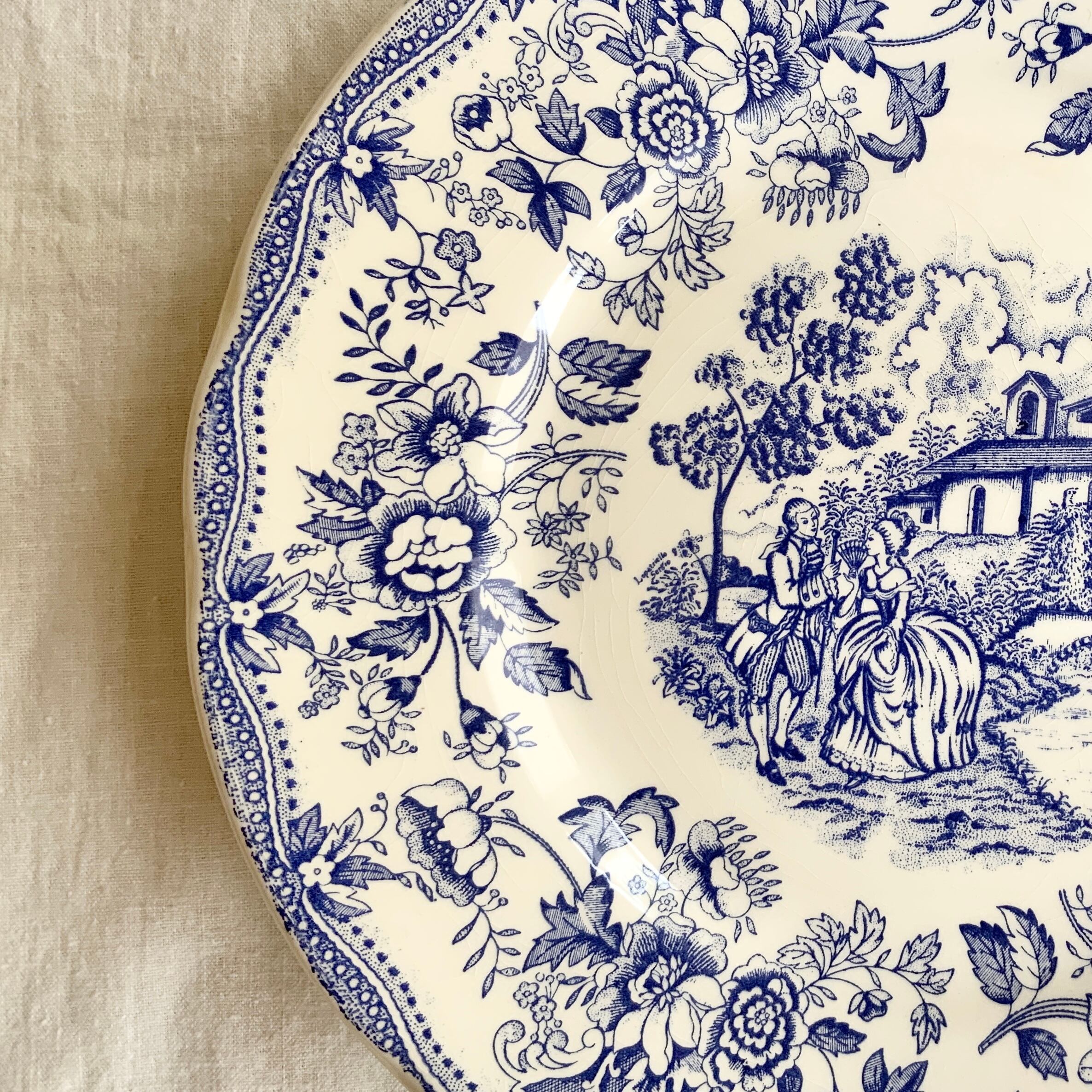 やさしい白地に美しいブルーで、お庭でお喋りをする恋人たちの様子が描かれています。縁にはたくさんのバラやパールのような素晴らしい装飾が施されています。