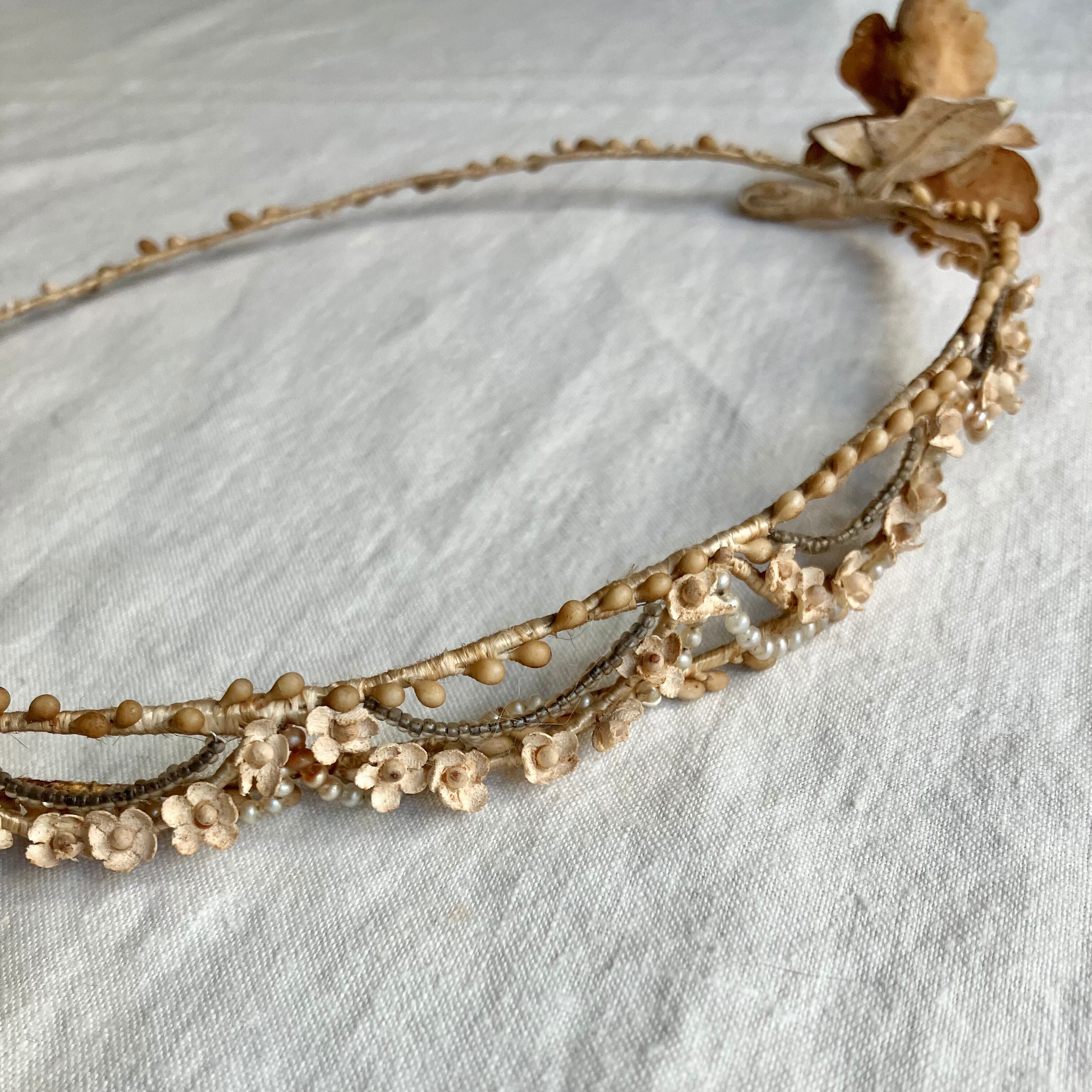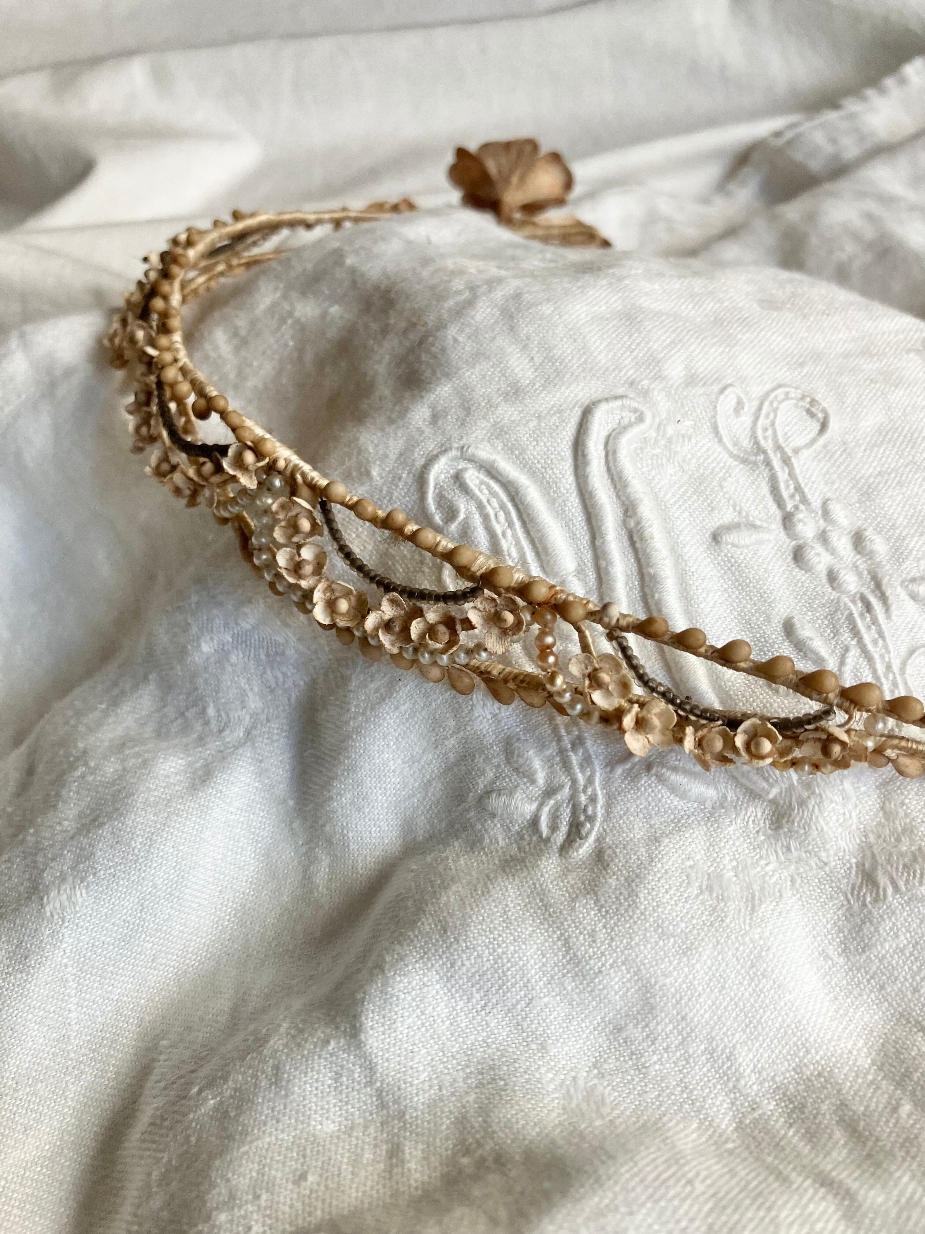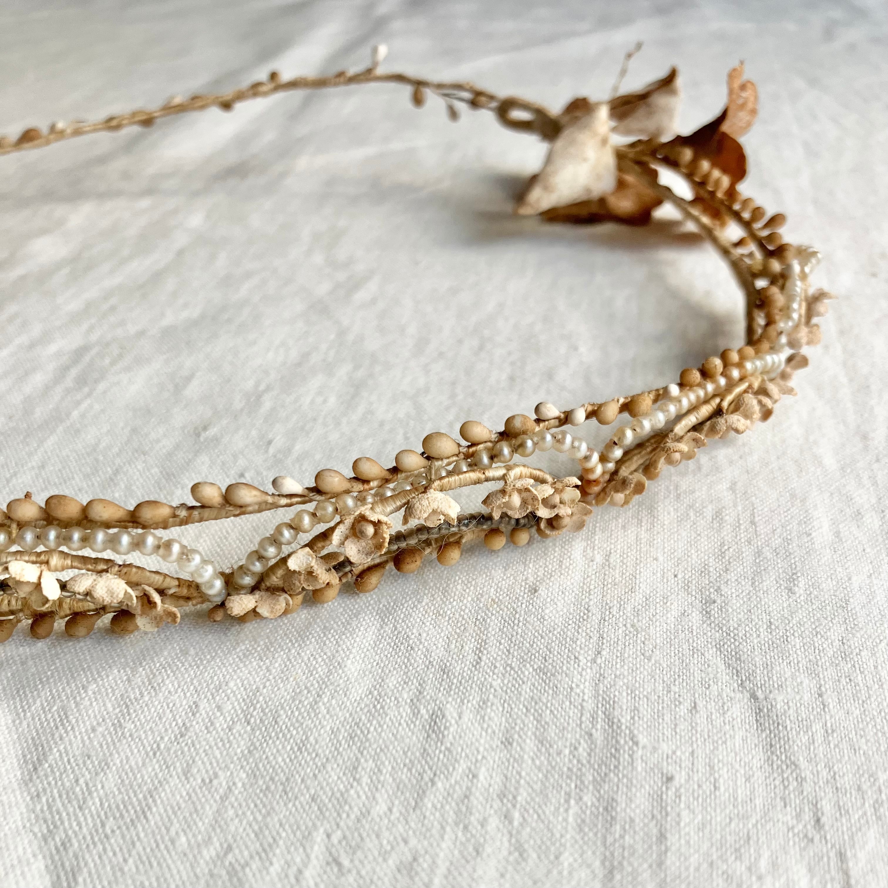 美しく朽ちたワックスフラワーと輝くチャーミングなパールビーズが対照的で、とても魅力的です。