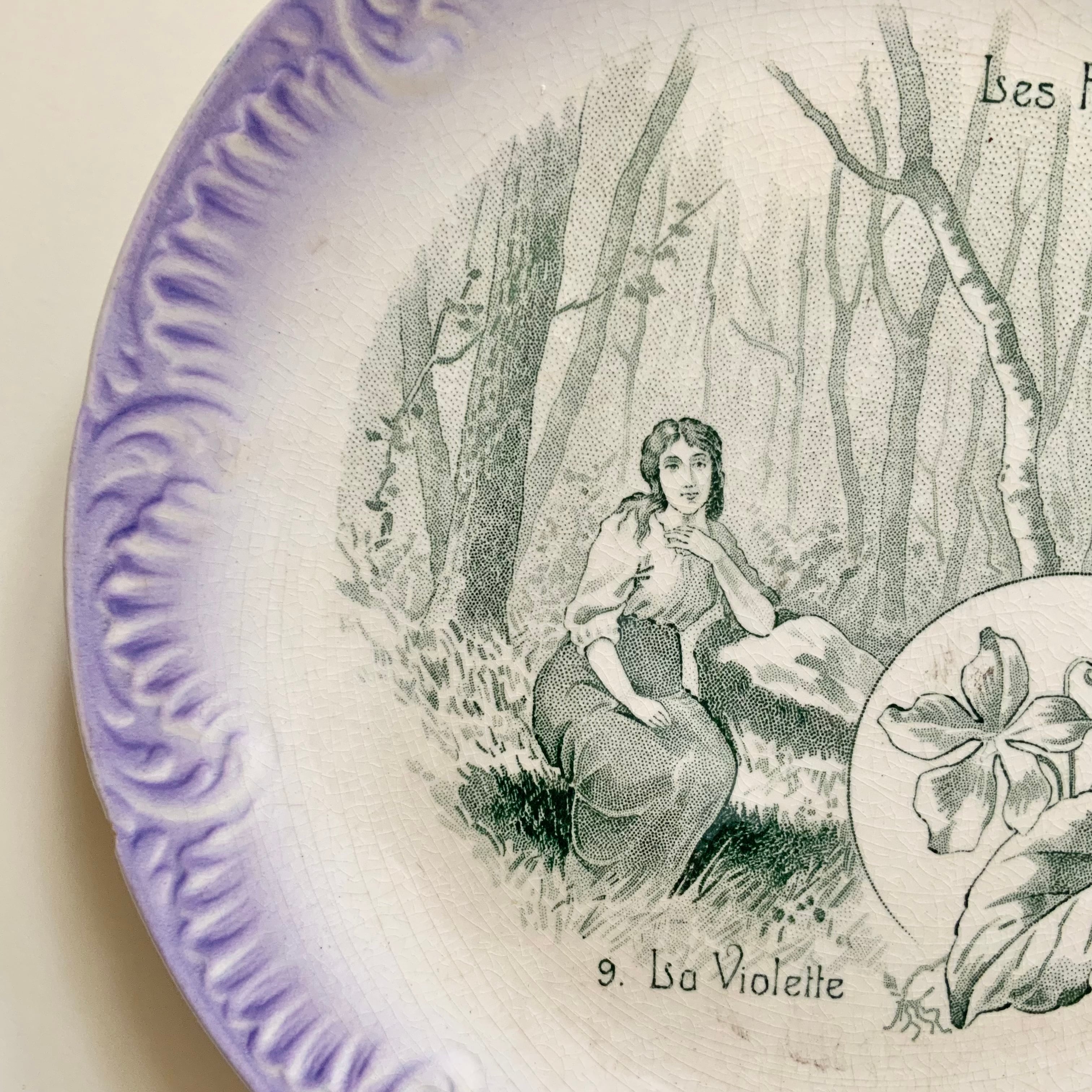 スミレの花とLa Violette、スミレの精霊でしょうか、森の中に腰掛ける美しい女性が描かれています。