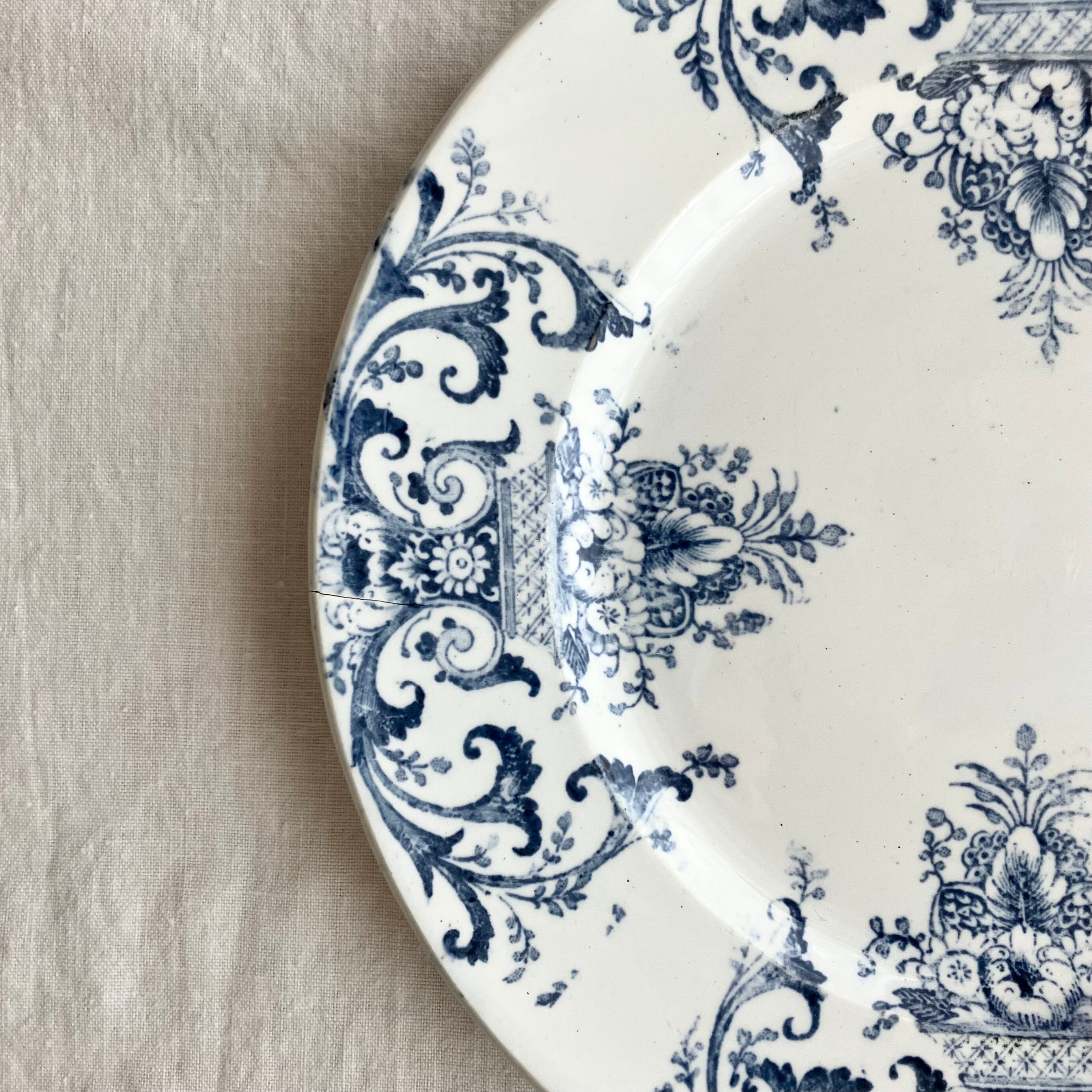 深みのあるブルーでロカイユと、ボタニカルの装飾がプレートを覆うように美しく描かれています。