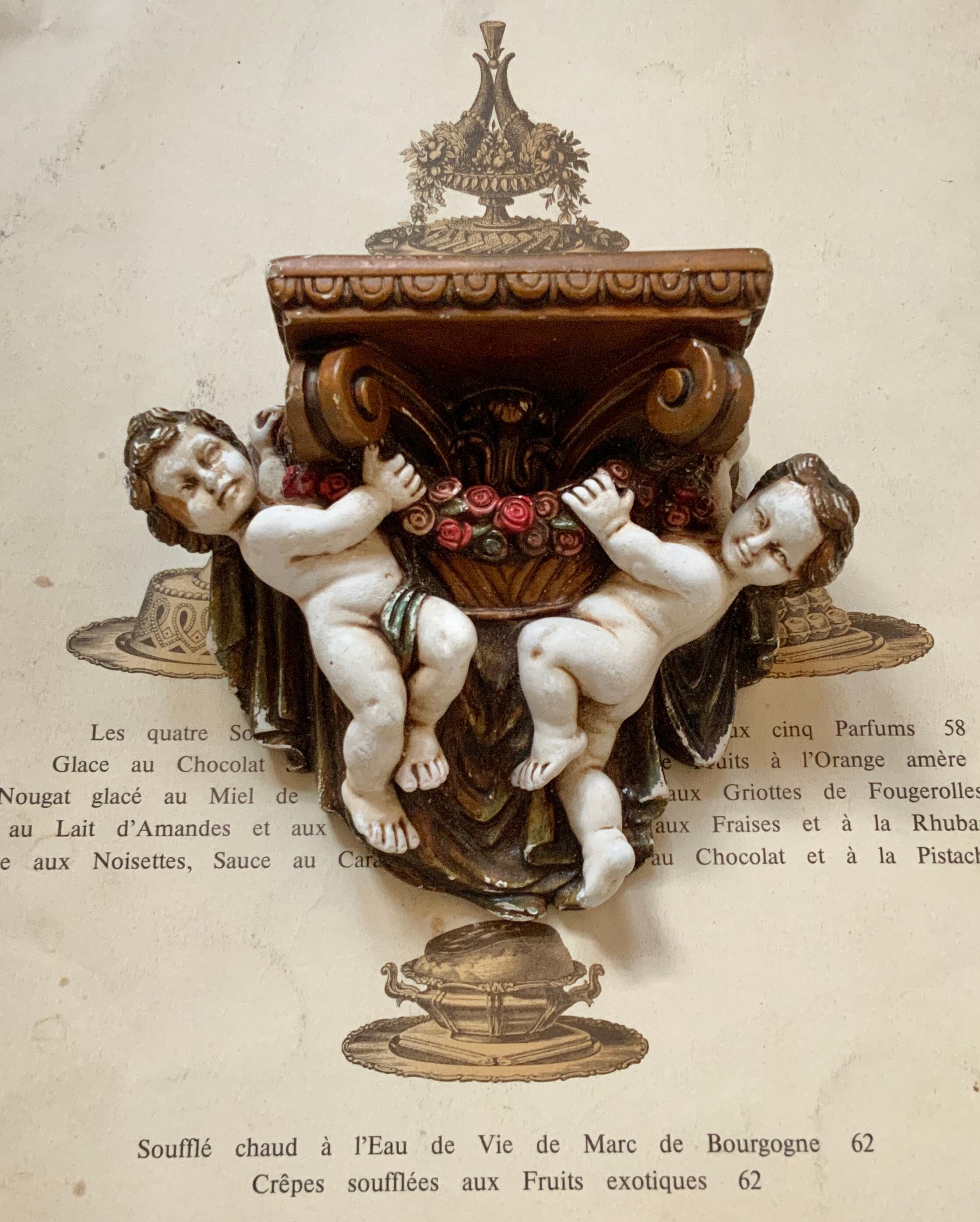 天使二人がシェルフを下から支えているモチーフで、真ん中にはバラのガーランドがあしらわれています。