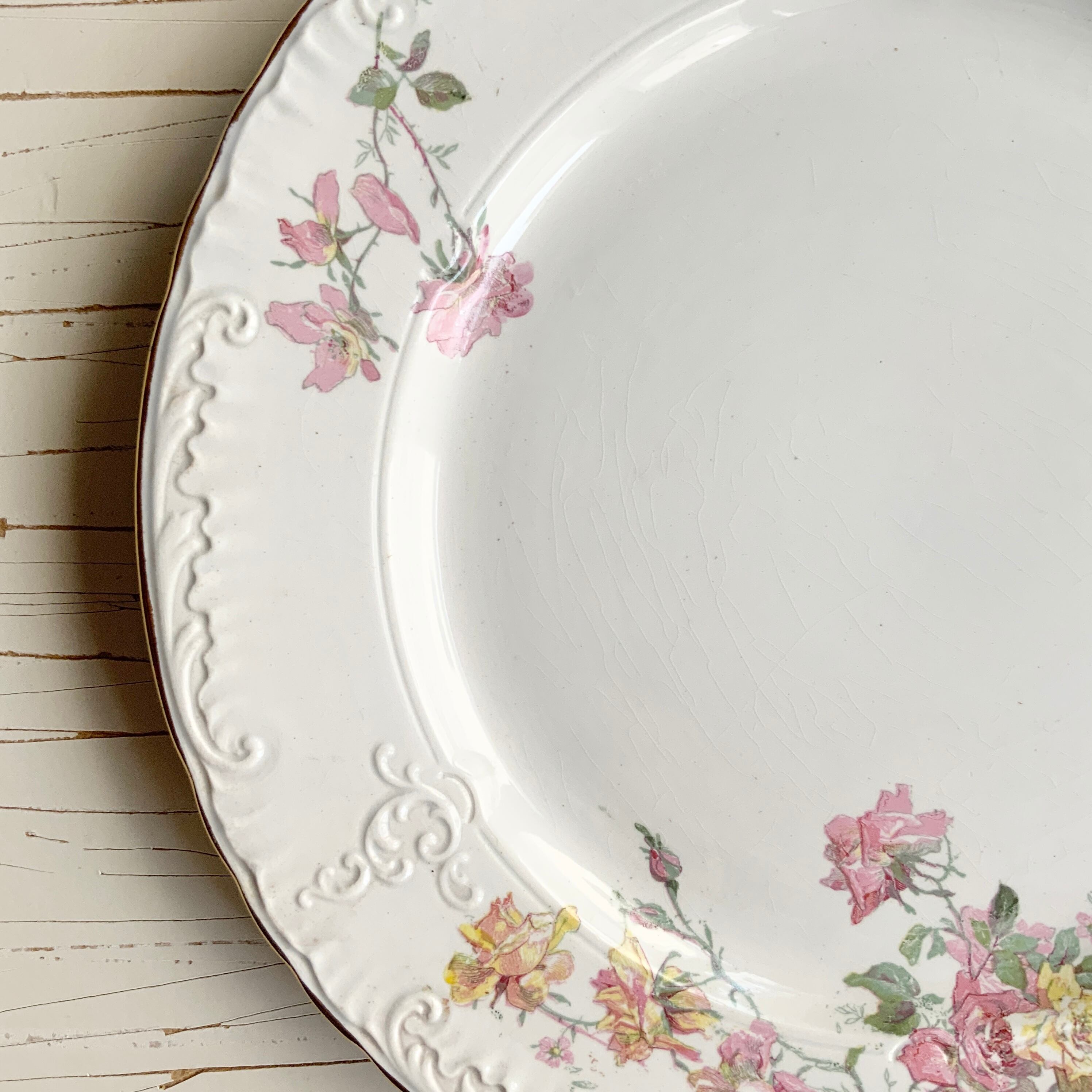ピンクとイエローの愛らしいミニバラがぐるりとプレートを囲むように描かれ、