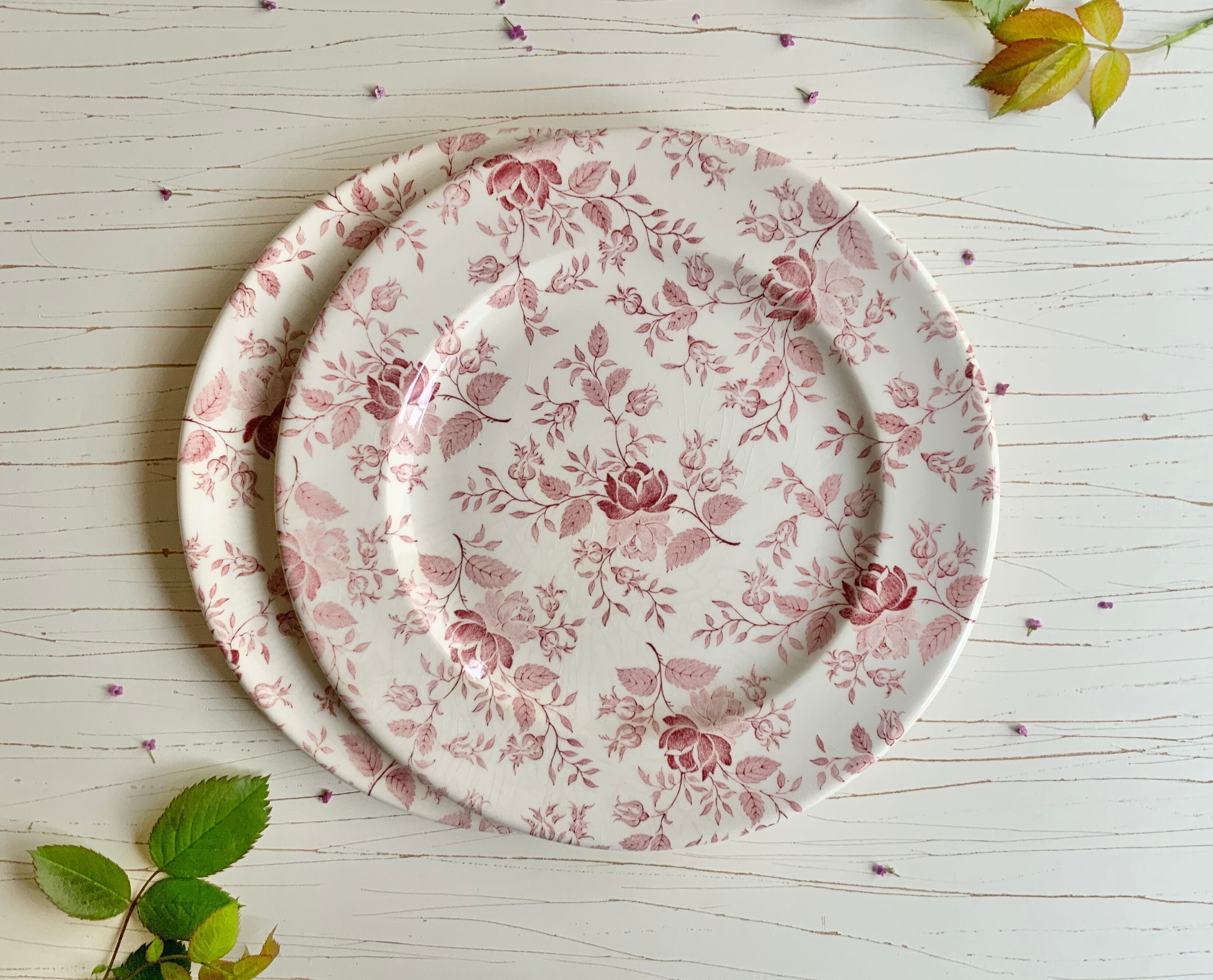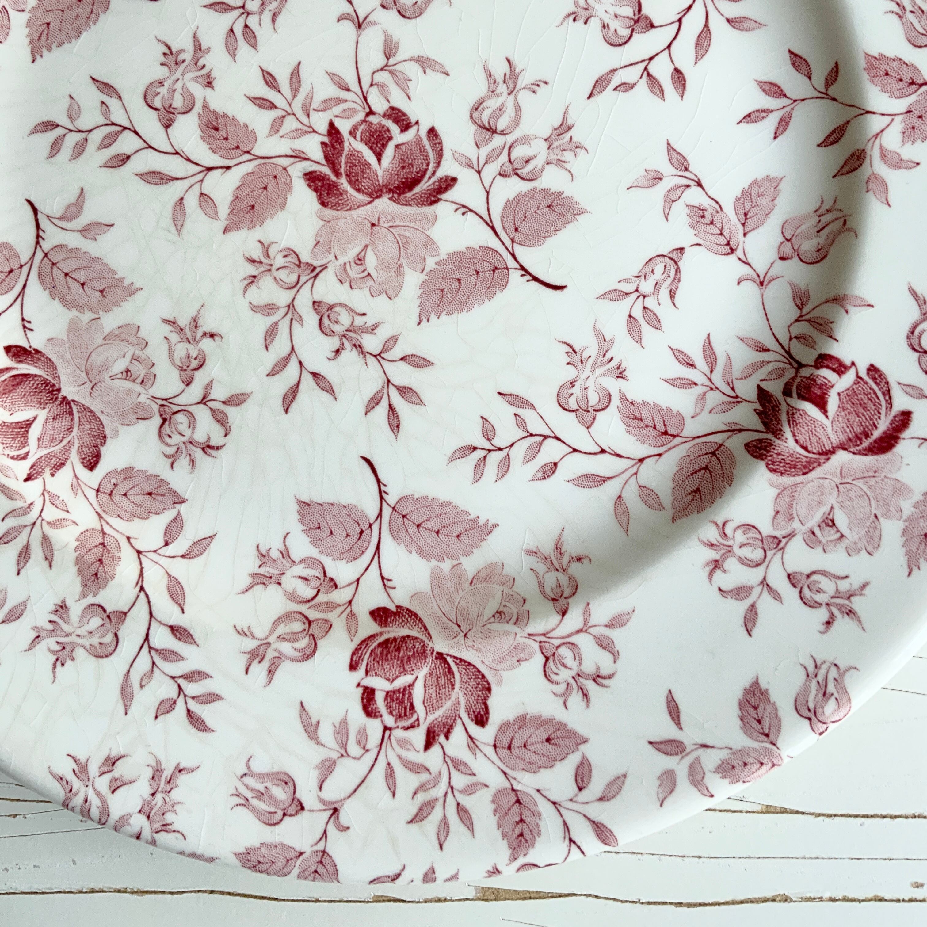 深いピンク色でたくさんのバラの花や蕾や葉っぱが、プレート全体に散りばめられています。