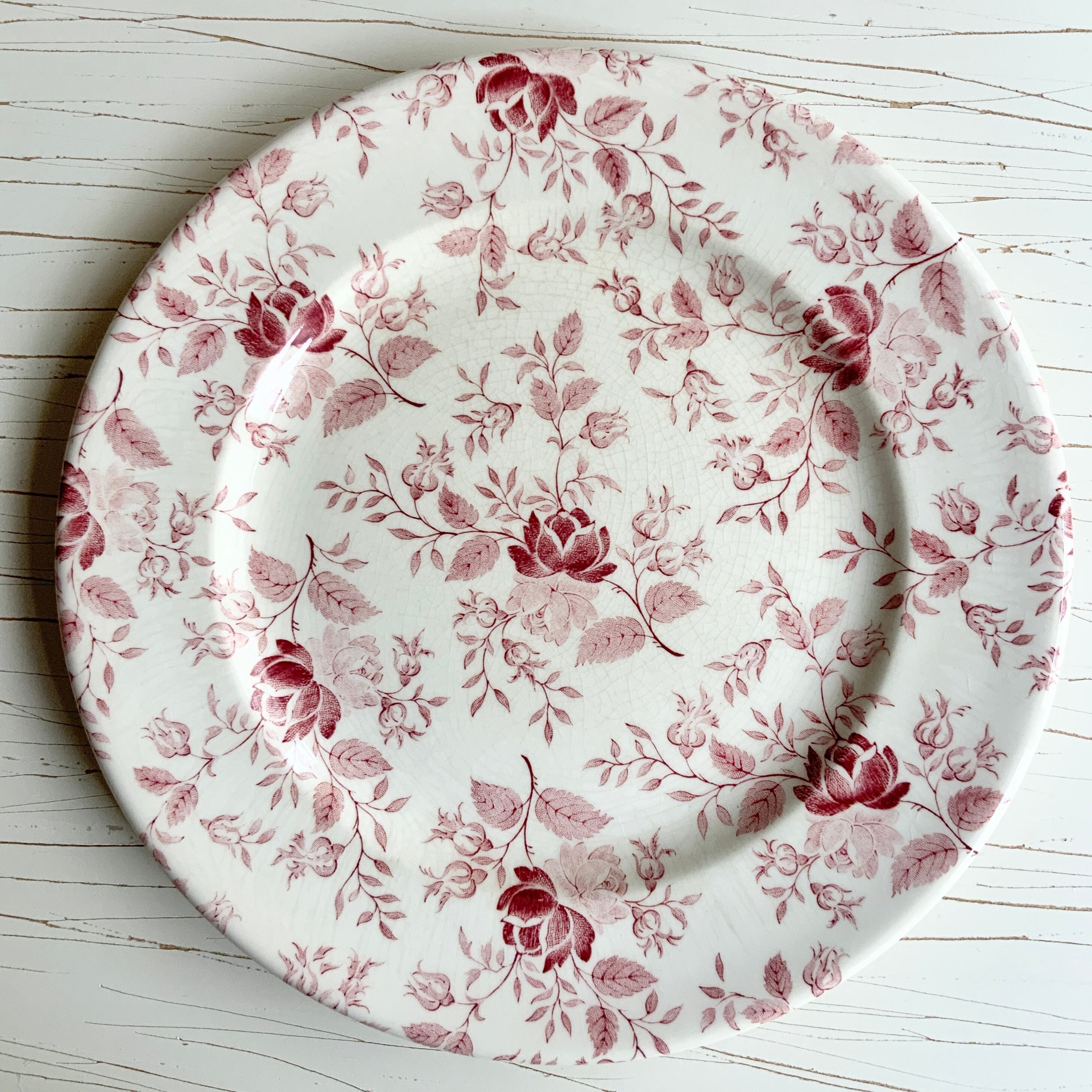 深いピンク色でたくさんのバラの花や蕾や葉っぱが、プレート全体に散りばめられています。