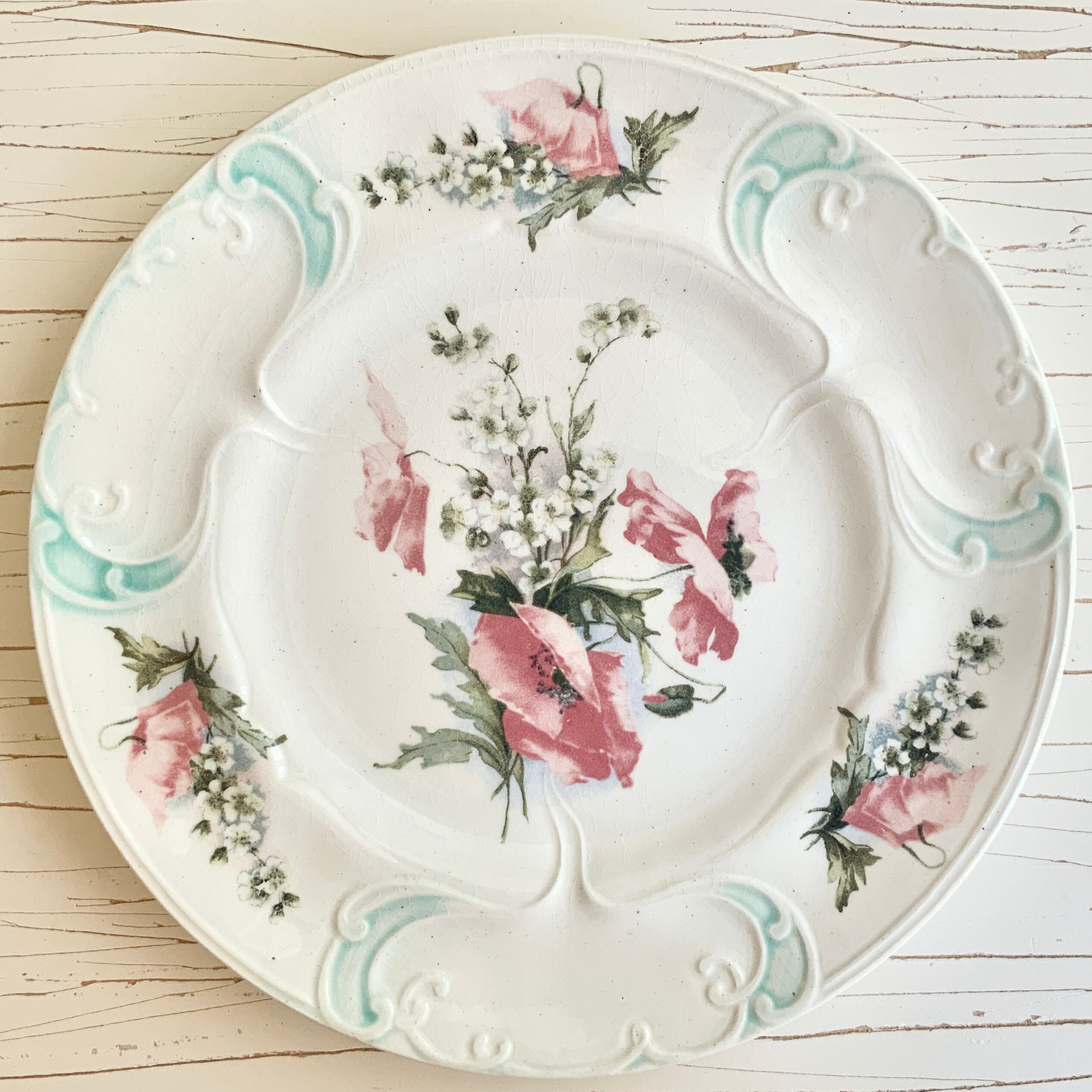 縁には美しいロカイユ装飾と薄い鮮やかなブルー、中央とロカイユの間には、ポピーと小さく愛らしい白い花が描かれています。